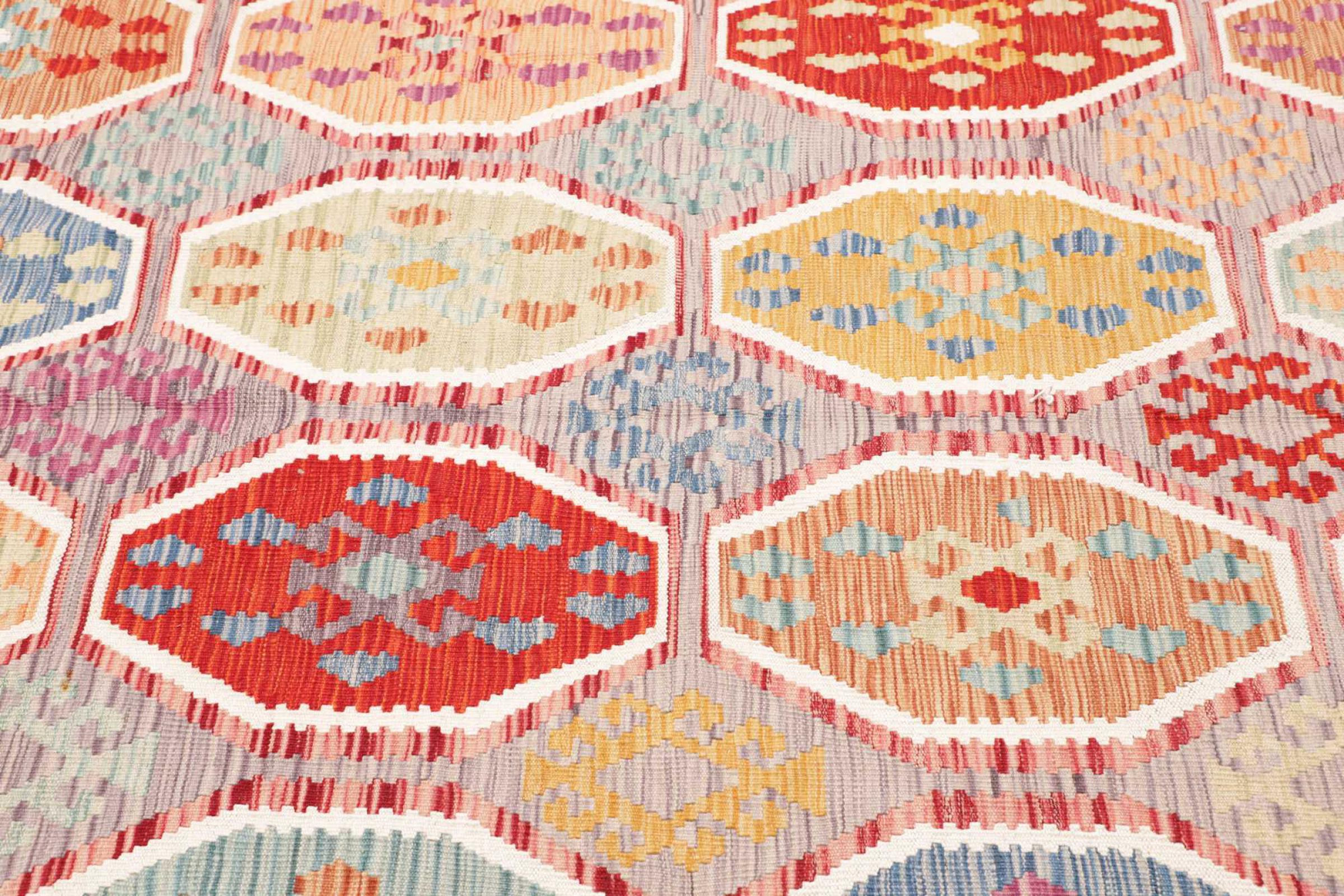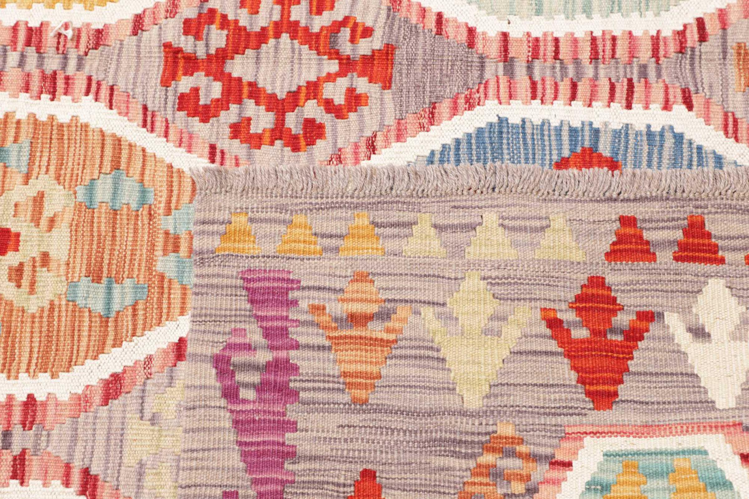 This rug was made as a flat weave by hand on a loom. Flatweave is the term used to describe rugs that have no pile. As the name promises, these rugs are woven and not knotted. This results in a flat rug with a structured surface. Flatweaves are not as soft and usually thinner than knotted rugs. At the same time they are much less complex to manufacture and can usually be laid out from both sides (front and back). Their patterns are usually geometric, which is determined by the fabric.