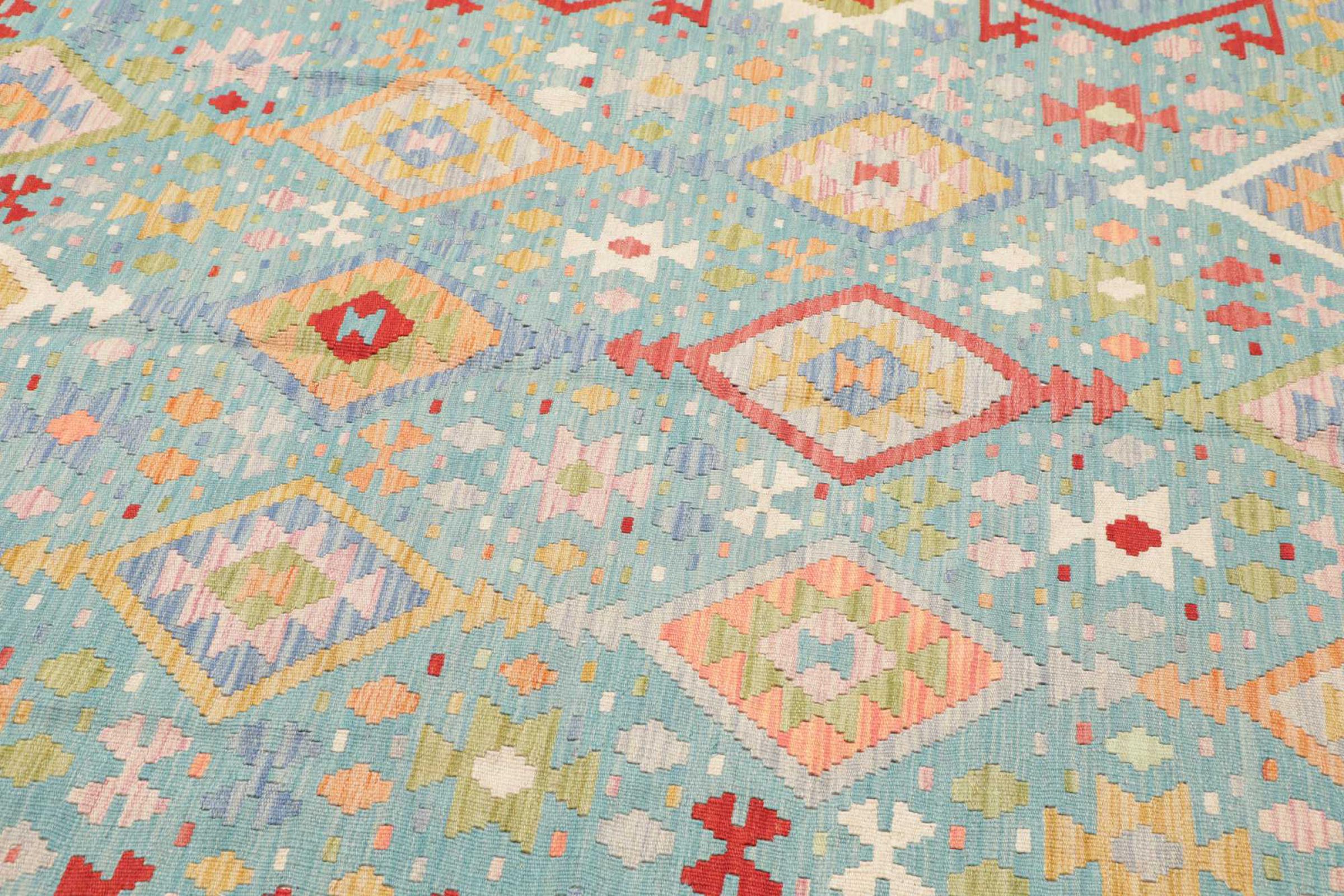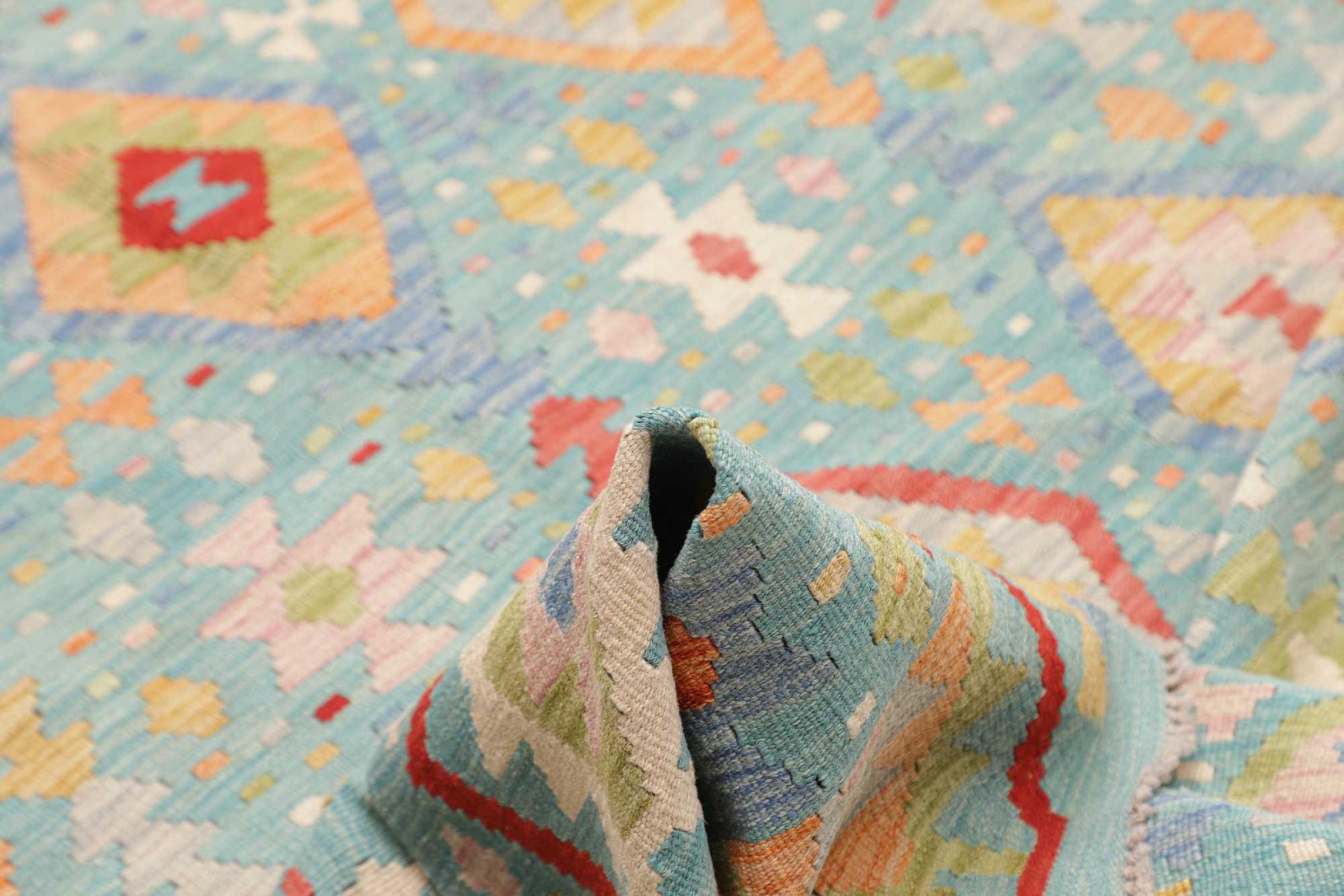 This rug was made as a flat weave by hand on a loom. Flatweave is the term used to describe rugs that have no pile. As the name promises, these rugs are woven and not knotted. This results in a flat rug with a structured surface. Flatweaves are not as soft and usually thinner than knotted rugs. At the same time they are much less complex to manufacture and can usually be laid out from both sides (front and back). Their patterns are usually geometric, which is determined by the fabric.