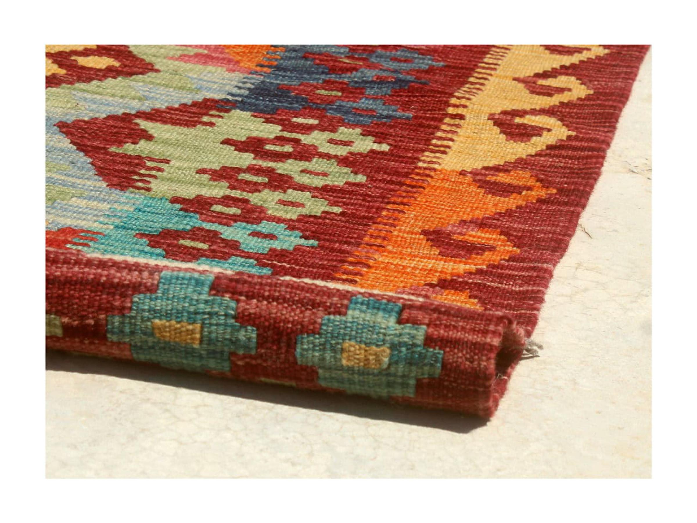 This rug was made as a flat weave by hand on a loom. Flatweave is the term used to describe rugs that have no pile. As the name promises, these rugs are woven and not knotted. This results in a flat rug with a structured surface. Flatweaves are not as soft and usually thinner than knotted rugs. At the same time they are much less complex to manufacture and can usually be laid out from both sides (front and back). Their patterns are usually geometric, which is determined by the fabric.