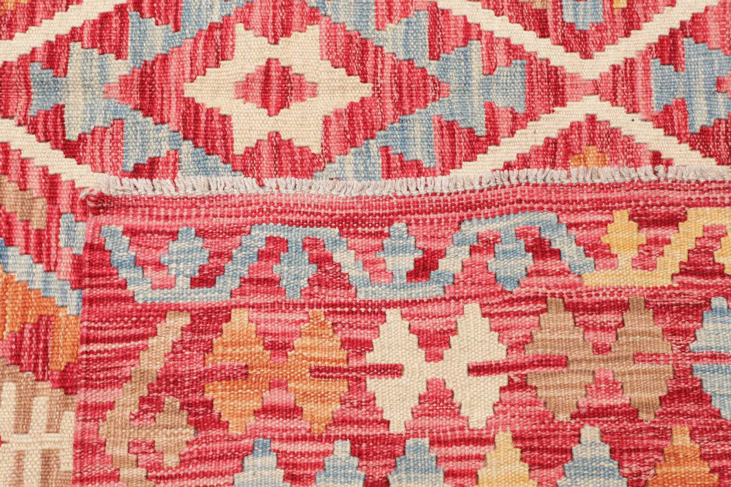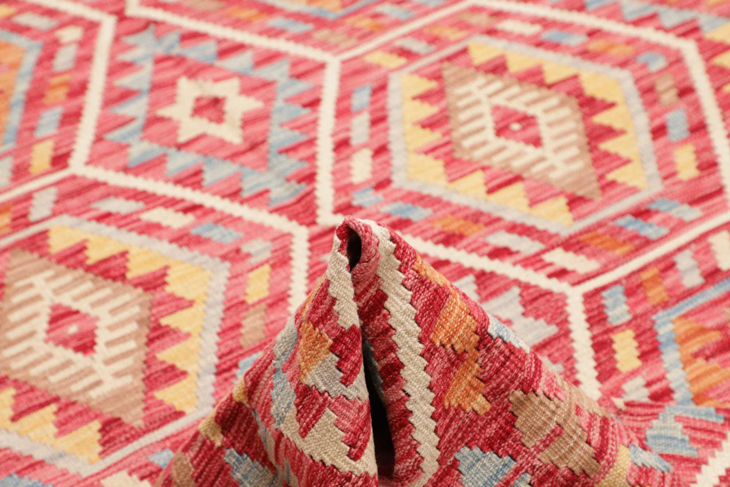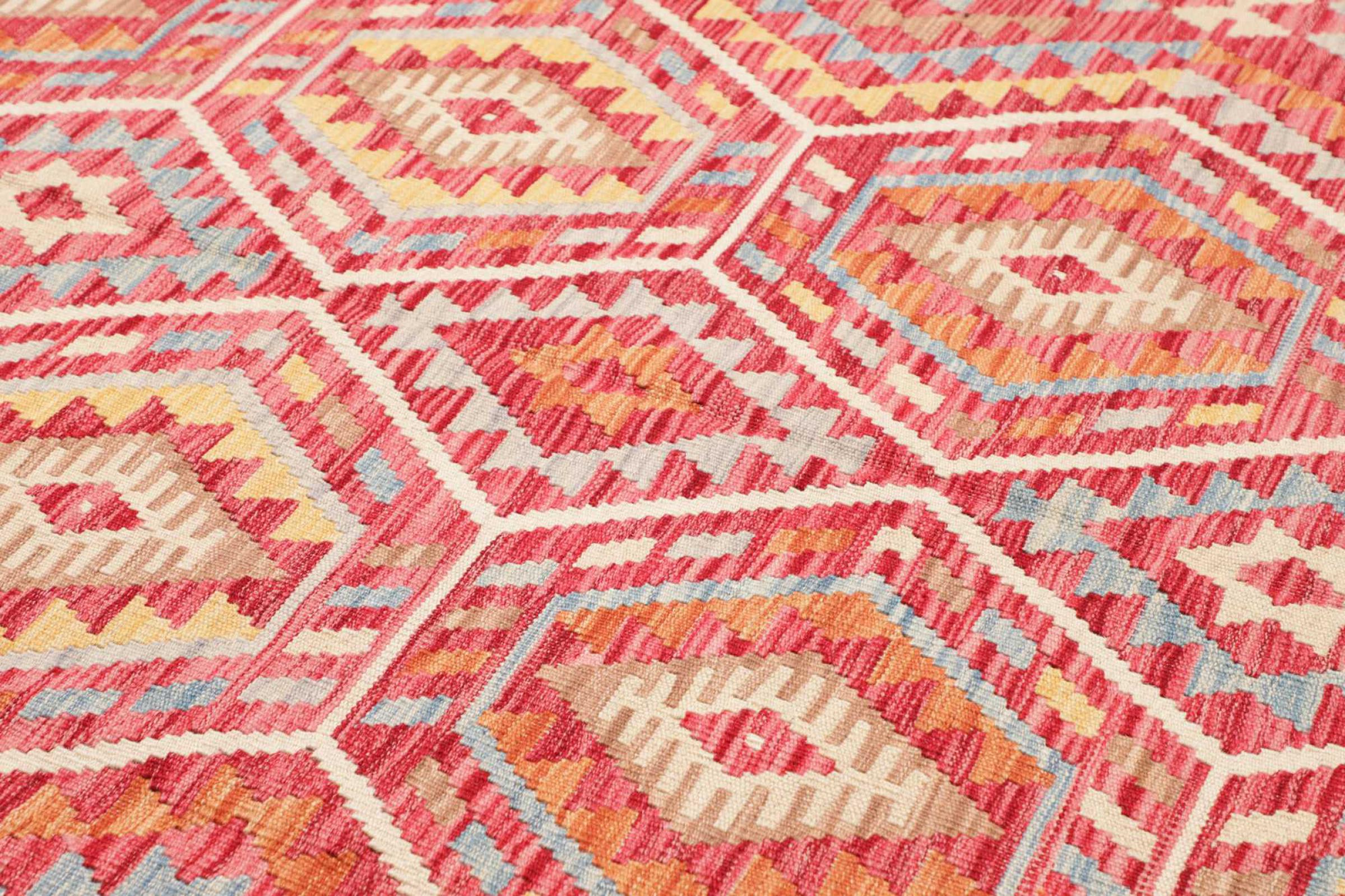 This rug was made as a flat weave by hand on a loom. Flatweave is the term used to describe rugs that have no pile. As the name promises, these rugs are woven and not knotted. This results in a flat rug with a structured surface. Flatweaves are not as soft and usually thinner than knotted rugs. At the same time they are much less complex to manufacture and can usually be laid out from both sides (front and back). Their patterns are usually geometric, which is determined by the fabric.