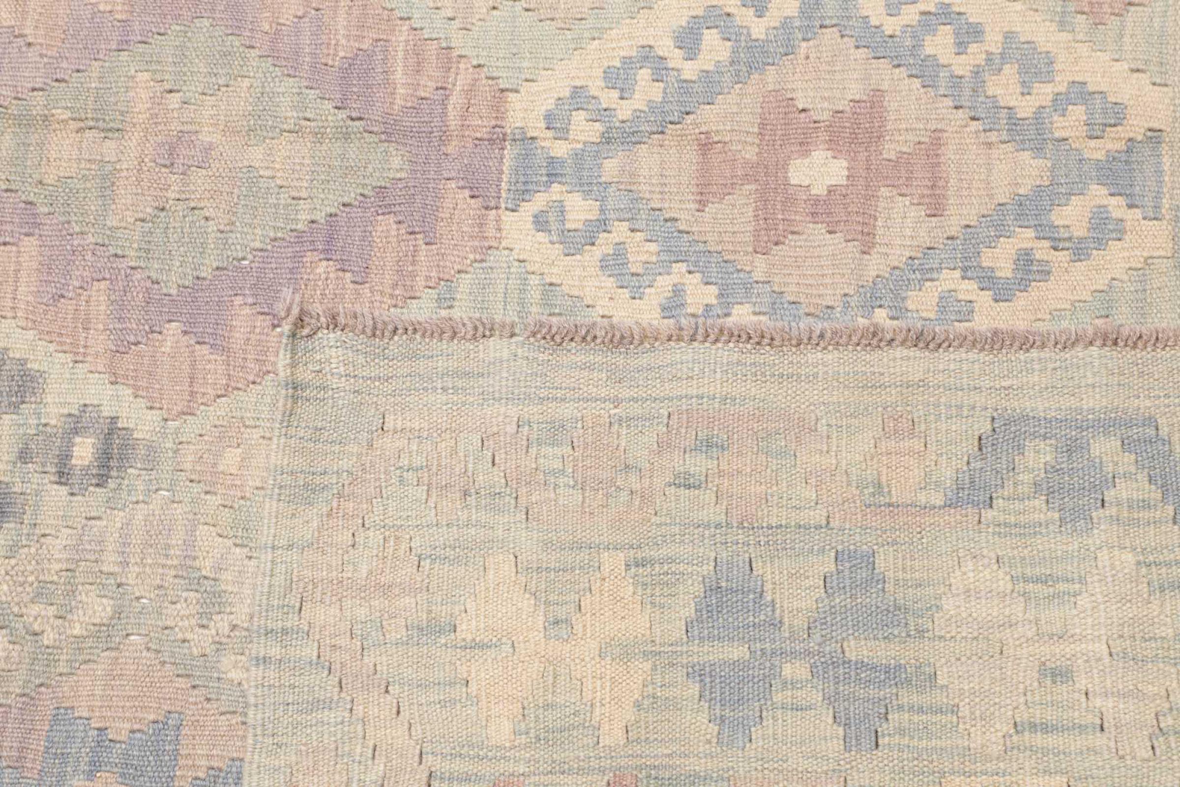 This rug was made as a flat weave by hand on a loom. Flatweave is the term used to describe rugs that have no pile. As the name promises, these rugs are woven and not knotted. This results in a flat rug with a structured surface. Flatweaves are not as soft and usually thinner than knotted rugs. At the same time they are much less complex to manufacture and can usually be laid out from both sides (front and back). Their patterns are usually geometric, which is determined by the fabric.