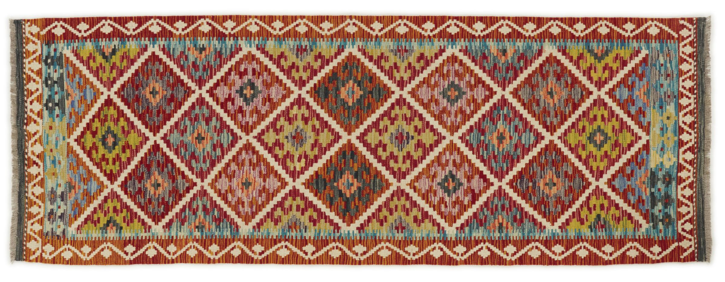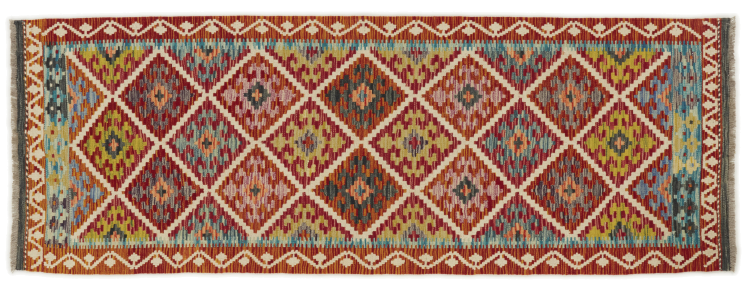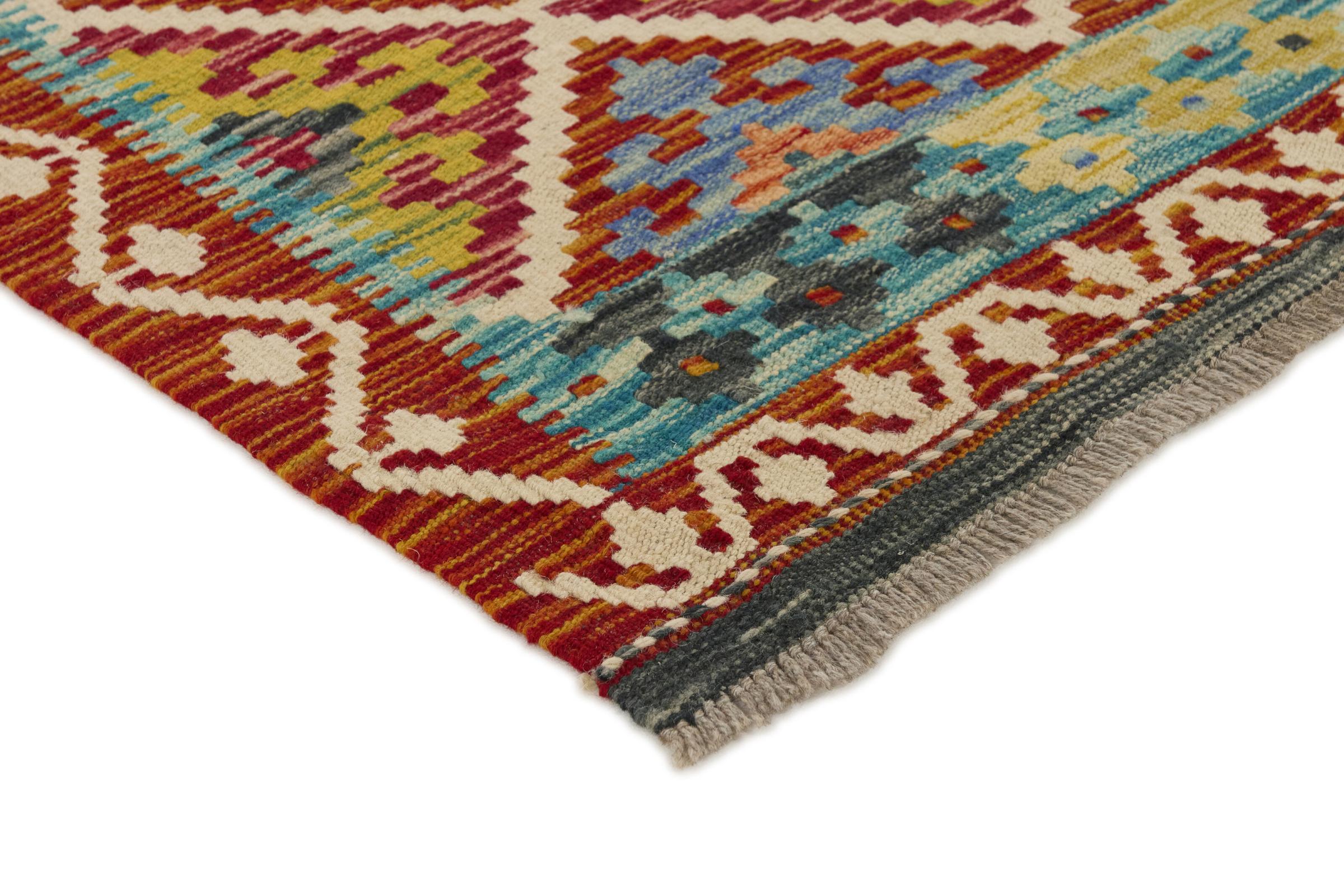 This handwoven Kilim Afghan is a wonderful and unique piece of art. Hard to believe that these modern colours and patterns have already been used centuries ago. This carpet has been woven by hand in old tradition in Afghanistan. It delivers a portion of contemporary history, which you won't find in this specific design a second time. It consists of high-grade natural wool and gives your home a personalised touch.