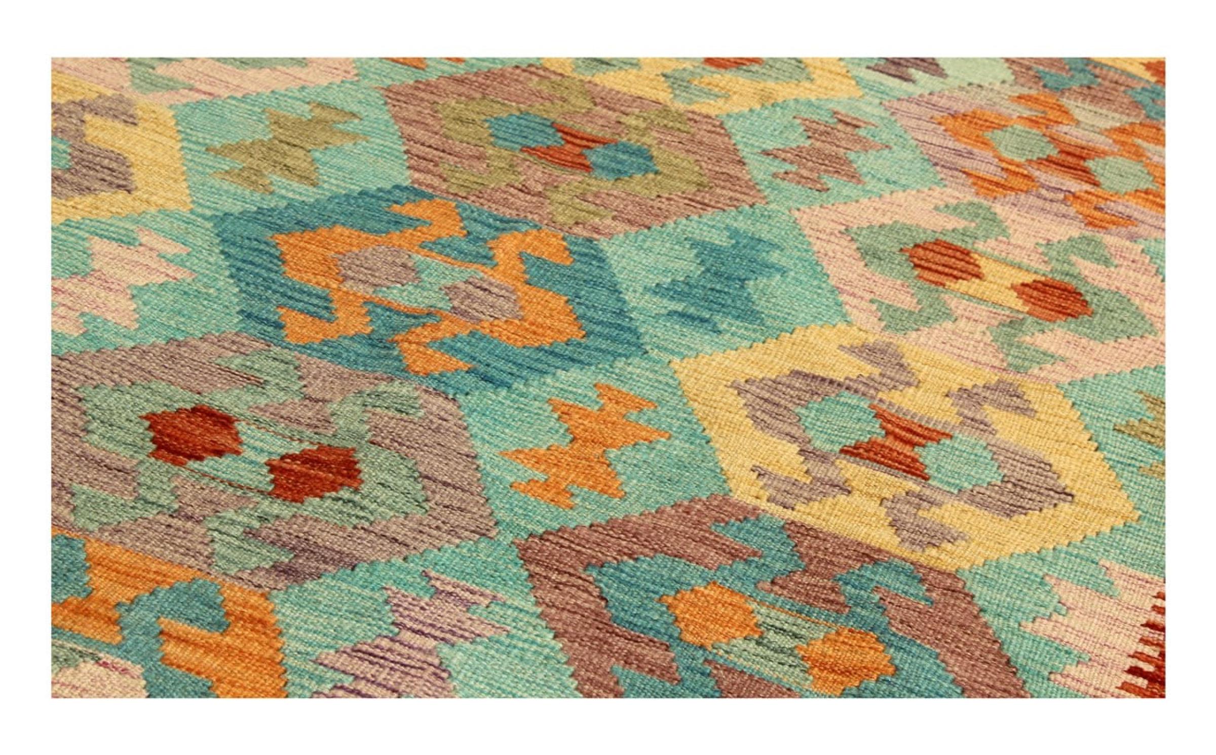This rug was made as a flat weave by hand on a loom. Flatweave is the term used to describe rugs that have no pile. As the name promises, these rugs are woven and not knotted. This results in a flat rug with a structured surface. Flatweaves are not as soft and usually thinner than knotted rugs. At the same time they are much less complex to manufacture and can usually be laid out from both sides (front and back). Their patterns are usually geometric, which is determined by the fabric.