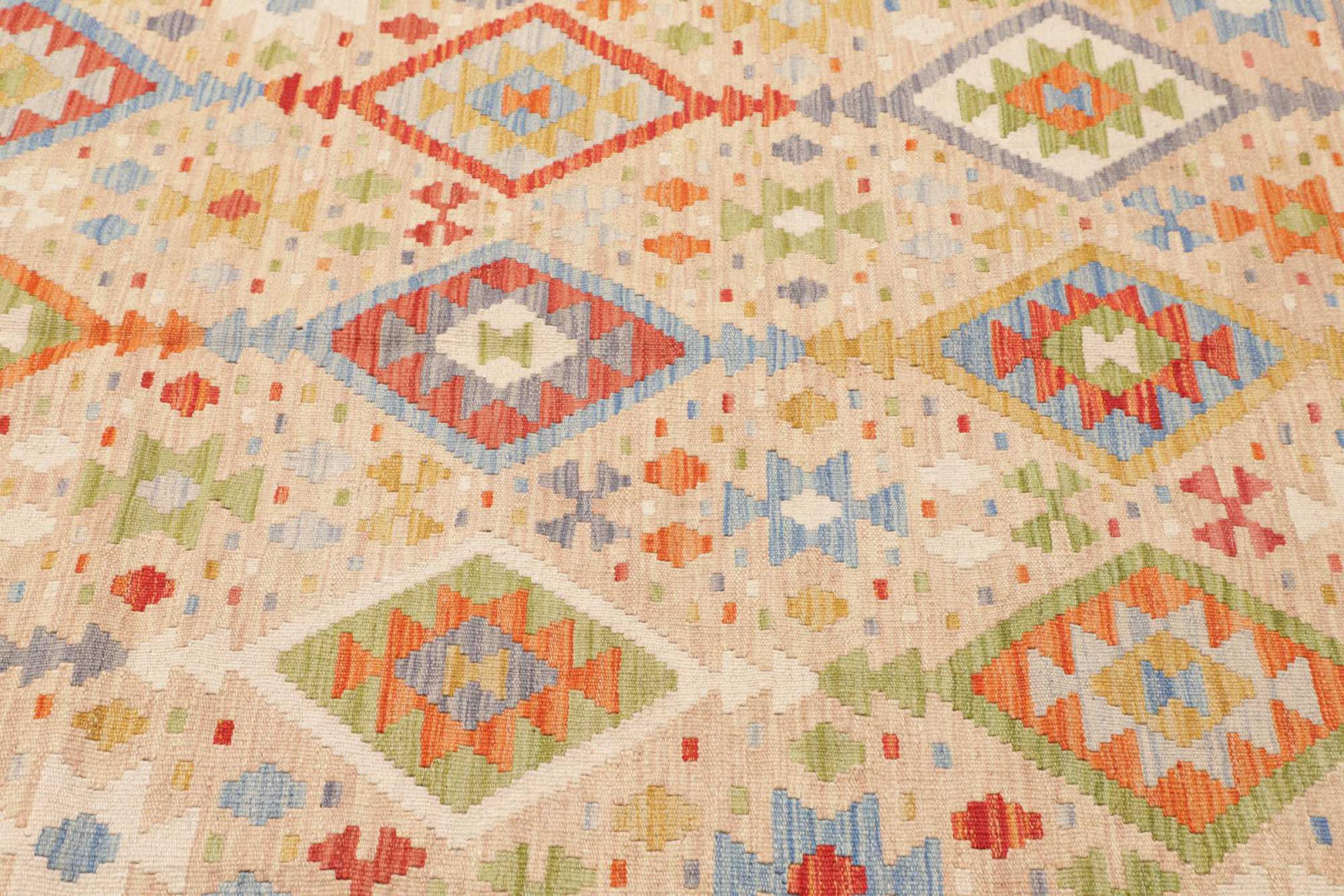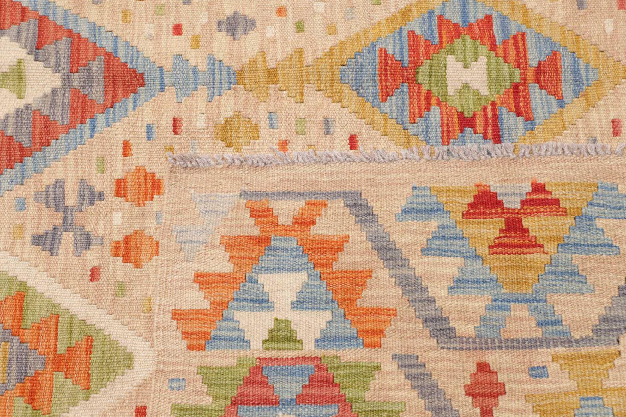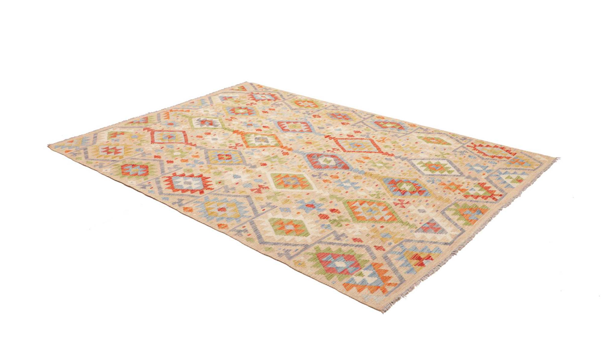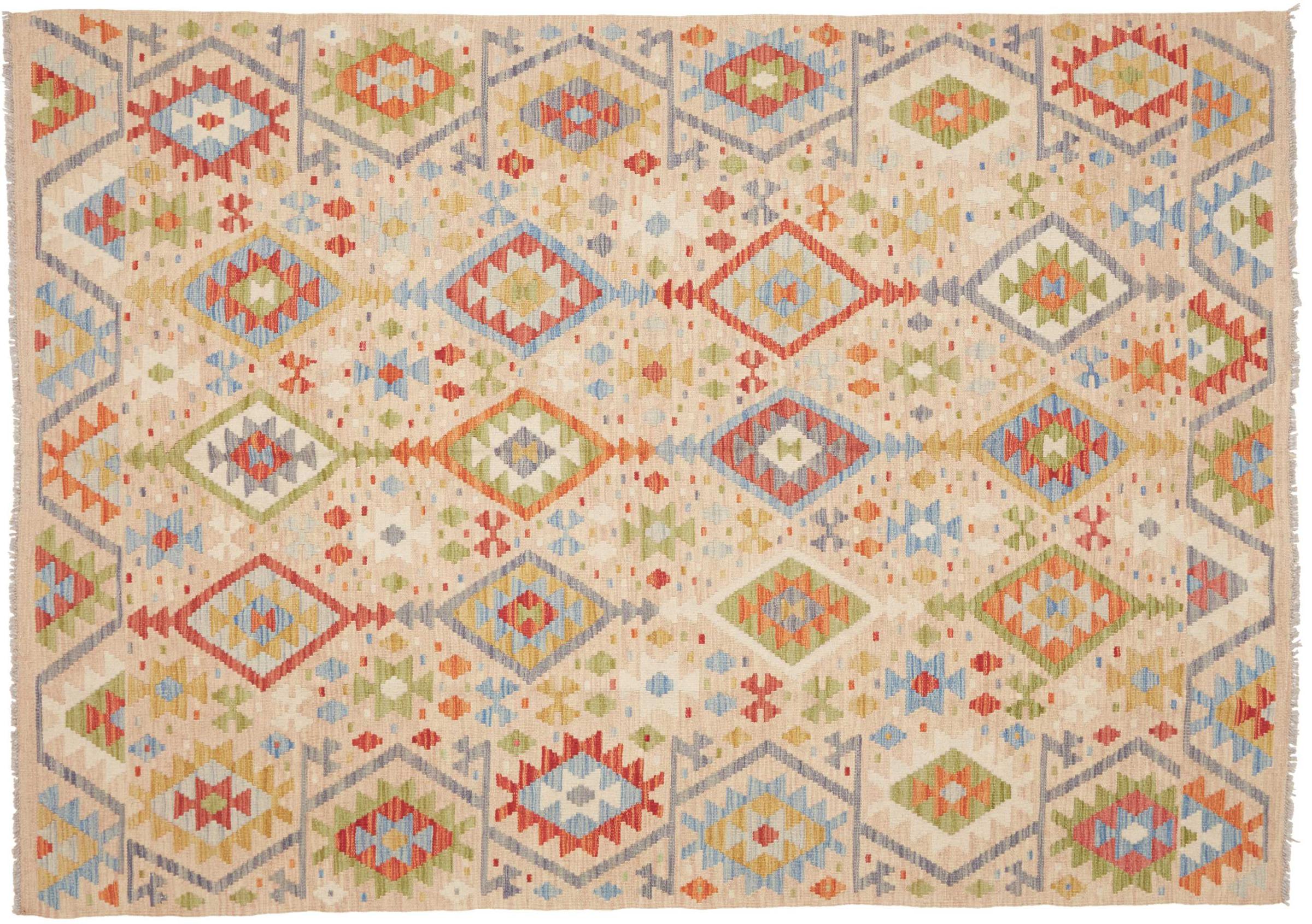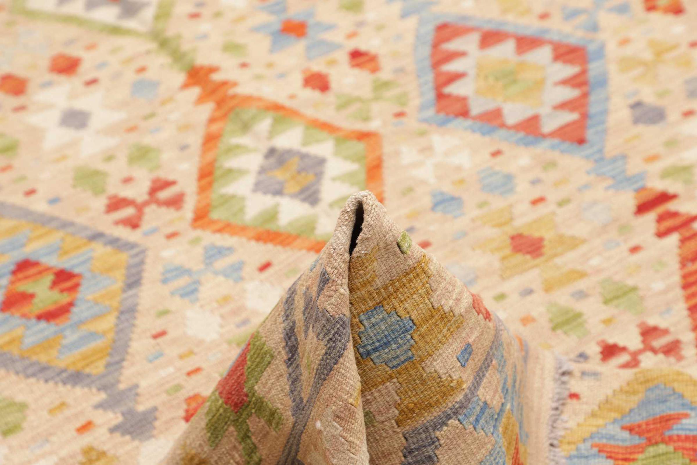This rug was made as a flat weave by hand on a loom. Flatweave is the term used to describe rugs that have no pile. As the name promises, these rugs are woven and not knotted. This results in a flat rug with a structured surface. Flatweaves are not as soft and usually thinner than knotted rugs. At the same time they are much less complex to manufacture and can usually be laid out from both sides (front and back). Their patterns are usually geometric, which is determined by the fabric.