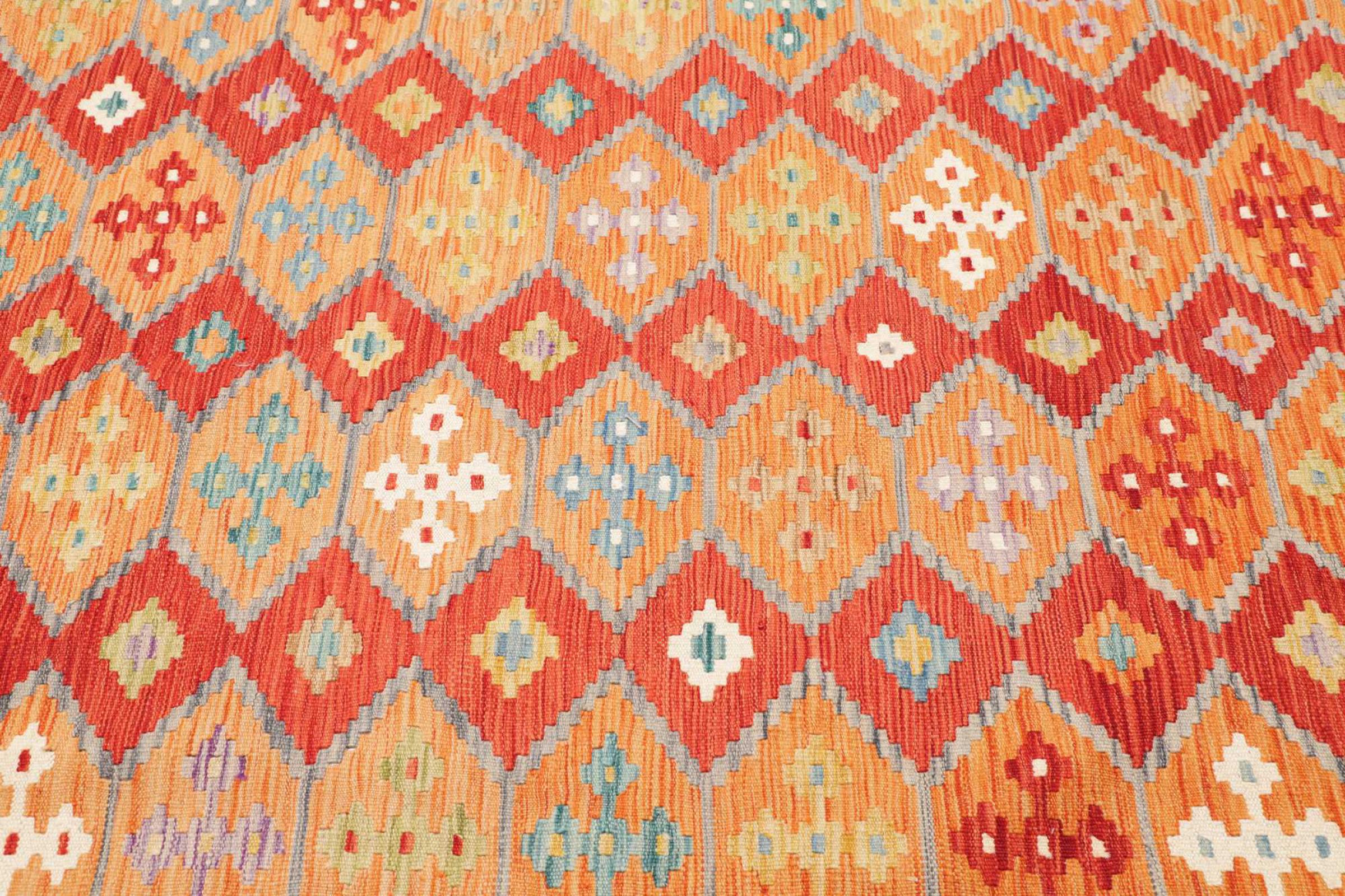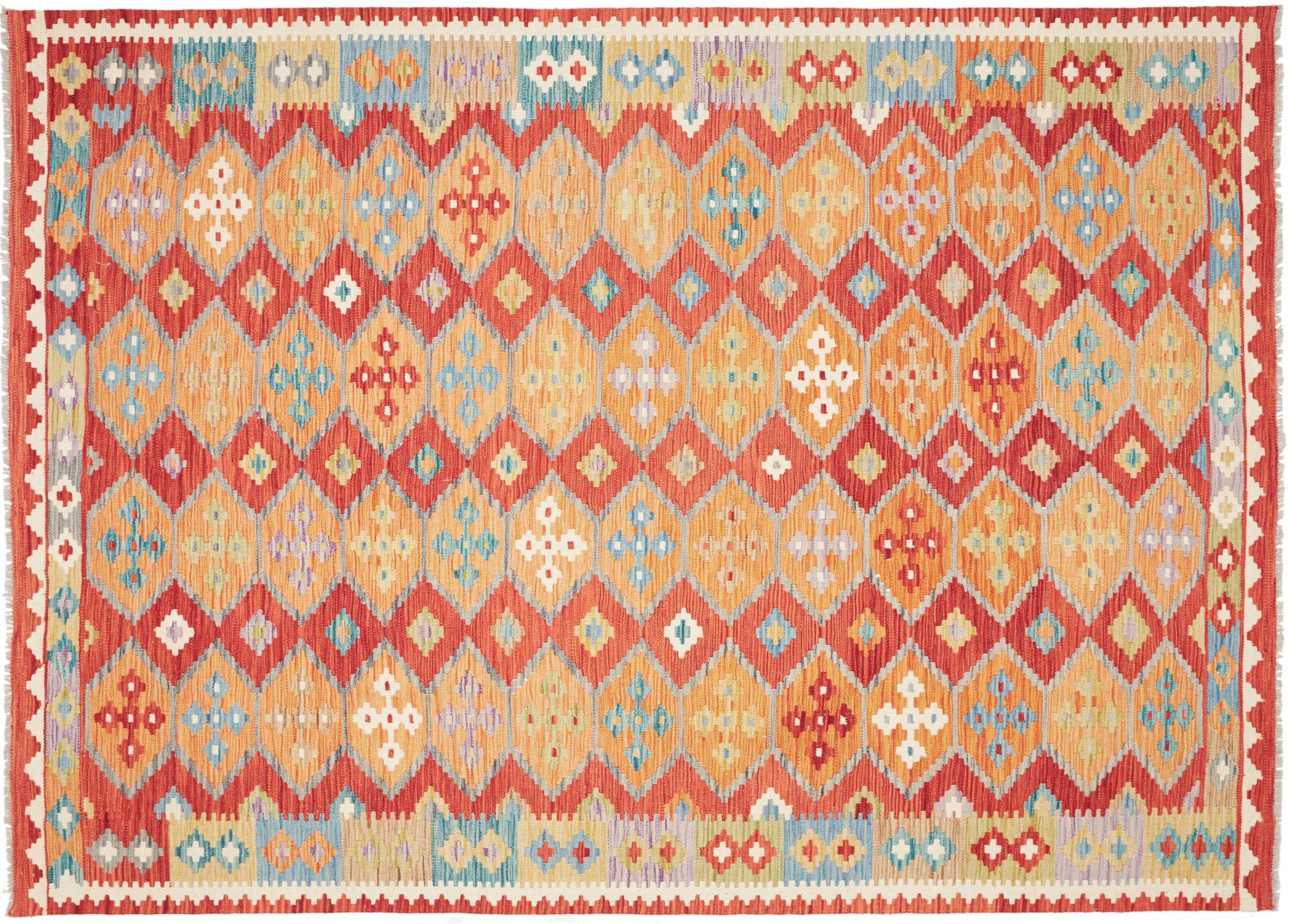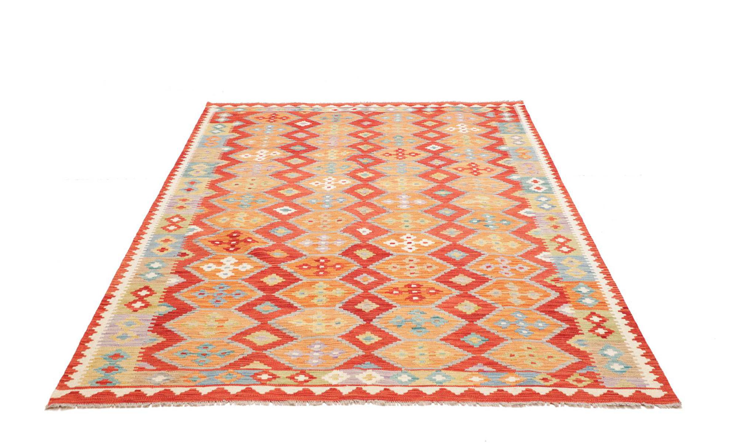 This rug was made as a flat weave by hand on a loom. Flatweave is the term used to describe rugs that have no pile. As the name promises, these rugs are woven and not knotted. This results in a flat rug with a structured surface. Flatweaves are not as soft and usually thinner than knotted rugs. At the same time they are much less complex to manufacture and can usually be laid out from both sides (front and back). Their patterns are usually geometric, which is determined by the fabric.