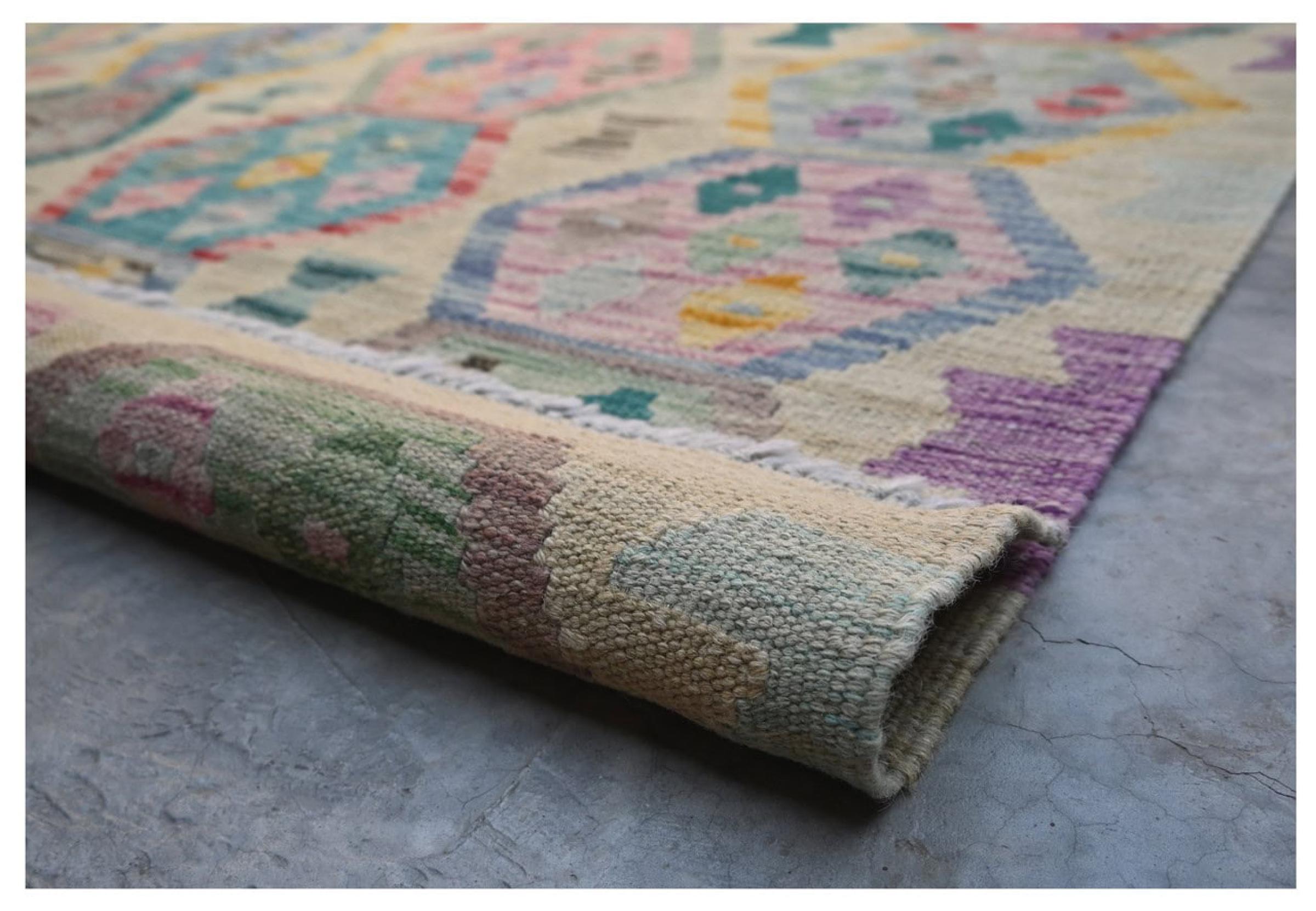 This rug was made as a flat weave by hand on a loom. Flatweave is the term used to describe rugs that have no pile. As the name promises, these rugs are woven and not knotted. This results in a flat rug with a structured surface. Flatweaves are not as soft and usually thinner than knotted rugs. At the same time they are much less complex to manufacture and can usually be laid out from both sides (front and back). Their patterns are usually geometric, which is determined by the fabric.