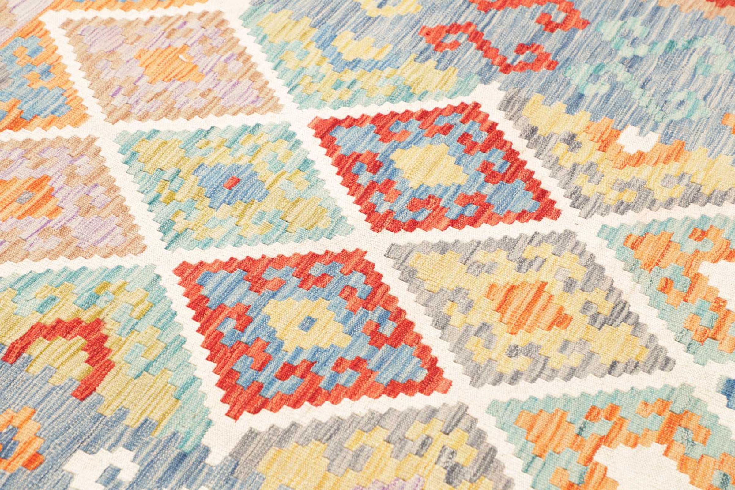 This rug was made as a flat weave by hand on a loom. Flatweave is the term used to describe rugs that have no pile. As the name promises, these rugs are woven and not knotted. This results in a flat rug with a structured surface. Flatweaves are not as soft and usually thinner than knotted rugs. At the same time they are much less complex to manufacture and can usually be laid out from both sides (front and back). Their patterns are usually geometric, which is determined by the fabric.