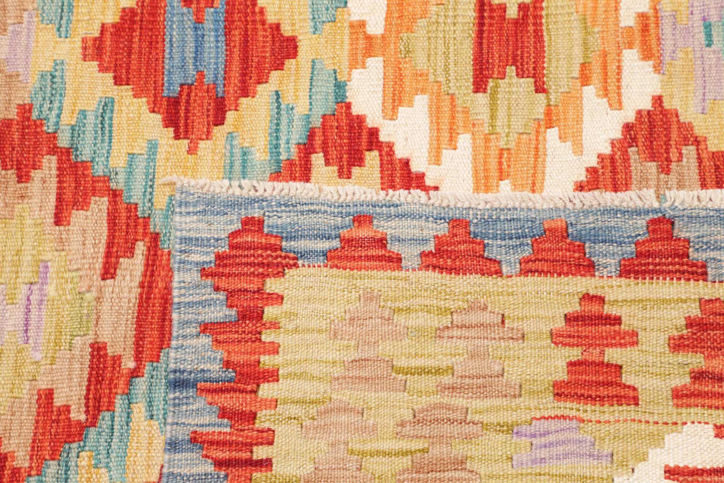 This rug was made as a flat weave by hand on a loom. Flatweave is the term used to describe rugs that have no pile. As the name promises, these rugs are woven and not knotted. This results in a flat rug with a structured surface. Flatweaves are not as soft and usually thinner than knotted rugs. At the same time they are much less complex to manufacture and can usually be laid out from both sides (front and back). Their patterns are usually geometric, which is determined by the fabric.