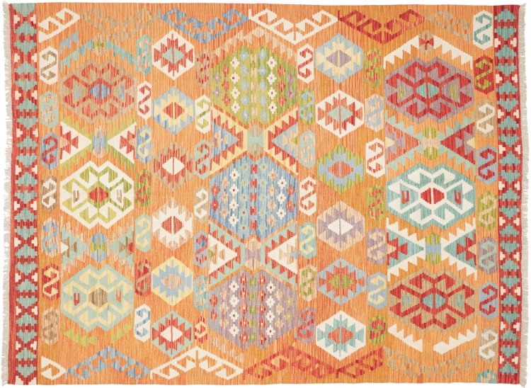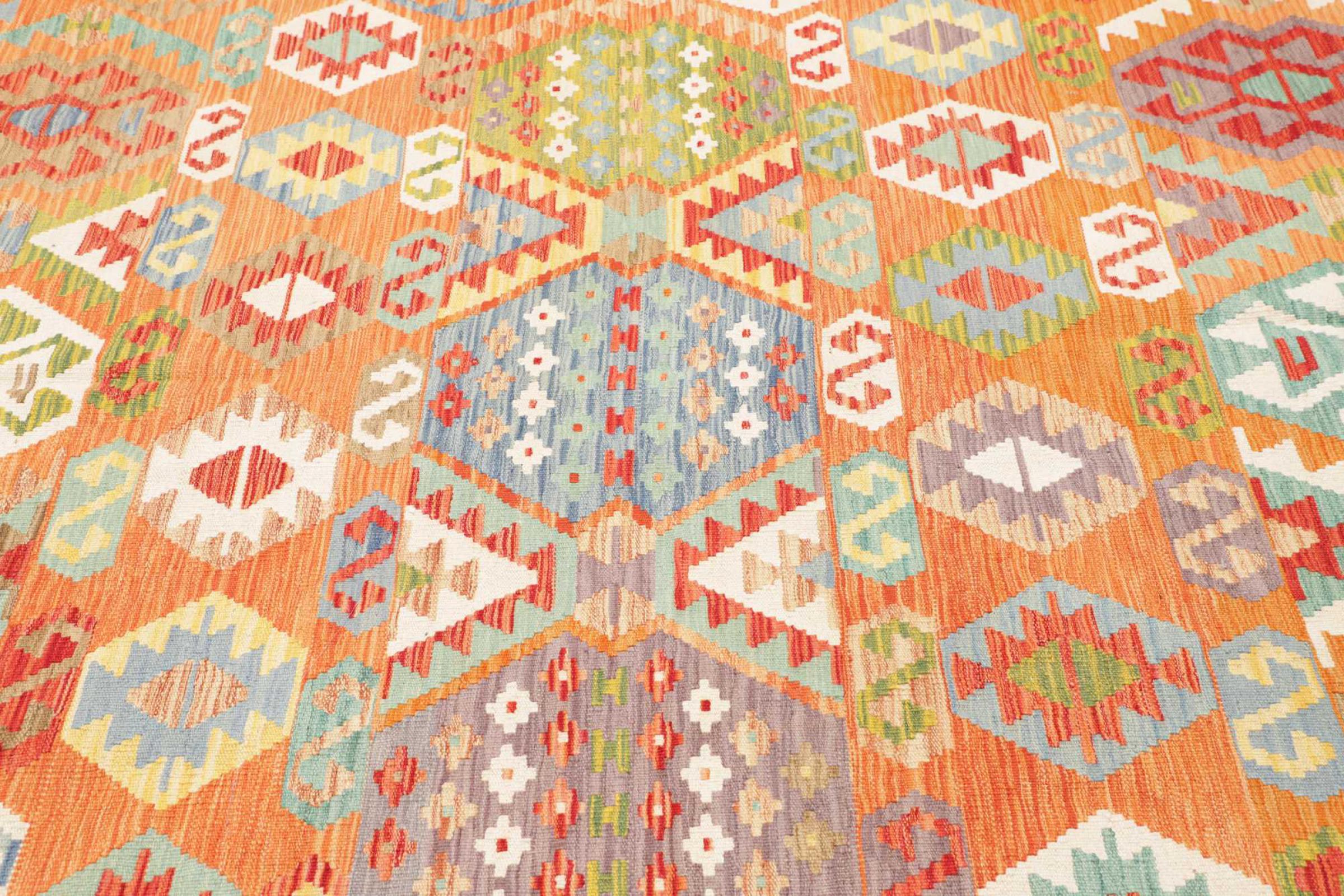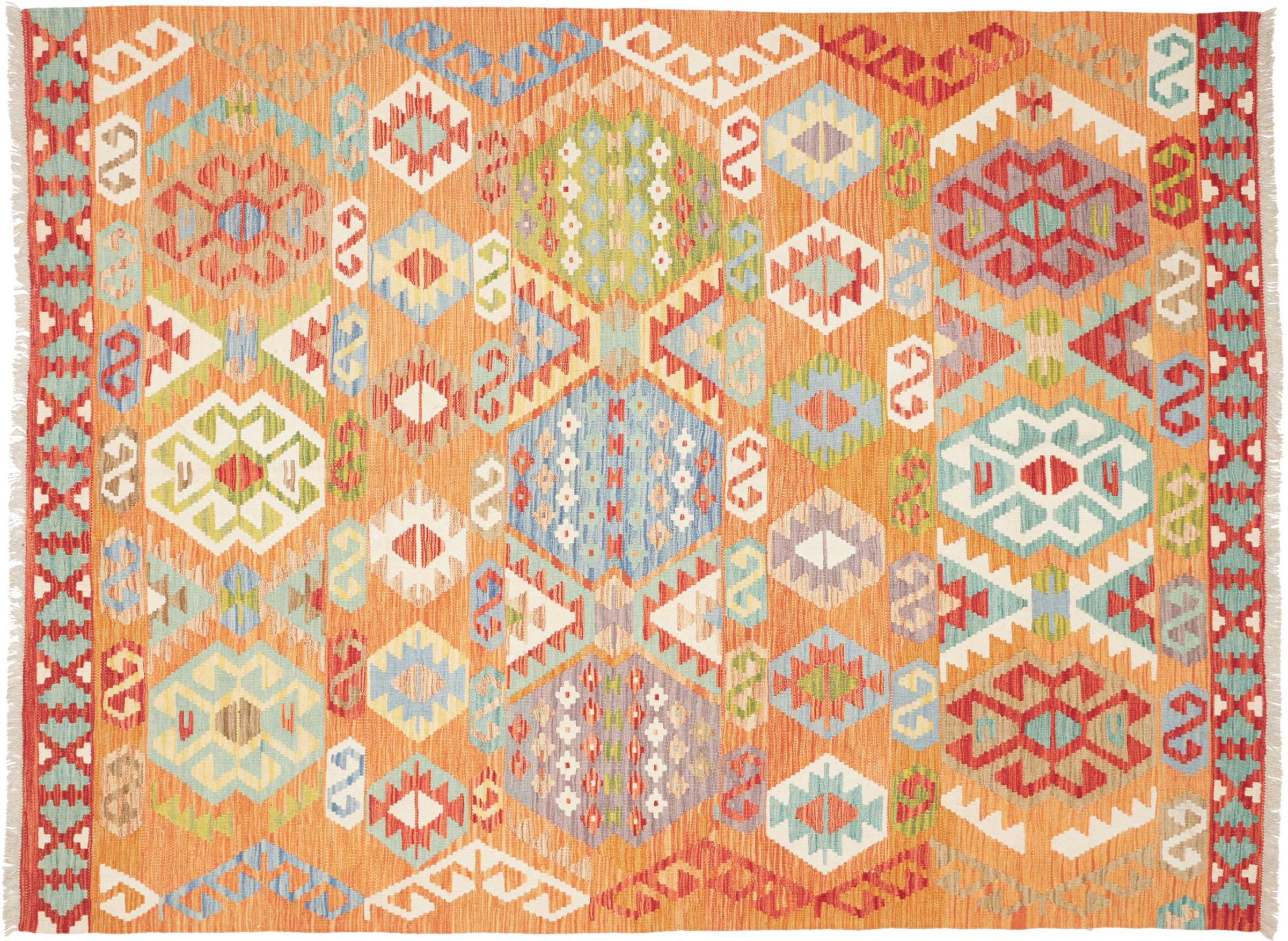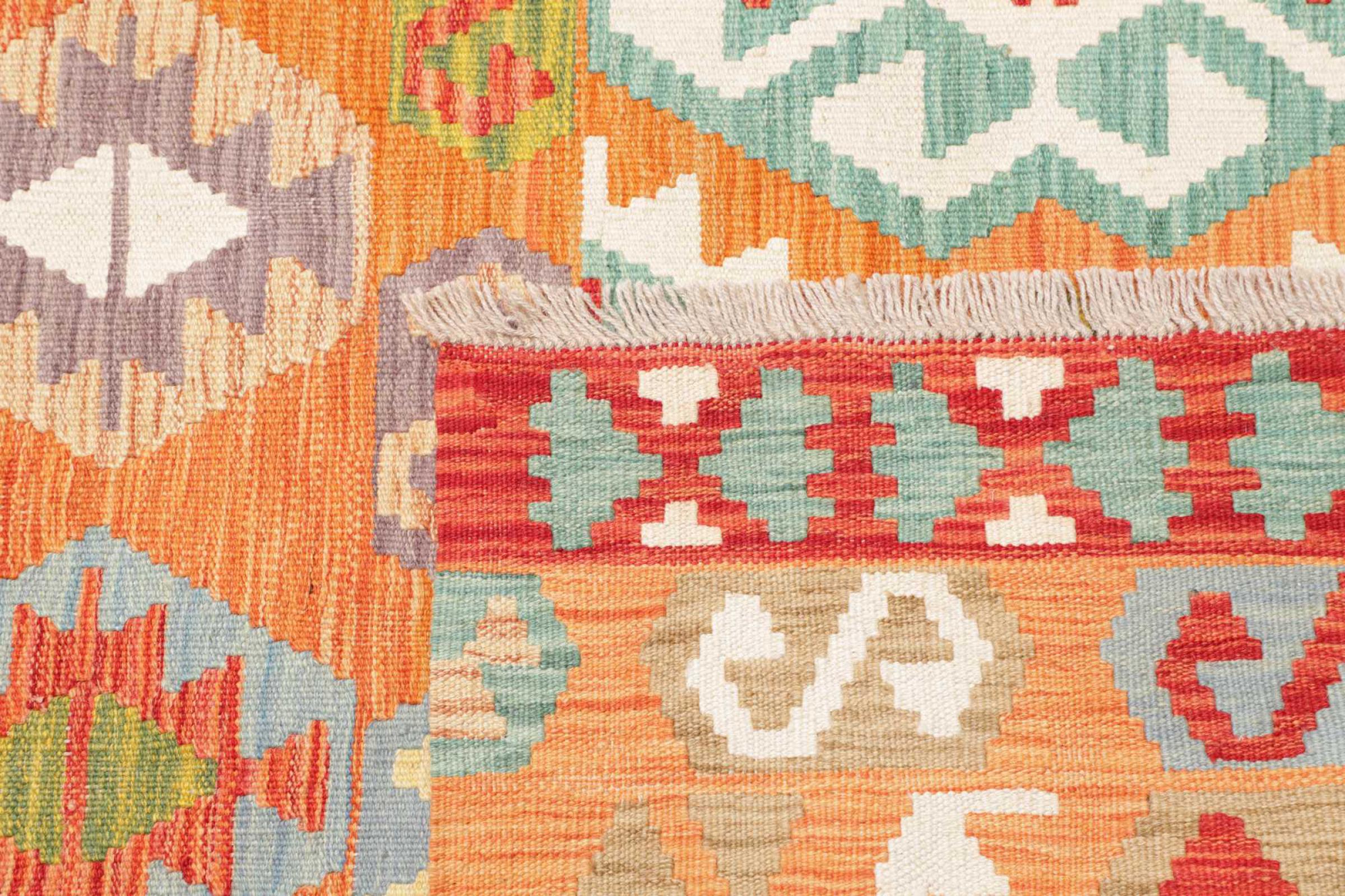 This rug was made as a flat weave by hand on a loom. Flatweave is the term used to describe rugs that have no pile. As the name promises, these rugs are woven and not knotted. This results in a flat rug with a structured surface. Flatweaves are not as soft and usually thinner than knotted rugs. At the same time they are much less complex to manufacture and can usually be laid out from both sides (front and back). Their patterns are usually geometric, which is determined by the fabric.