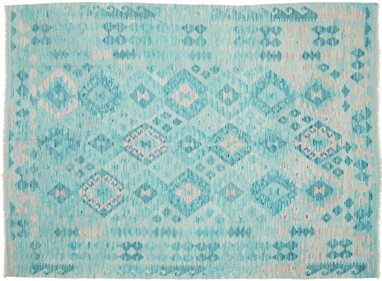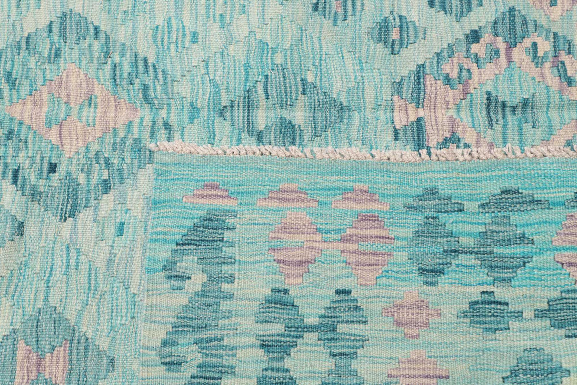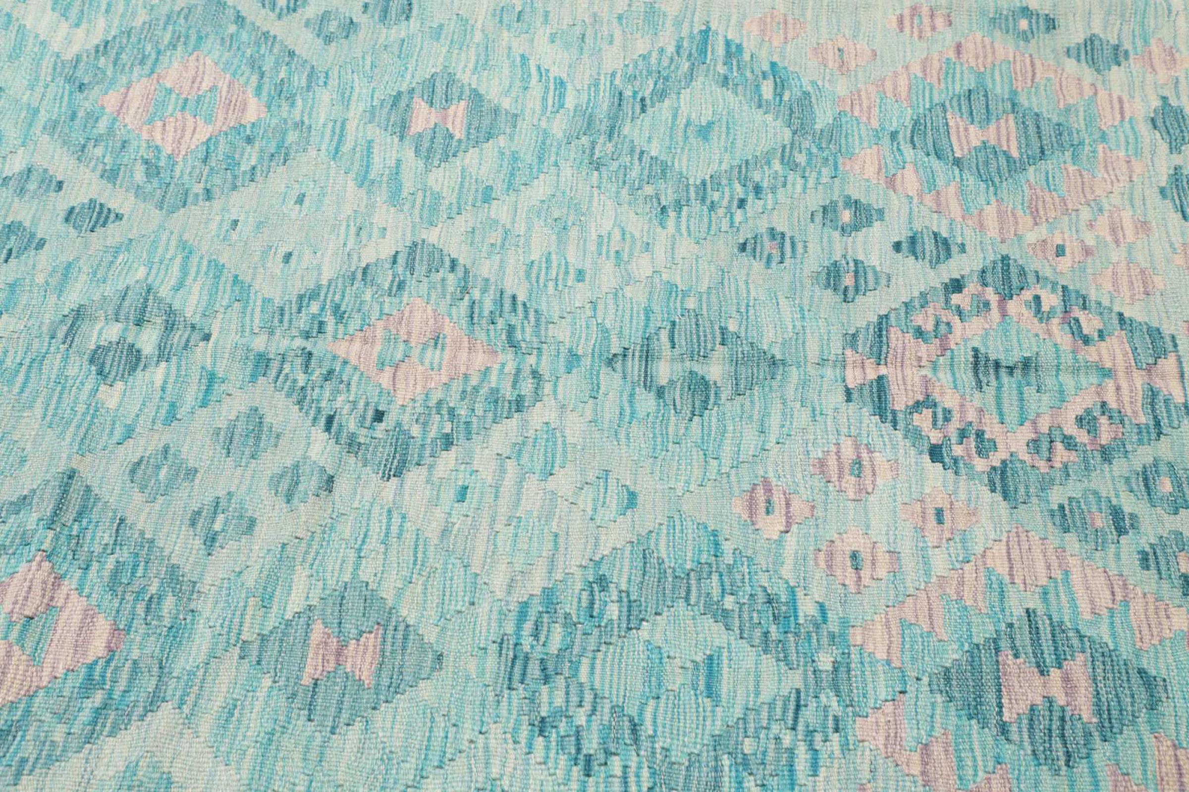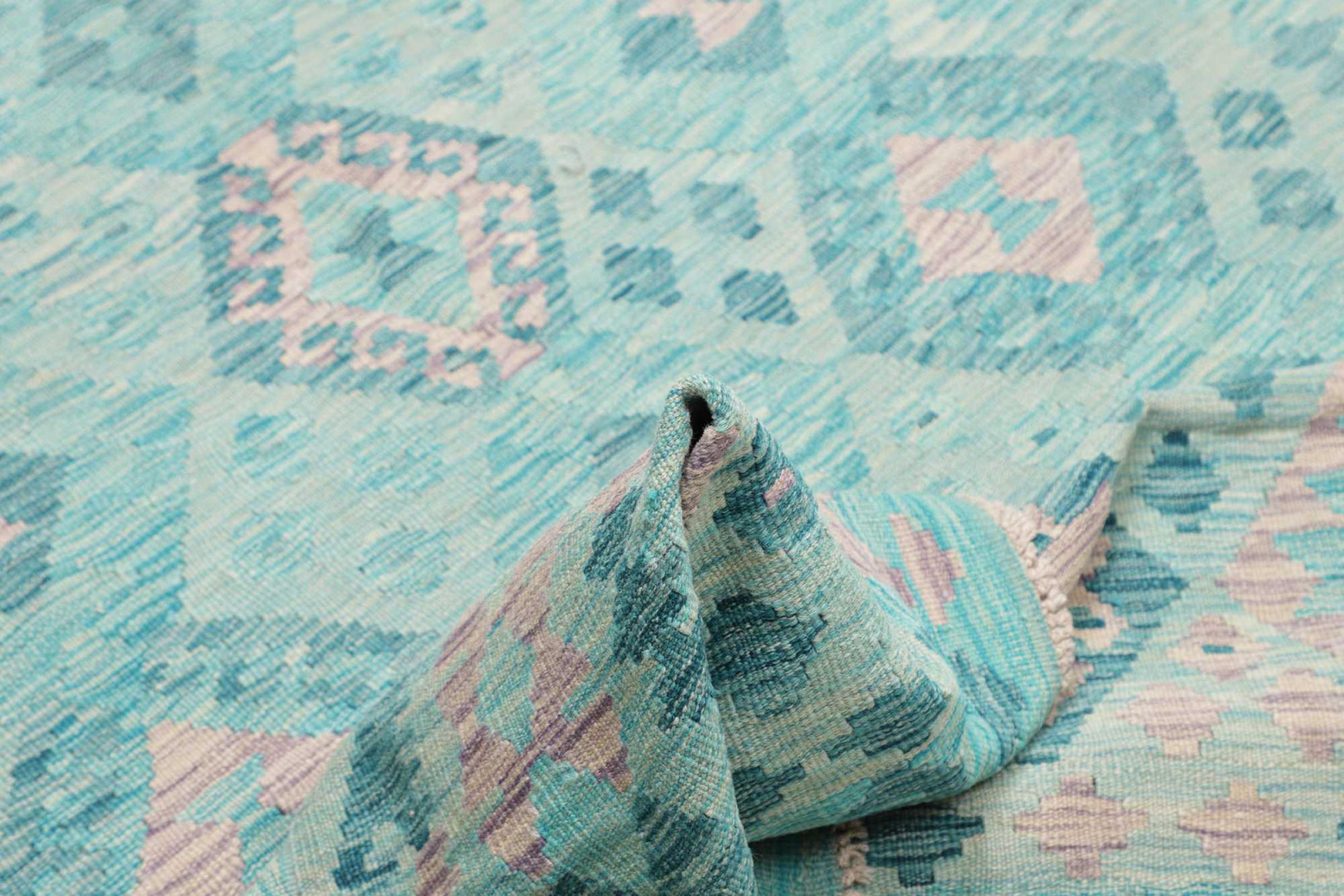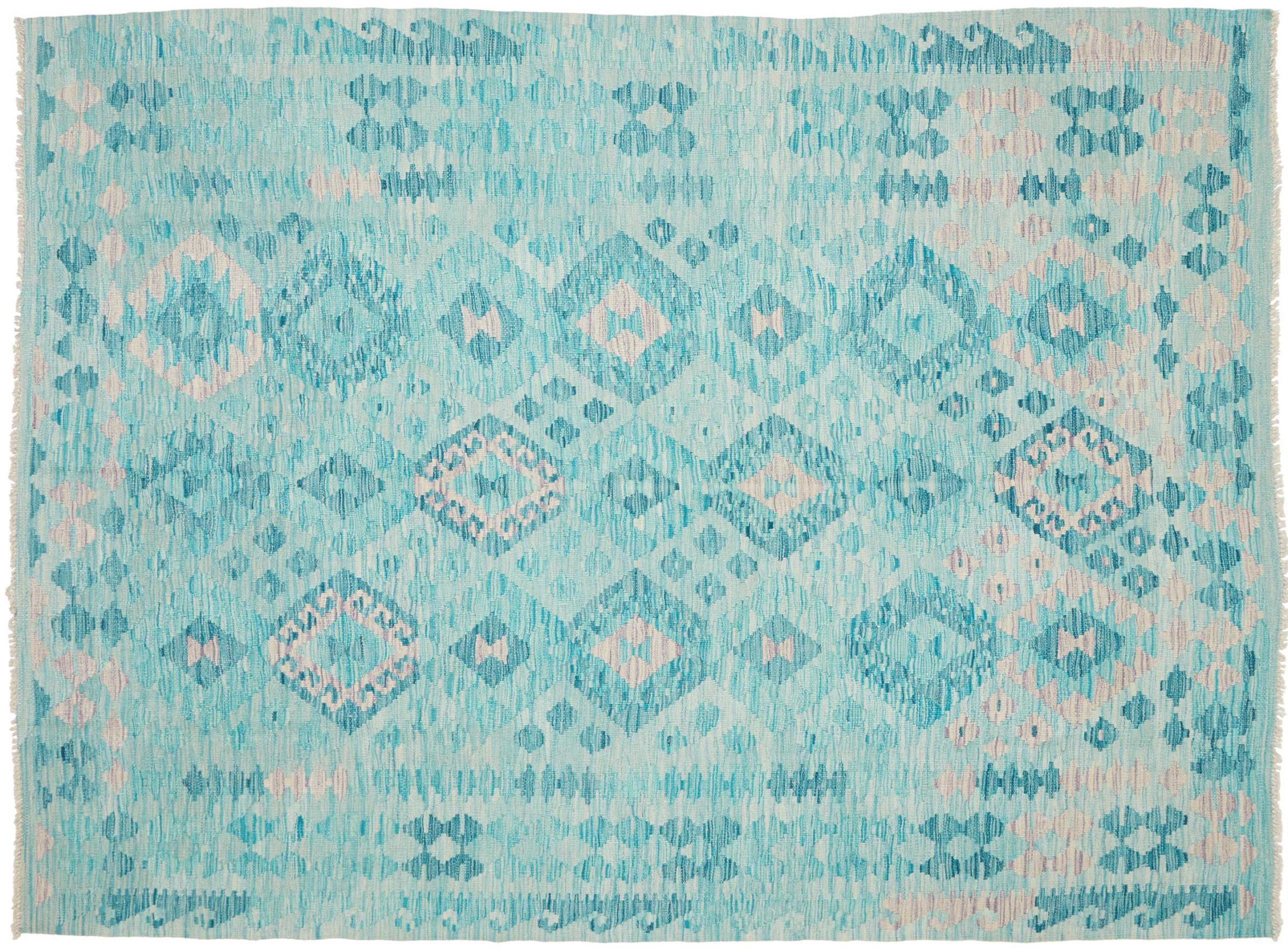 This rug was made as a flat weave by hand on a loom. Flatweave is the term used to describe rugs that have no pile. As the name promises, these rugs are woven and not knotted. This results in a flat rug with a structured surface. Flatweaves are not as soft and usually thinner than knotted rugs. At the same time they are much less complex to manufacture and can usually be laid out from both sides (front and back). Their patterns are usually geometric, which is determined by the fabric.