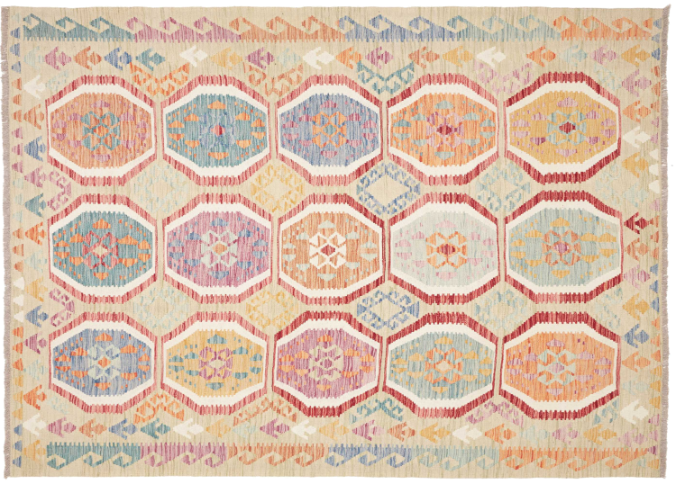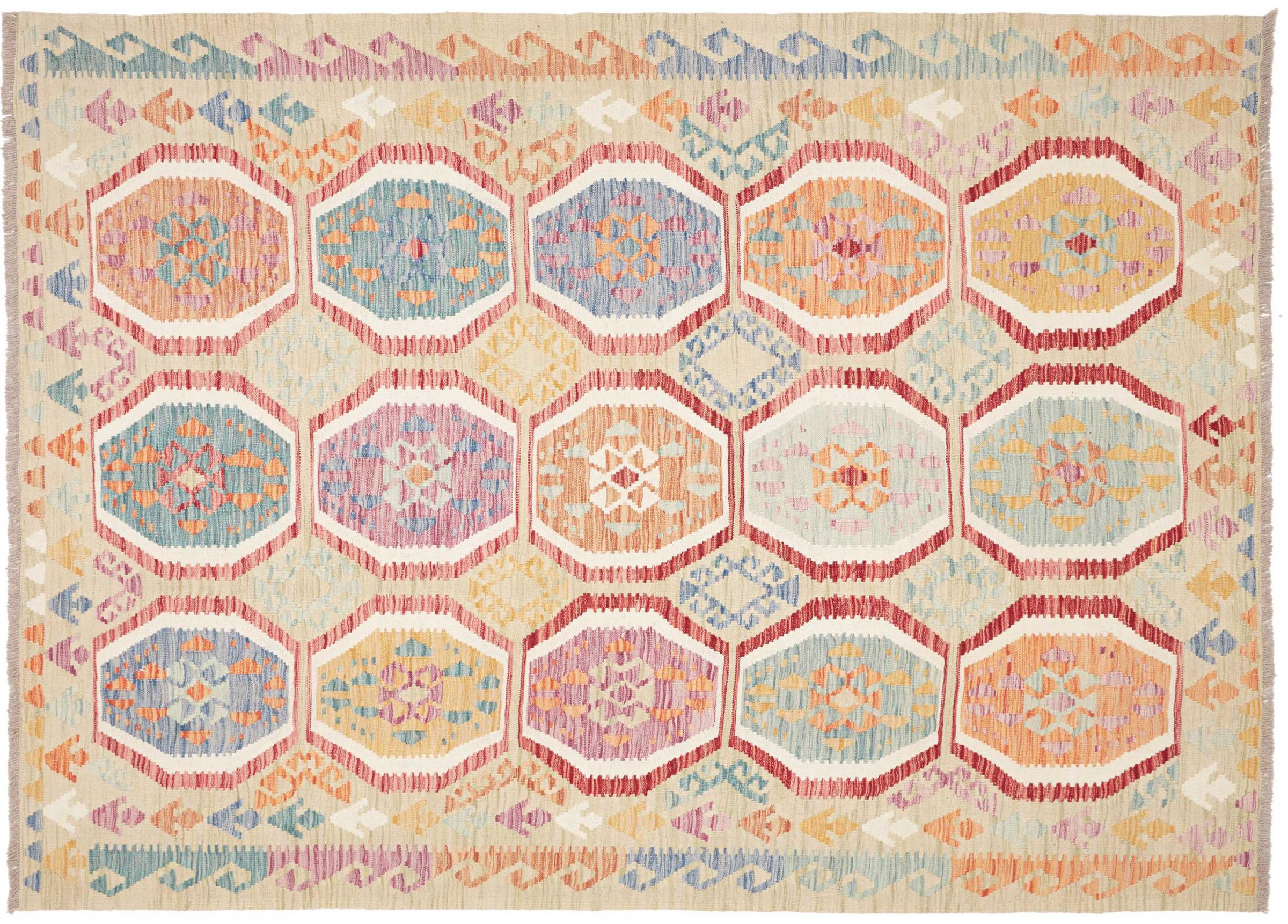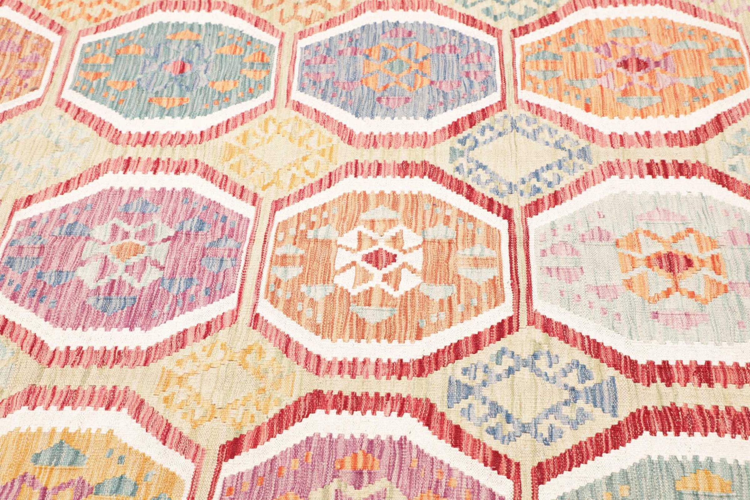 This rug was made as a flat weave by hand on a loom. Flatweave is the term used to describe rugs that have no pile. As the name promises, these rugs are woven and not knotted. This results in a flat rug with a structured surface. Flatweaves are not as soft and usually thinner than knotted rugs. At the same time they are much less complex to manufacture and can usually be laid out from both sides (front and back). Their patterns are usually geometric, which is determined by the fabric.