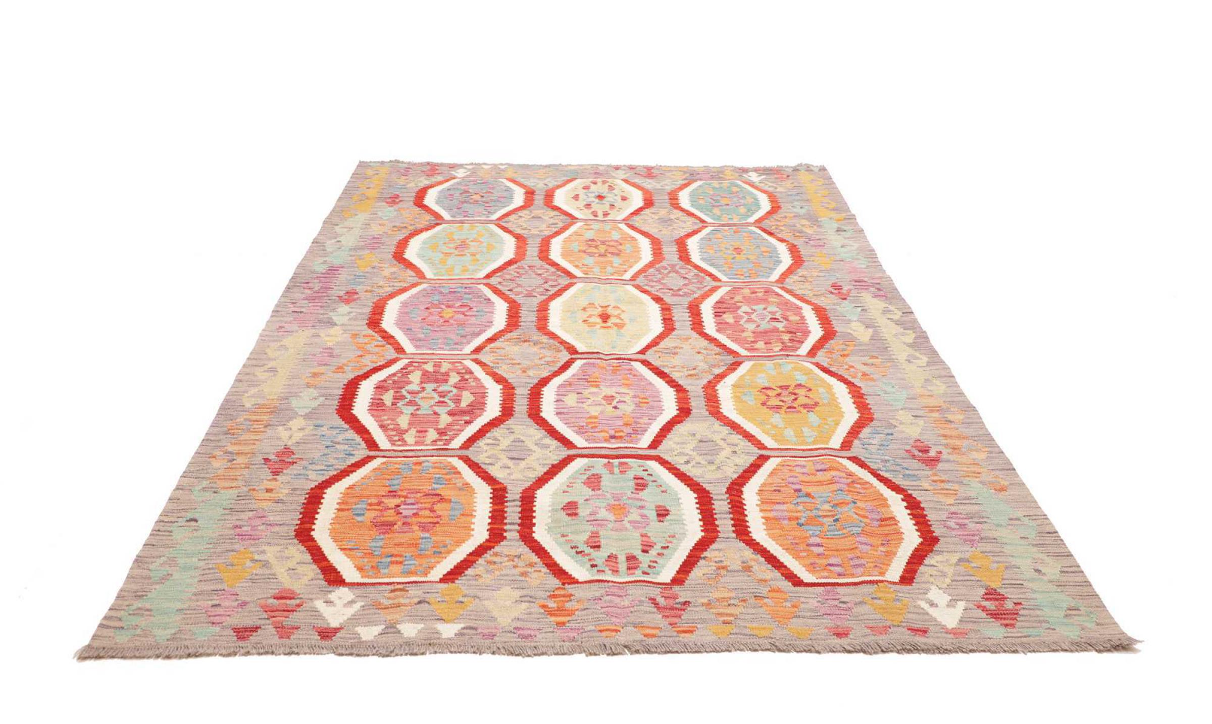 This rug was made as a flat weave by hand on a loom. Flatweave is the term used to describe rugs that have no pile. As the name promises, these rugs are woven and not knotted. This results in a flat rug with a structured surface. Flatweaves are not as soft and usually thinner than knotted rugs. At the same time they are much less complex to manufacture and can usually be laid out from both sides (front and back). Their patterns are usually geometric, which is determined by the fabric.