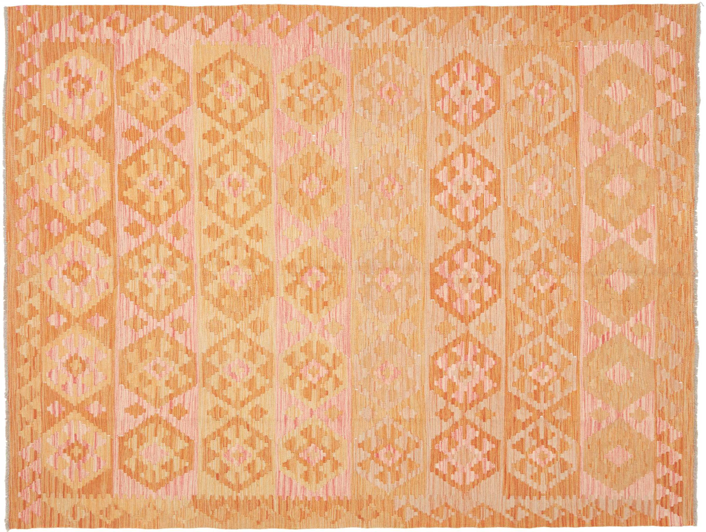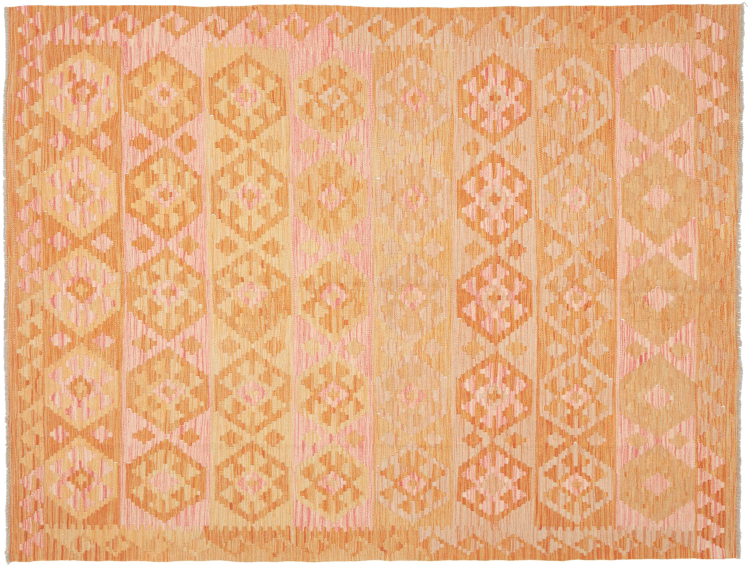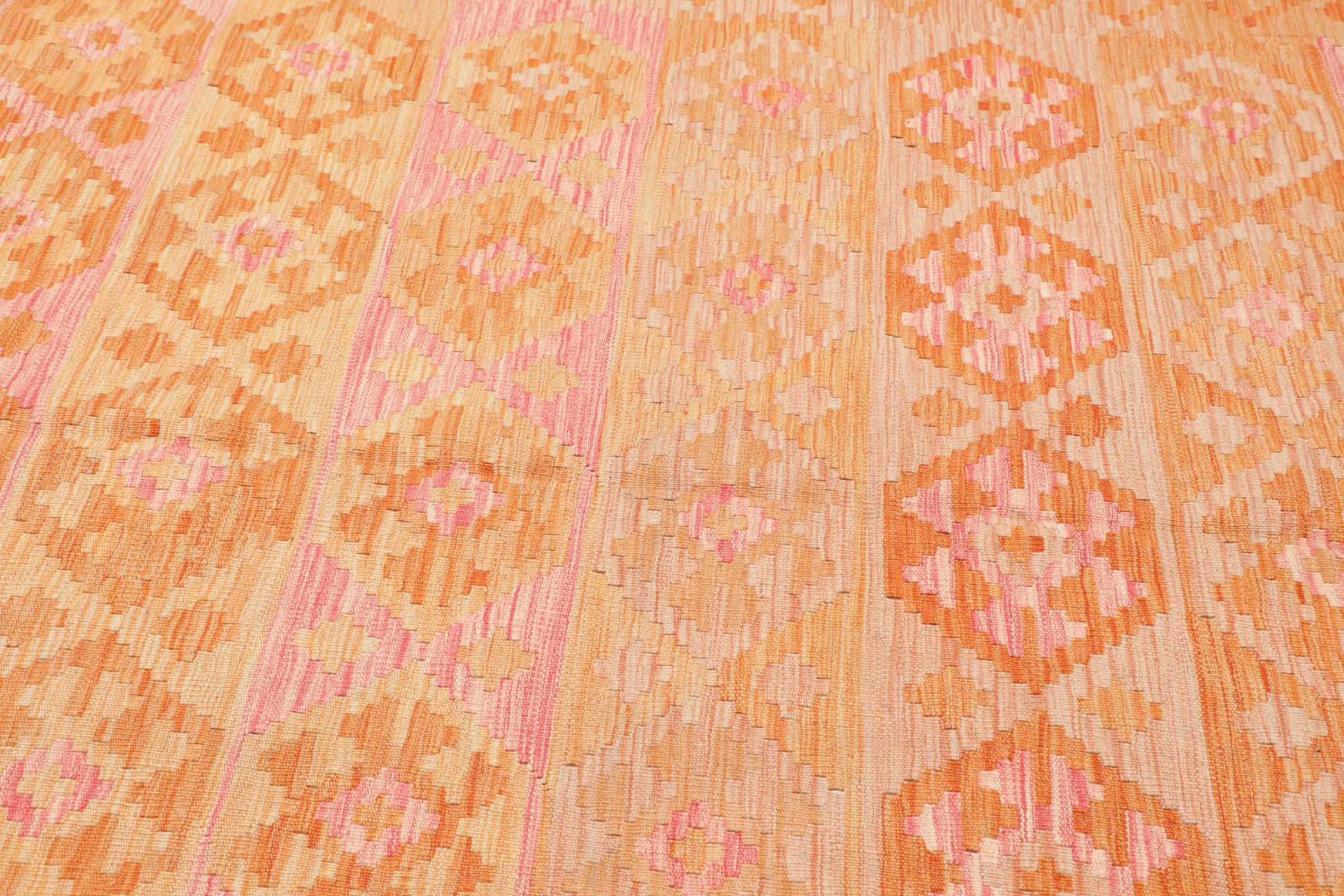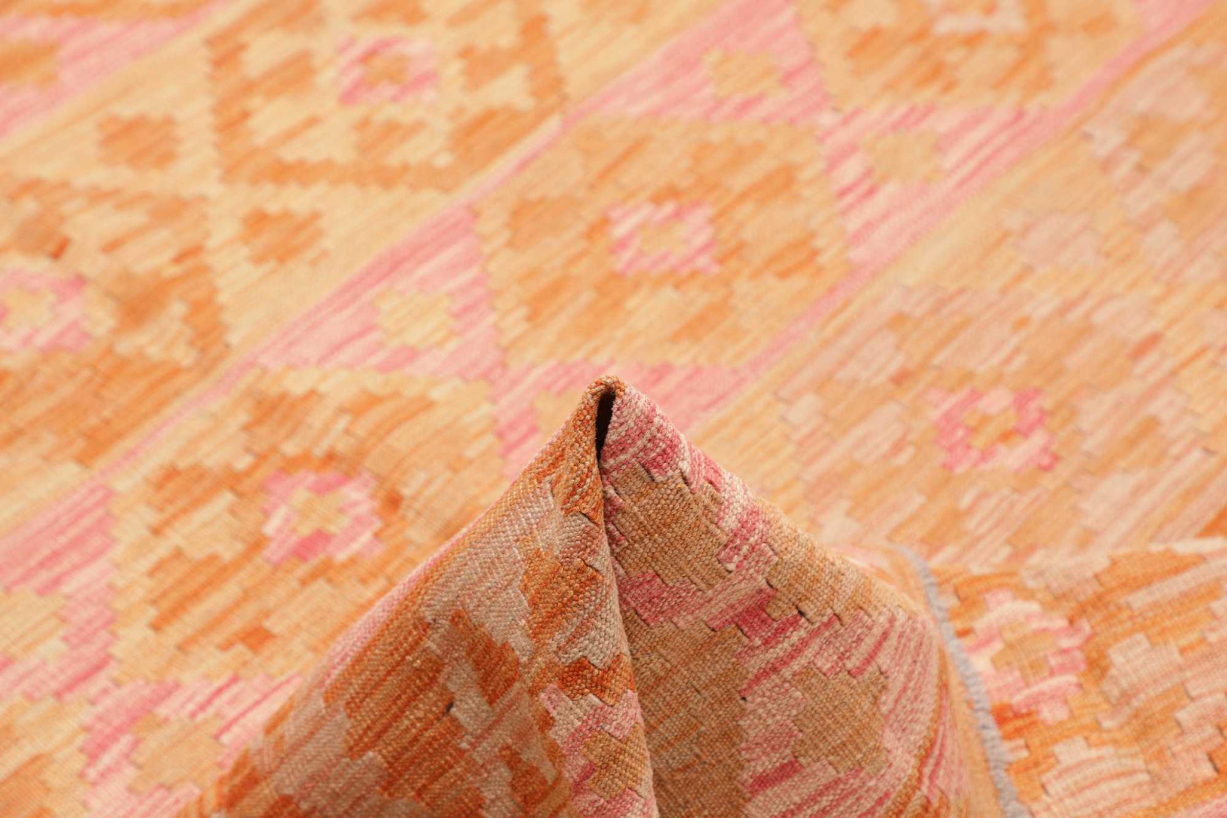 This rug was made as a flat weave by hand on a loom. Flatweave is the term used to describe rugs that have no pile. As the name promises, these rugs are woven and not knotted. This results in a flat rug with a structured surface. Flatweaves are not as soft and usually thinner than knotted rugs. At the same time they are much less complex to manufacture and can usually be laid out from both sides (front and back). Their patterns are usually geometric, which is determined by the fabric.