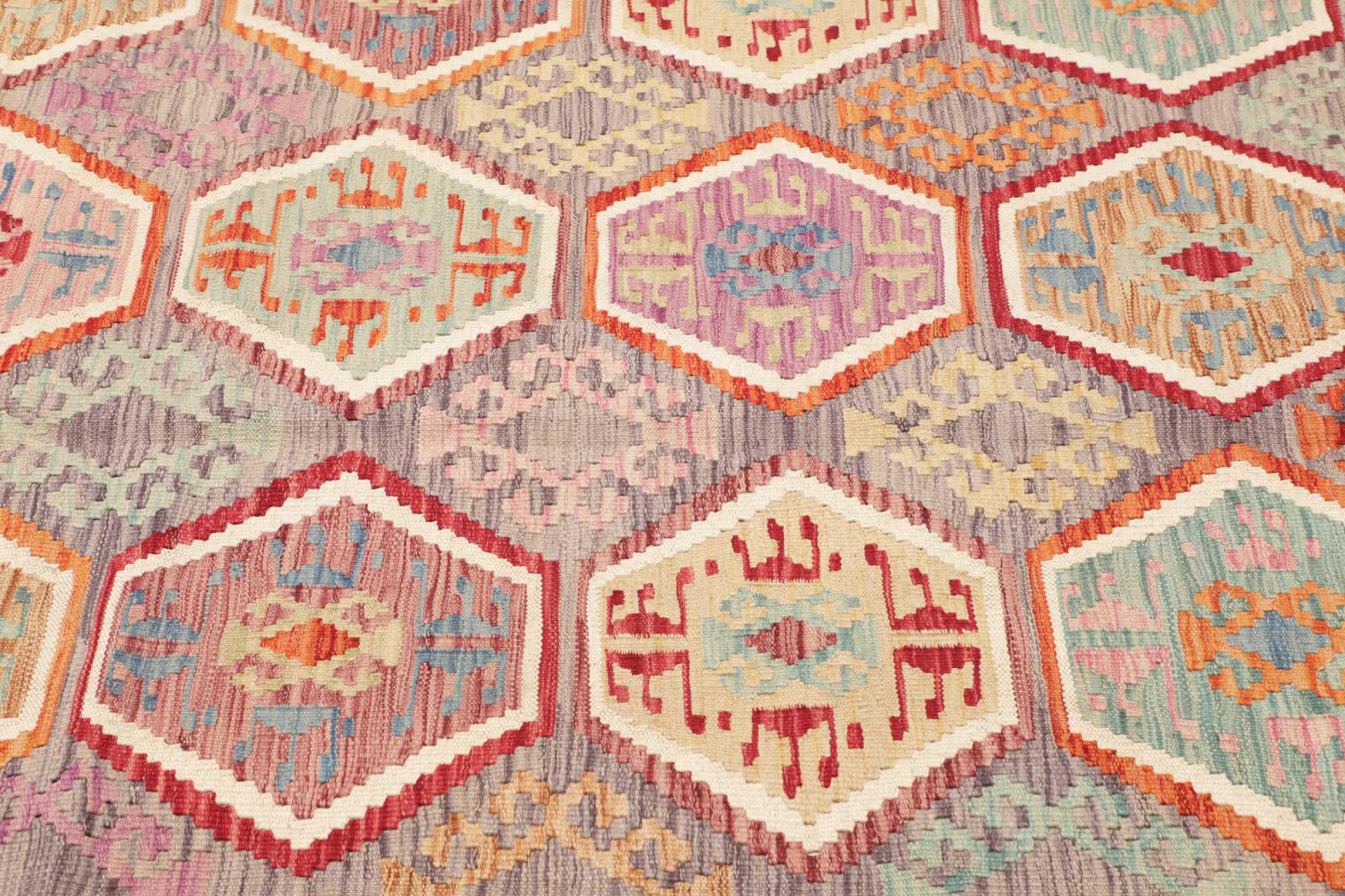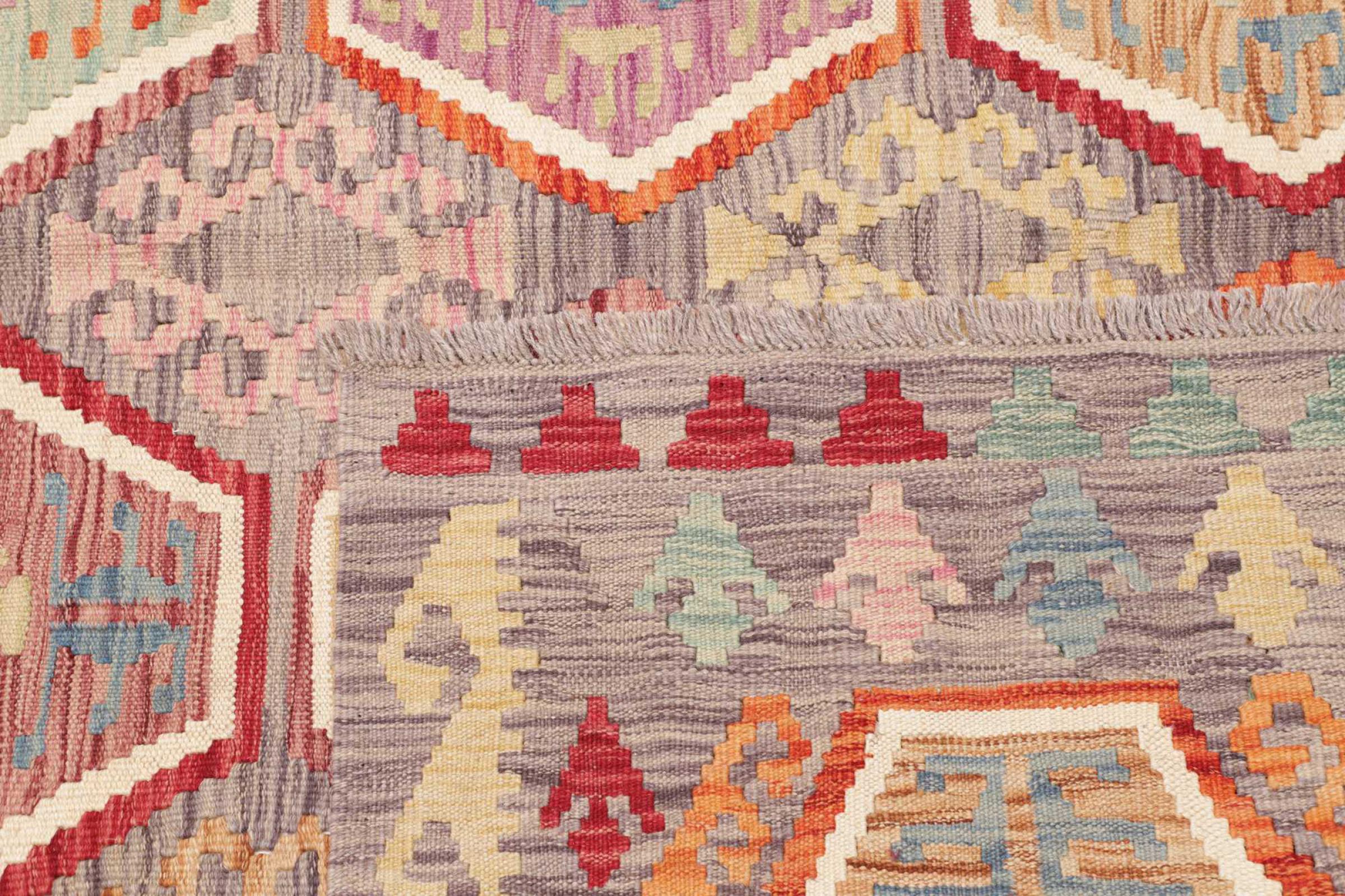 This rug was made as a flat weave by hand on a loom. Flatweave is the term used to describe rugs that have no pile. As the name promises, these rugs are woven and not knotted. This results in a flat rug with a structured surface. Flatweaves are not as soft and usually thinner than knotted rugs. At the same time they are much less complex to manufacture and can usually be laid out from both sides (front and back). Their patterns are usually geometric, which is determined by the fabric.