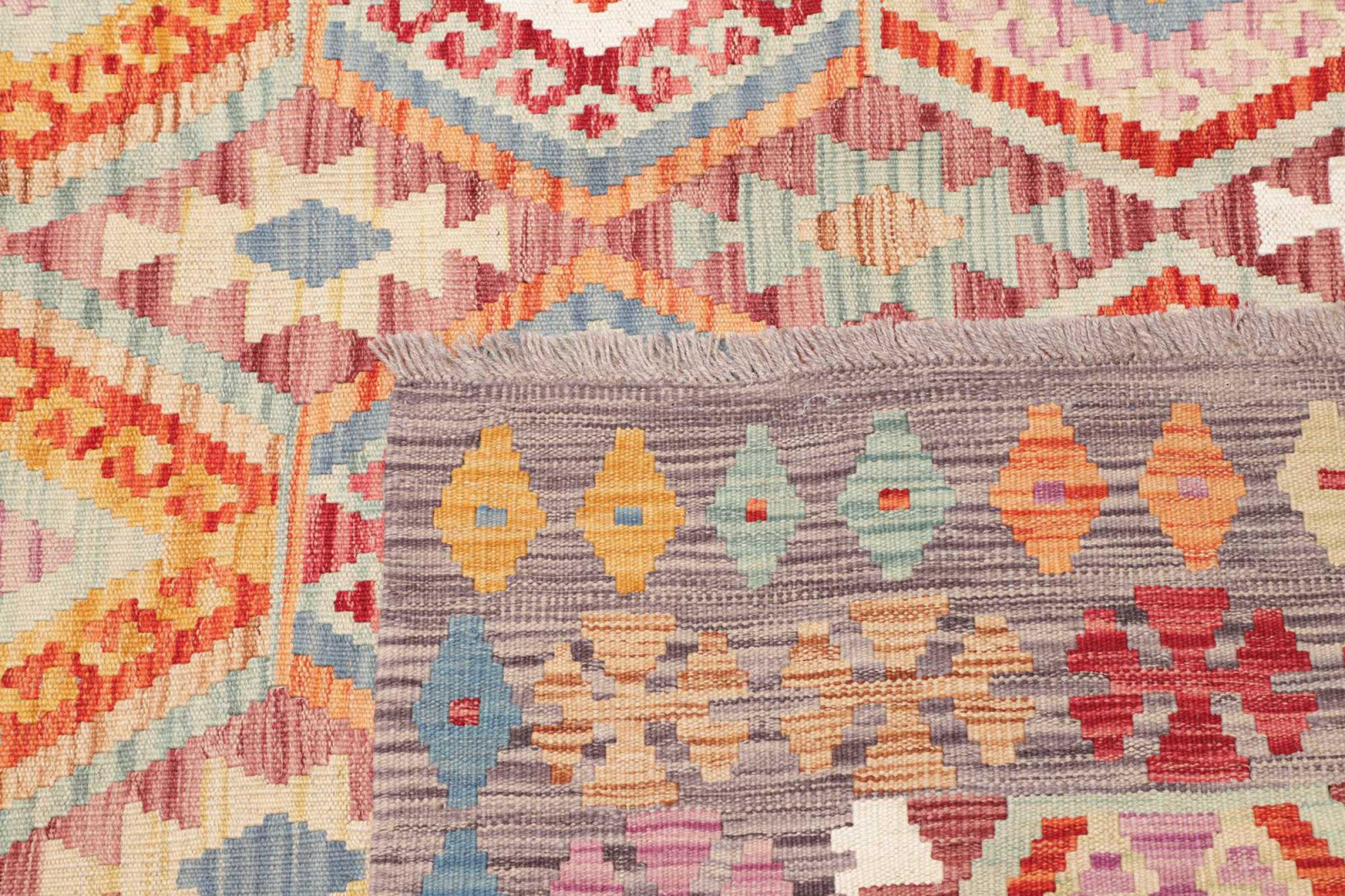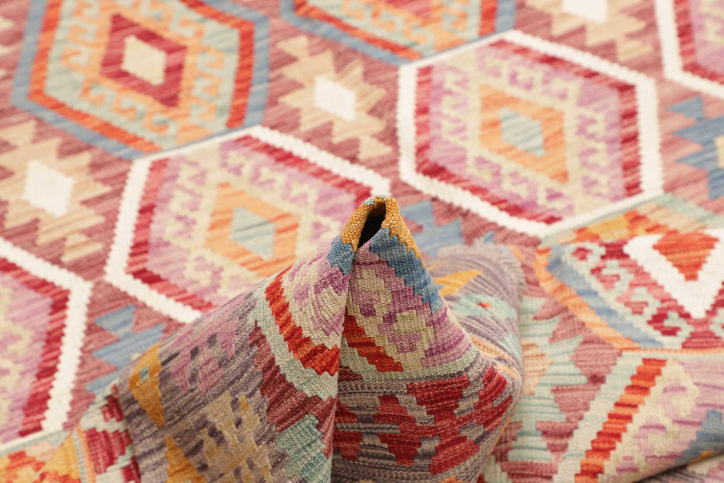 This rug was made as a flat weave by hand on a loom. Flatweave is the term used to describe rugs that have no pile. As the name promises, these rugs are woven and not knotted. This results in a flat rug with a structured surface. Flatweaves are not as soft and usually thinner than knotted rugs. At the same time they are much less complex to manufacture and can usually be laid out from both sides (front and back). Their patterns are usually geometric, which is determined by the fabric.