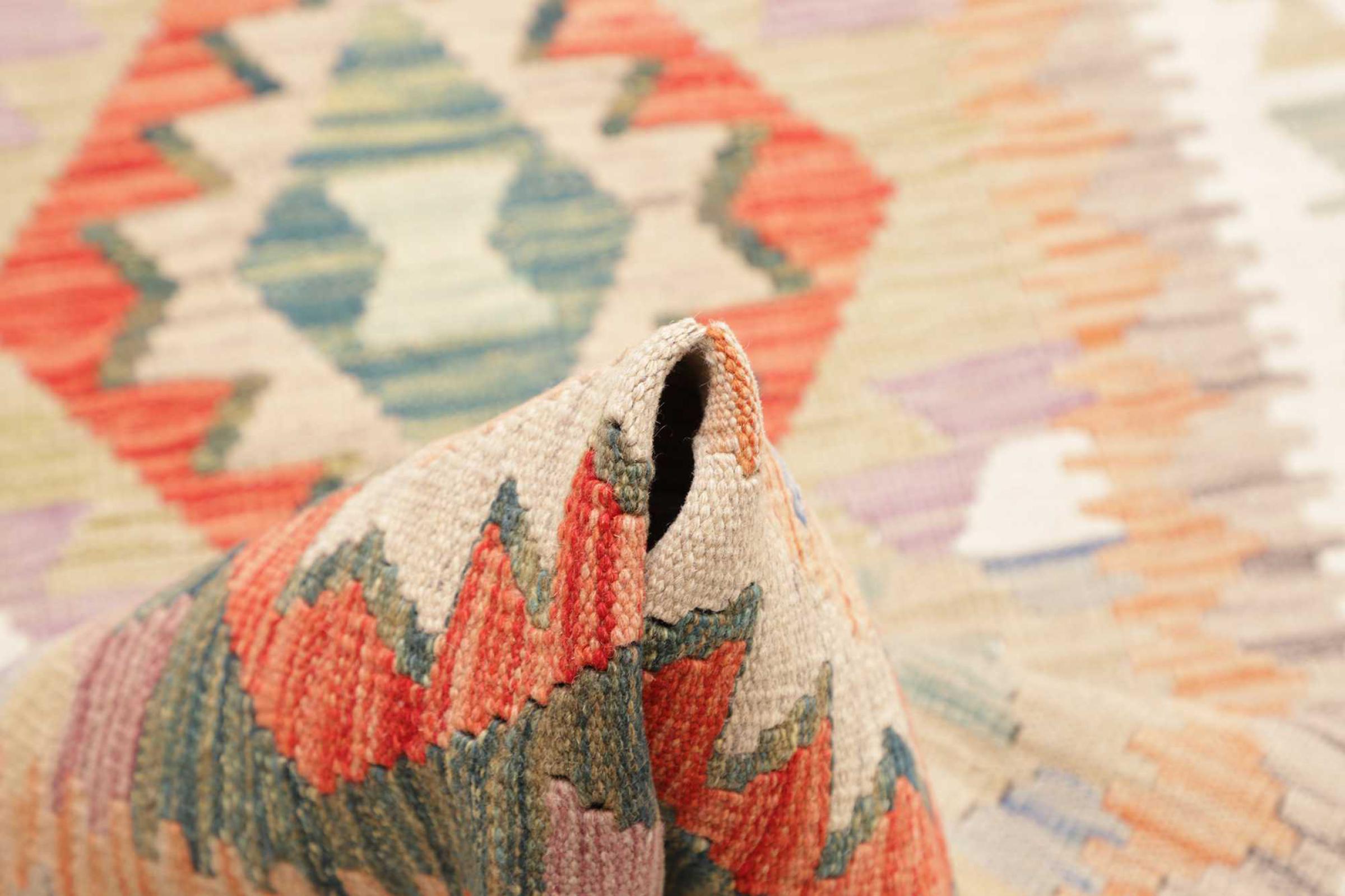 This rug was made as a flat weave by hand on a loom. Flatweave is the term used to describe rugs that have no pile. As the name promises, these rugs are woven and not knotted. This results in a flat rug with a structured surface. Flatweaves are not as soft and usually thinner than knotted rugs. At the same time they are much less complex to manufacture and can usually be laid out from both sides (front and back). Their patterns are usually geometric, which is determined by the fabric.