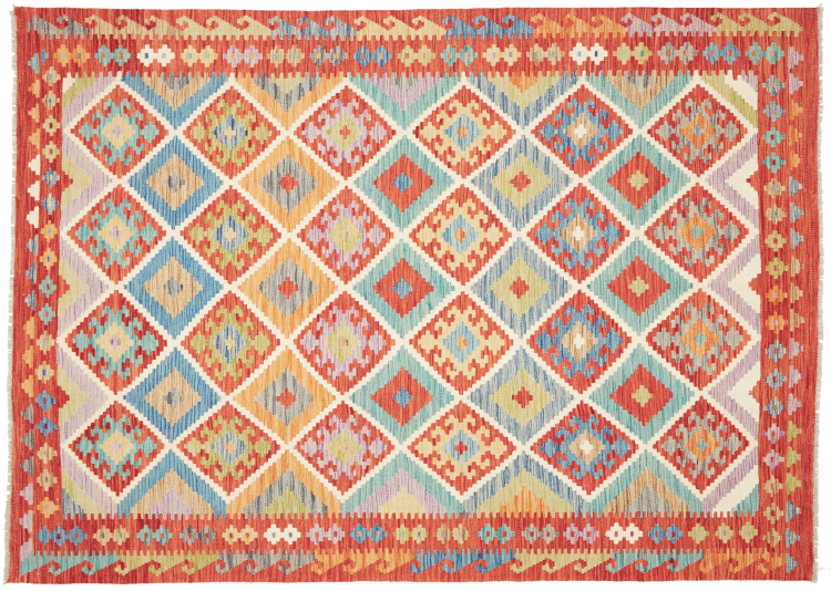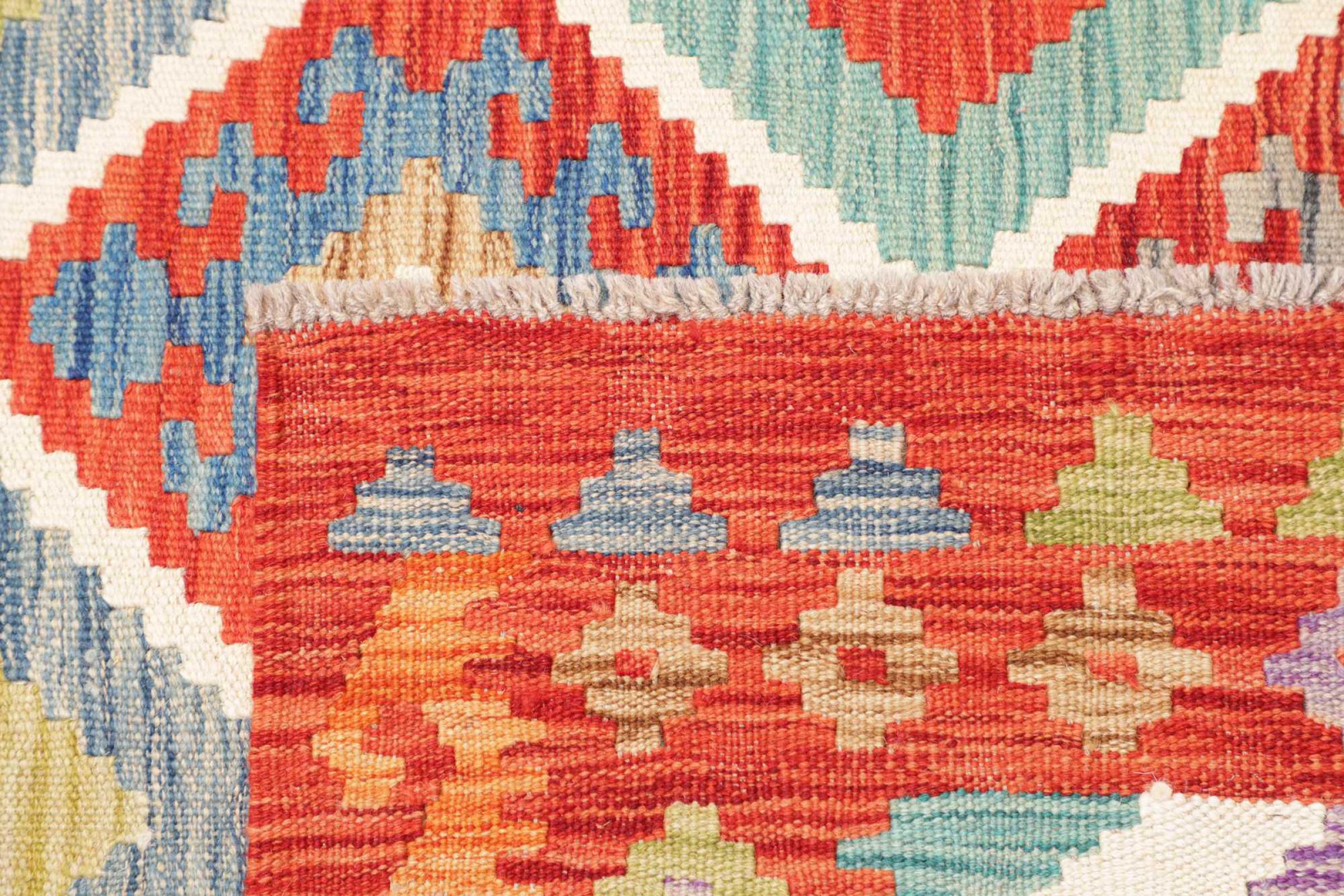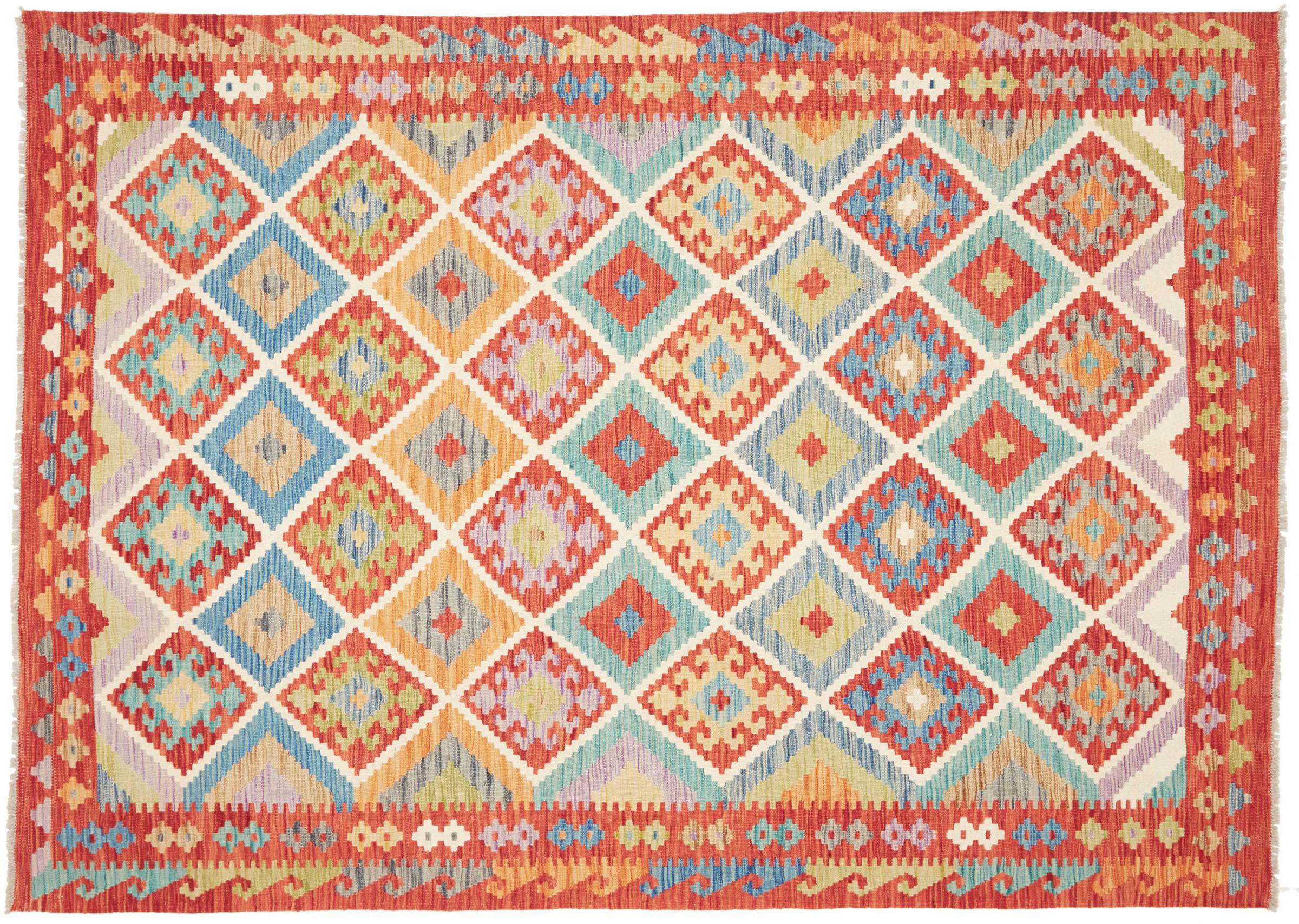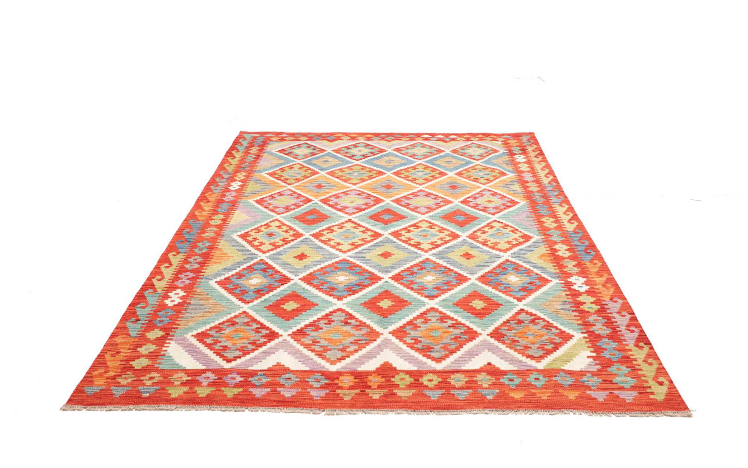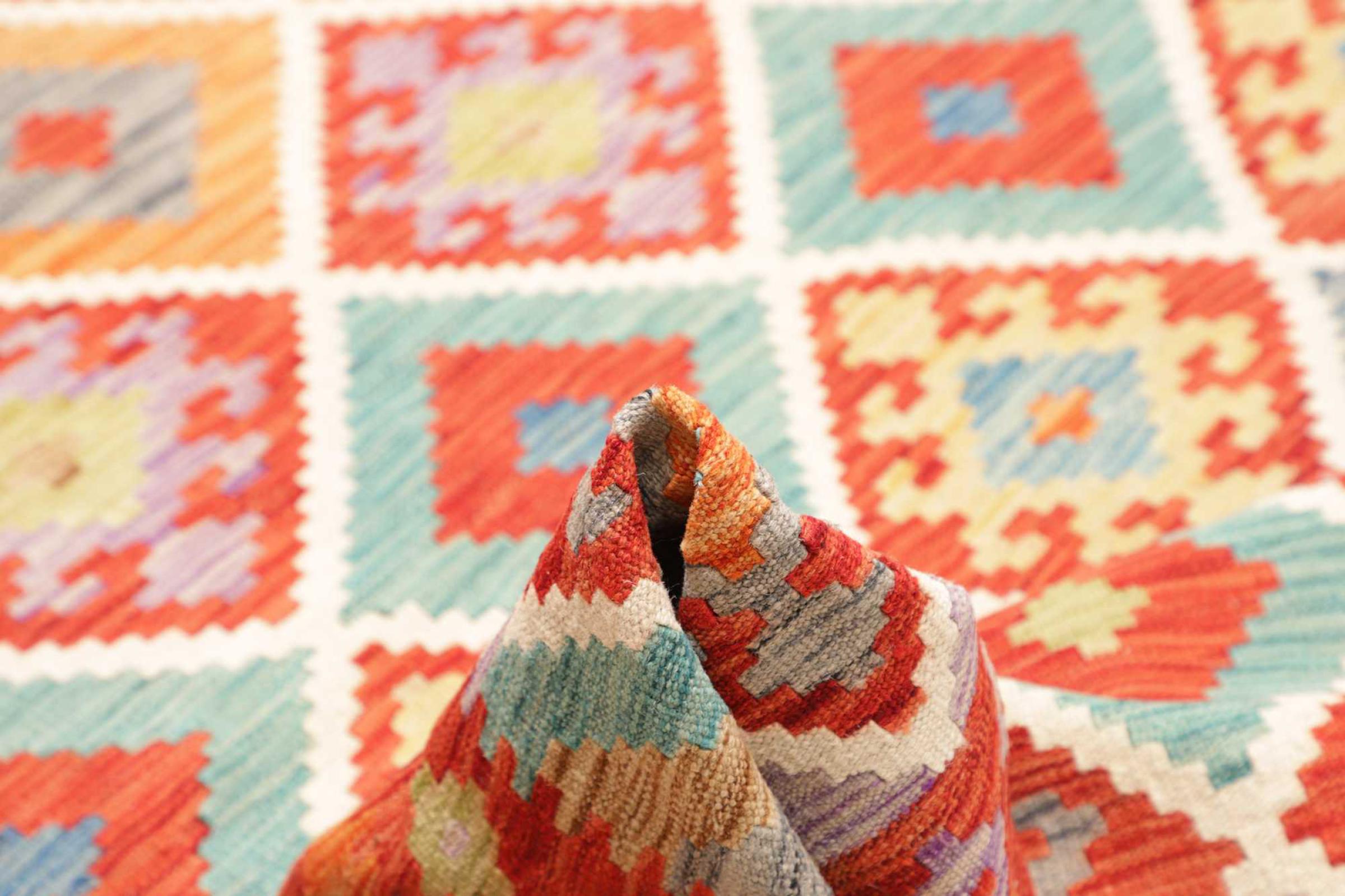 This rug was made as a flat weave by hand on a loom. Flatweave is the term used to describe rugs that have no pile. As the name promises, these rugs are woven and not knotted. This results in a flat rug with a structured surface. Flatweaves are not as soft and usually thinner than knotted rugs. At the same time they are much less complex to manufacture and can usually be laid out from both sides (front and back). Their patterns are usually geometric, which is determined by the fabric.