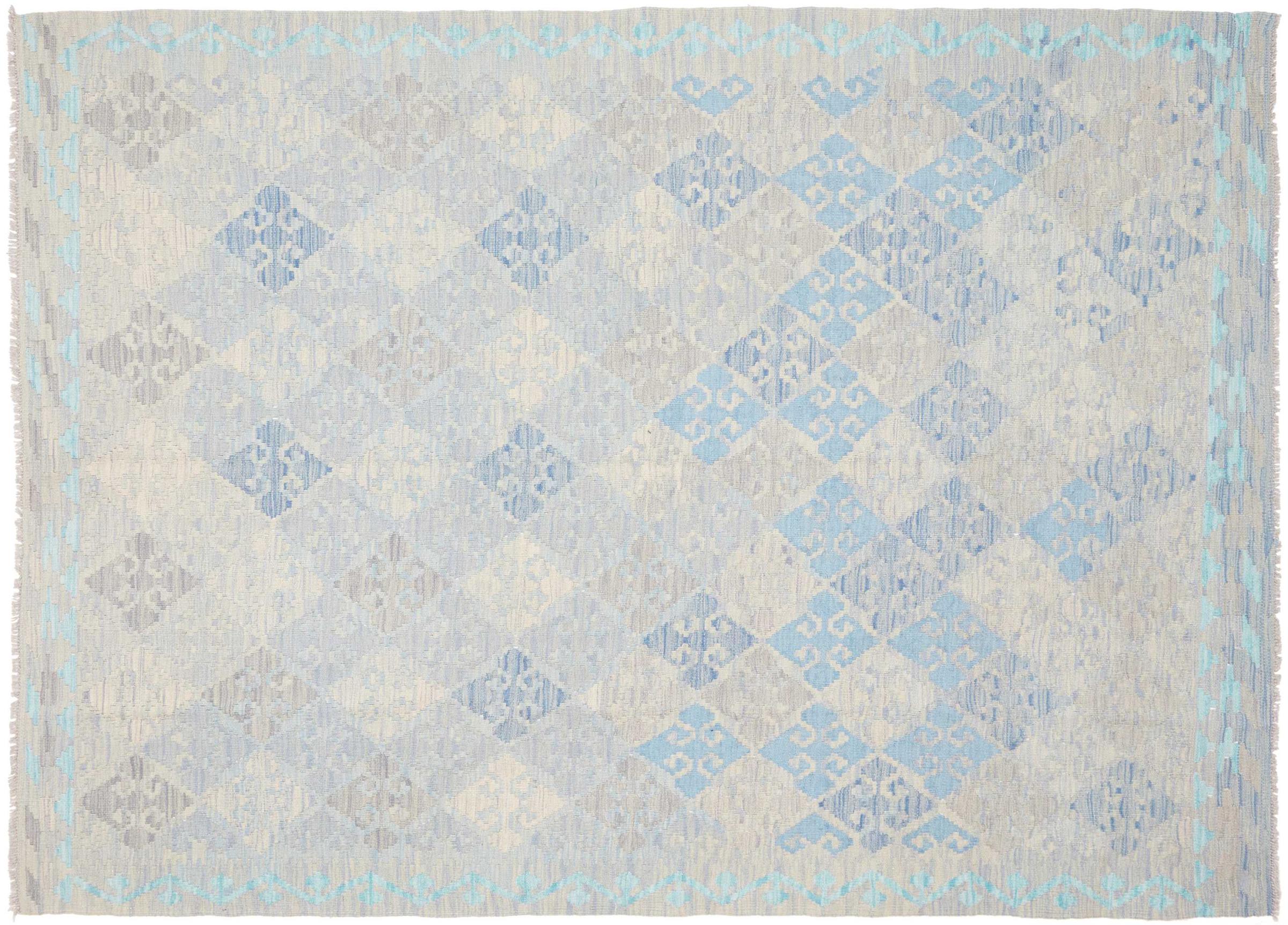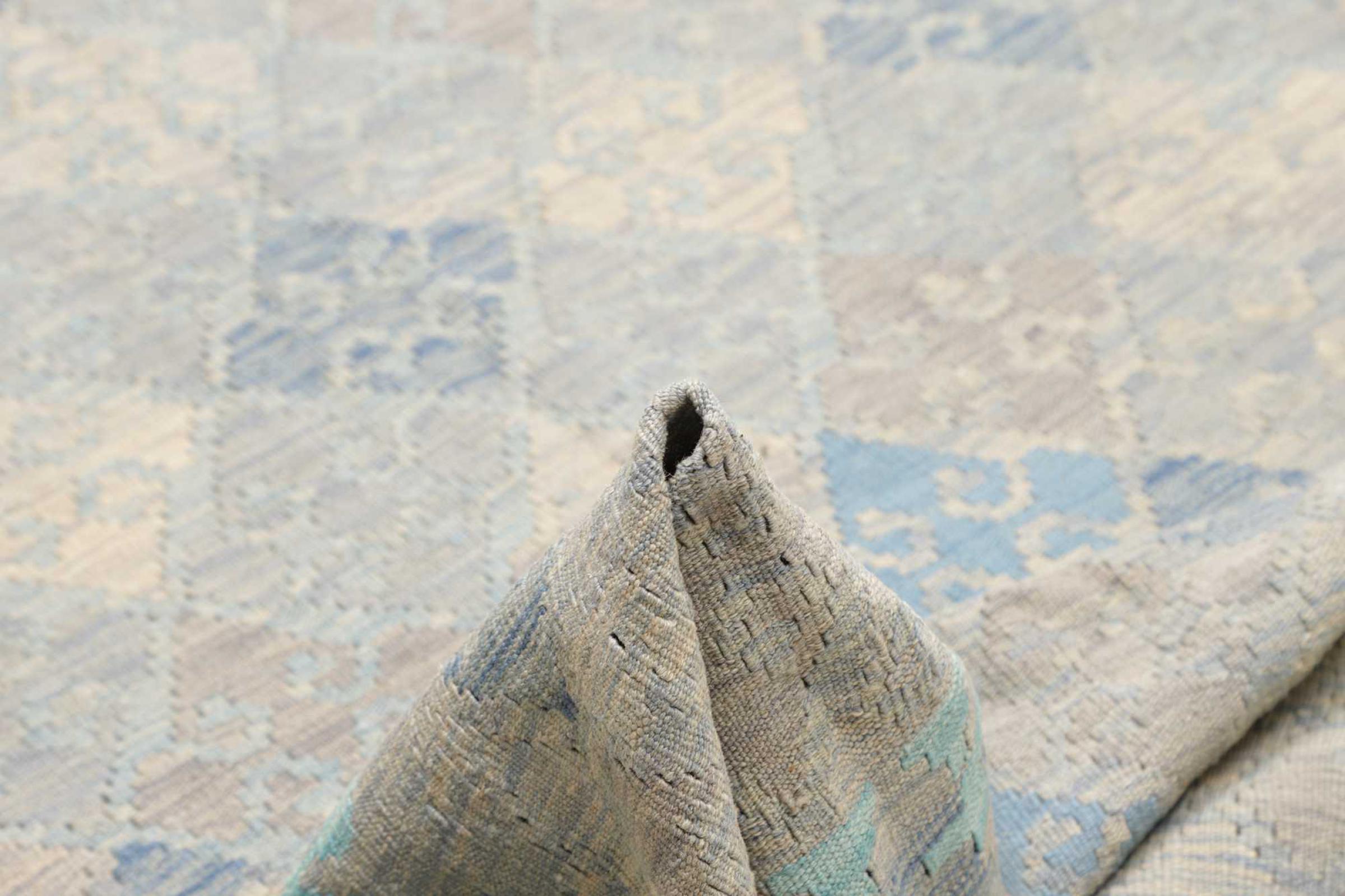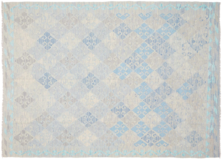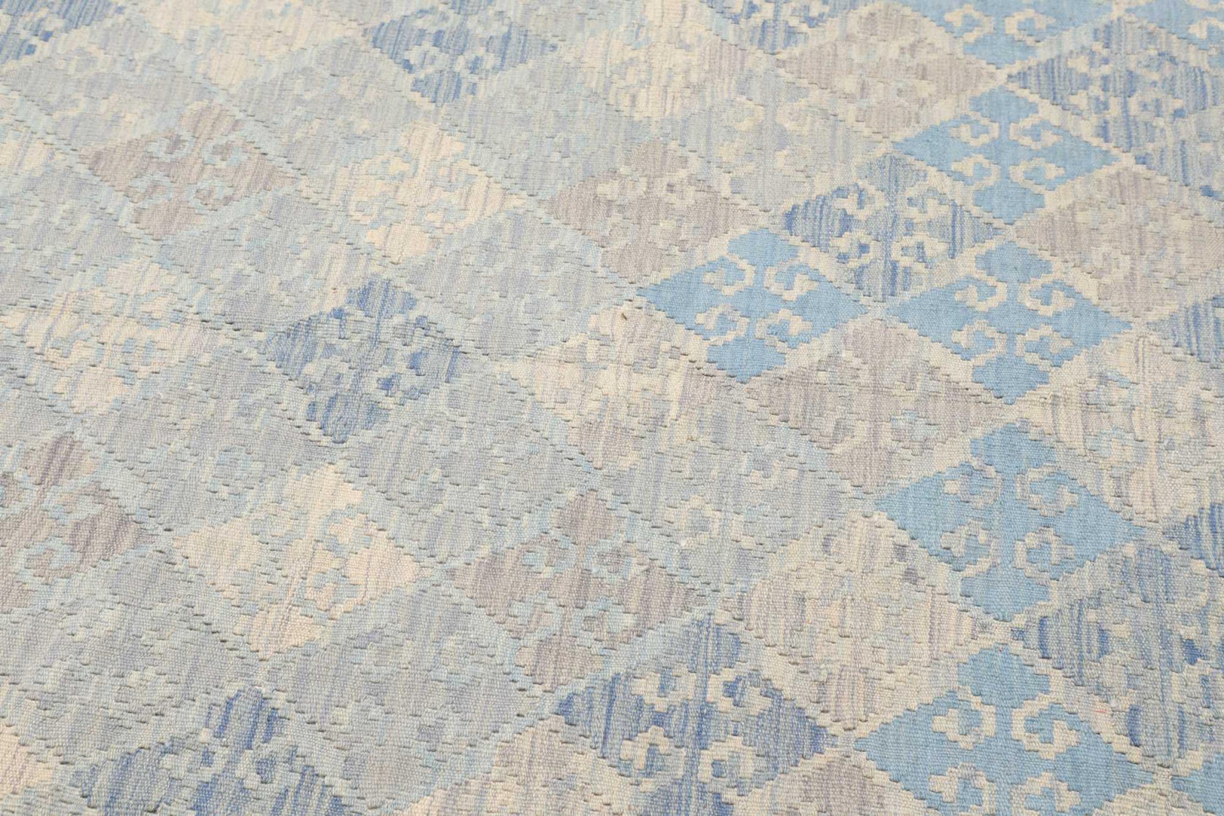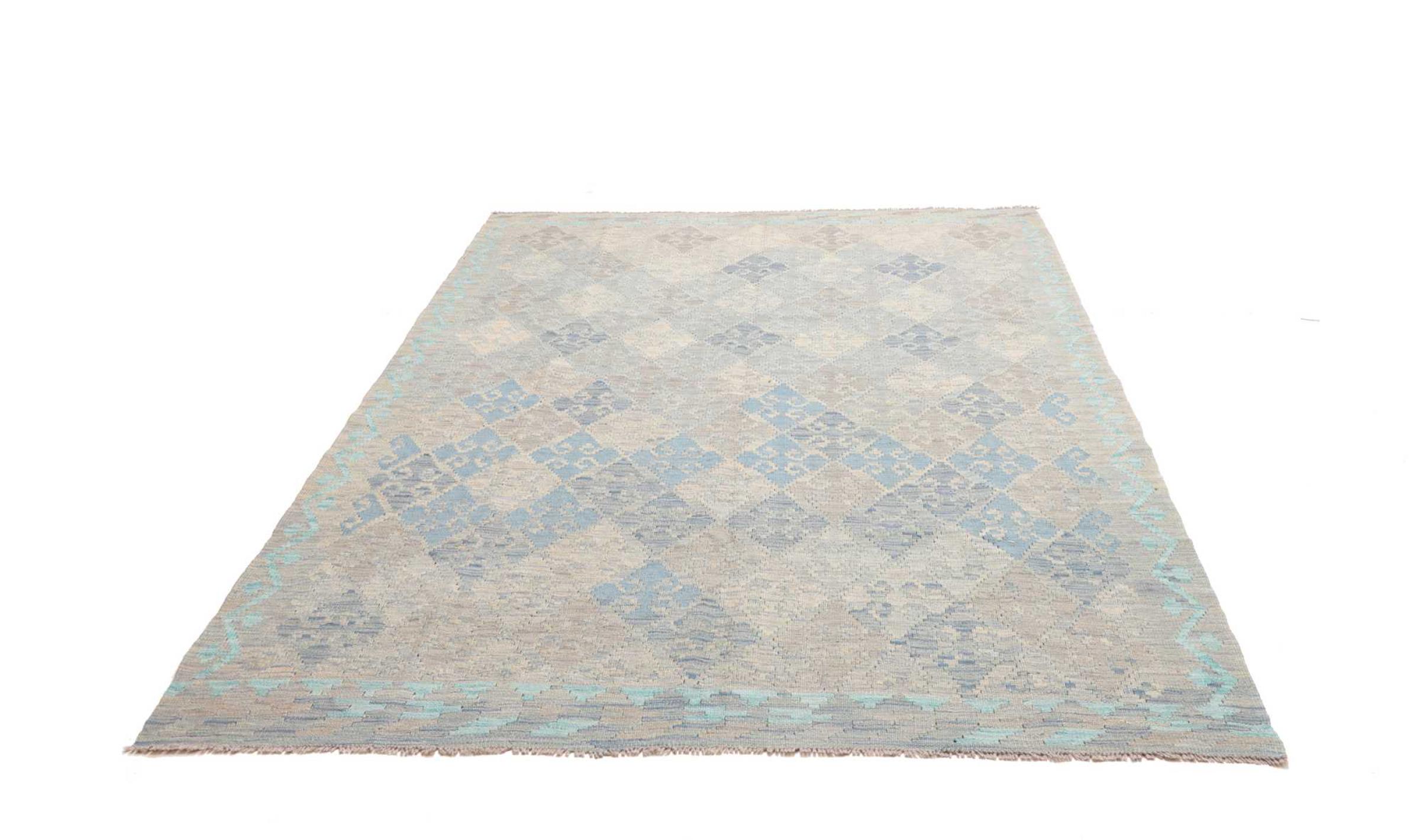 This rug was made as a flat weave by hand on a loom. Flatweave is the term used to describe rugs that have no pile. As the name promises, these rugs are woven and not knotted. This results in a flat rug with a structured surface. Flatweaves are not as soft and usually thinner than knotted rugs. At the same time they are much less complex to manufacture and can usually be laid out from both sides (front and back). Their patterns are usually geometric, which is determined by the fabric.