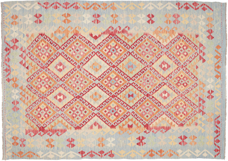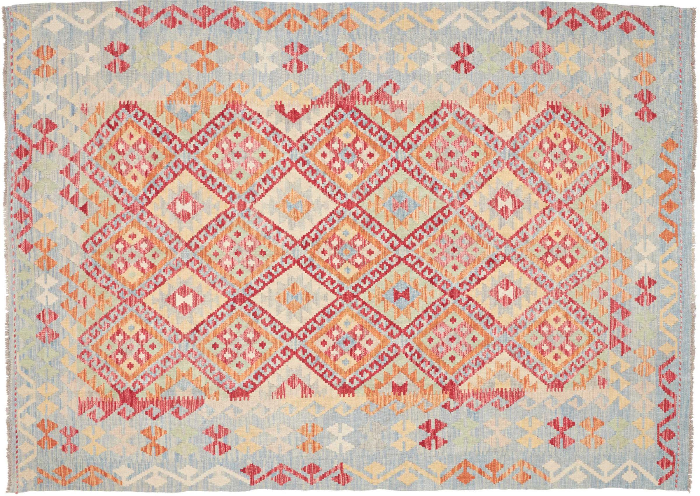 This rug was made as a flat weave by hand on a loom. Flatweave is the term used to describe rugs that have no pile. As the name promises, these rugs are woven and not knotted. This results in a flat rug with a structured surface. Flatweaves are not as soft and usually thinner than knotted rugs. At the same time they are much less complex to manufacture and can usually be laid out from both sides (front and back). Their patterns are usually geometric, which is determined by the fabric.