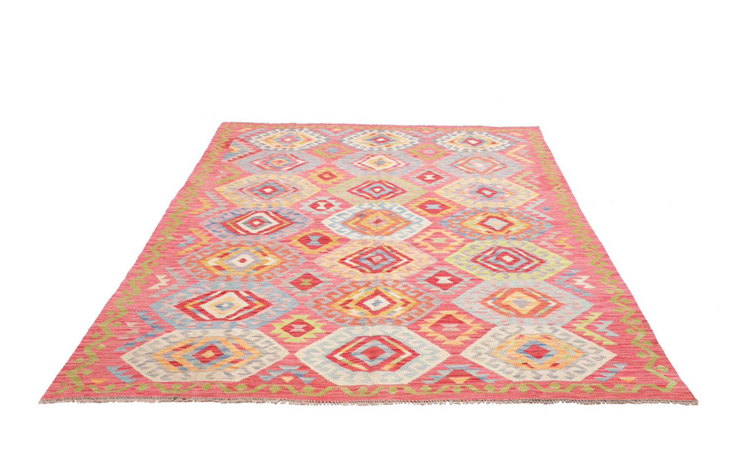 This rug was made as a flat weave by hand on a loom. Flatweave is the term used to describe rugs that have no pile. As the name promises, these rugs are woven and not knotted. This results in a flat rug with a structured surface. Flatweaves are not as soft and usually thinner than knotted rugs. At the same time they are much less complex to manufacture and can usually be laid out from both sides (front and back). Their patterns are usually geometric, which is determined by the fabric.