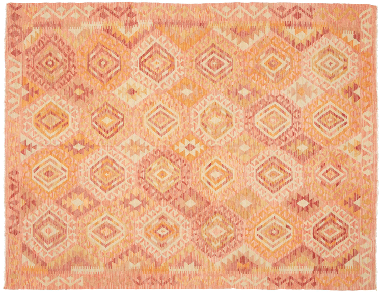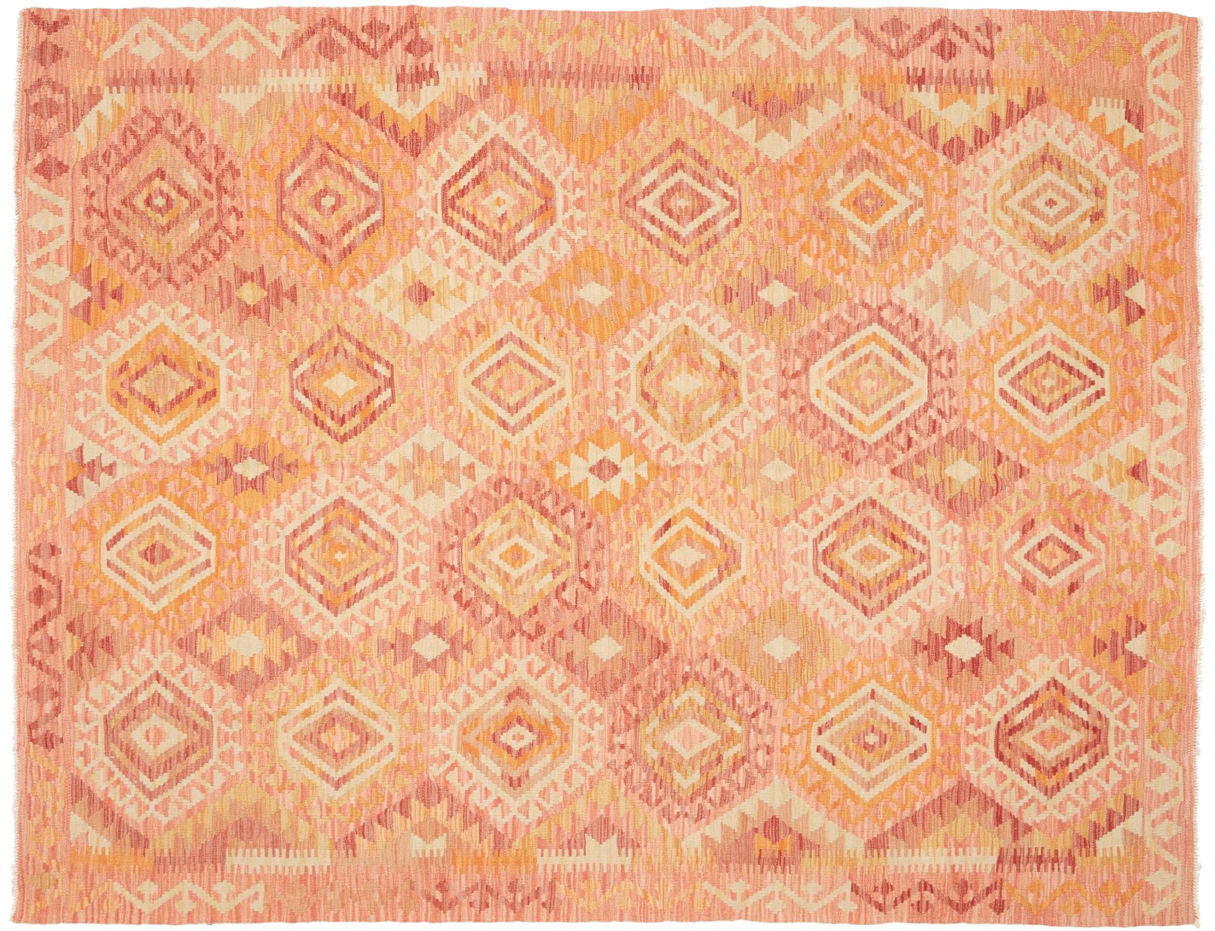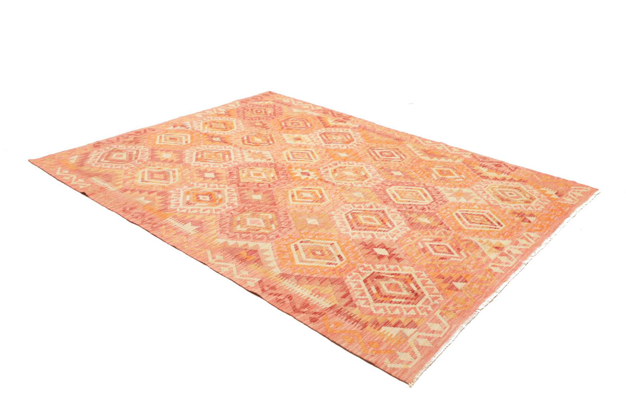 This rug was made as a flat weave by hand on a loom. Flatweave is the term used to describe rugs that have no pile. As the name promises, these rugs are woven and not knotted. This results in a flat rug with a structured surface. Flatweaves are not as soft and usually thinner than knotted rugs. At the same time they are much less complex to manufacture and can usually be laid out from both sides (front and back). Their patterns are usually geometric, which is determined by the fabric.