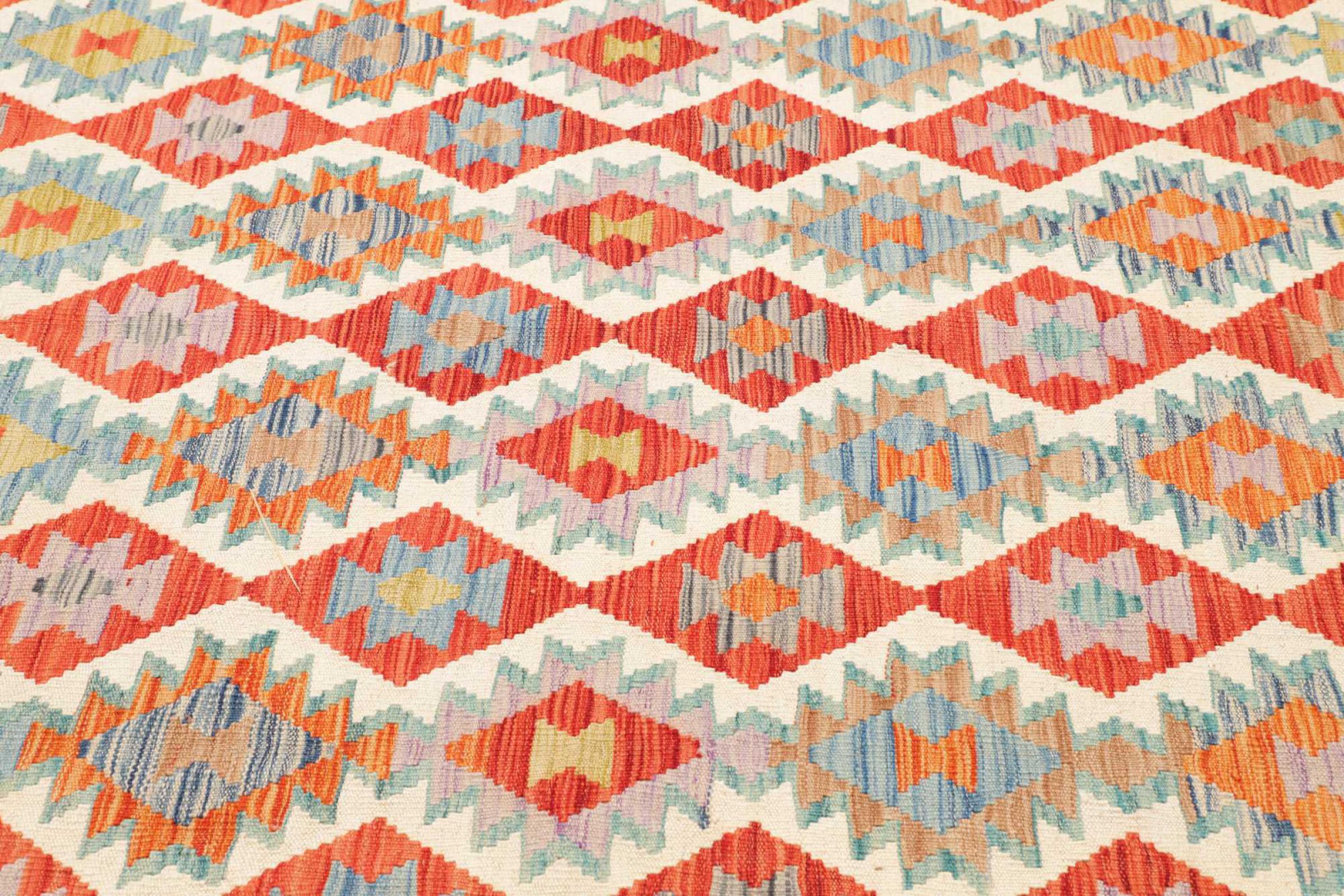 This rug was made as a flat weave by hand on a loom. Flatweave is the term used to describe rugs that have no pile. As the name promises, these rugs are woven and not knotted. This results in a flat rug with a structured surface. Flatweaves are not as soft and usually thinner than knotted rugs. At the same time they are much less complex to manufacture and can usually be laid out from both sides (front and back). Their patterns are usually geometric, which is determined by the fabric.