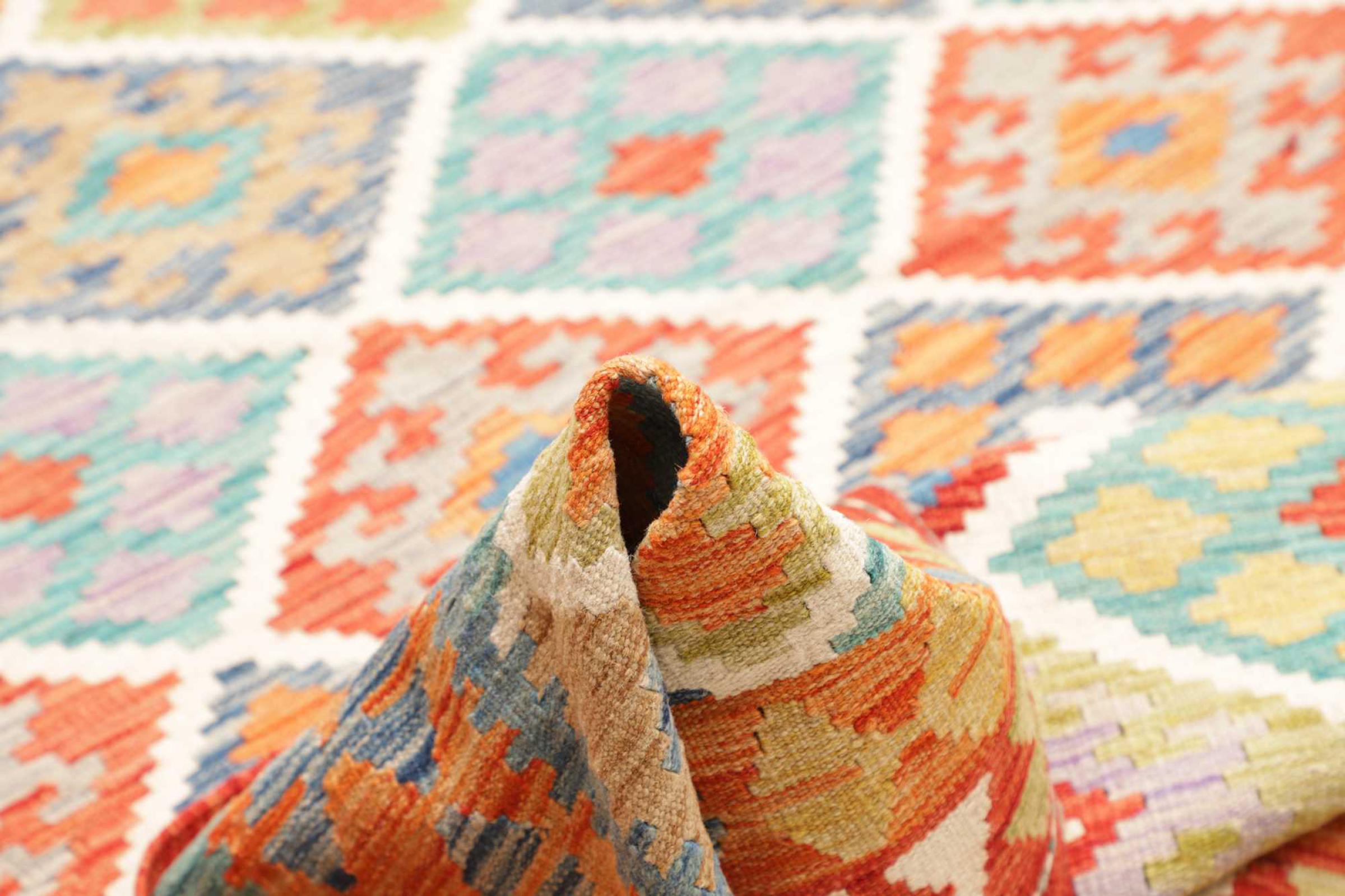 This rug was made as a flat weave by hand on a loom. Flatweave is the term used to describe rugs that have no pile. As the name promises, these rugs are woven and not knotted. This results in a flat rug with a structured surface. Flatweaves are not as soft and usually thinner than knotted rugs. At the same time they are much less complex to manufacture and can usually be laid out from both sides (front and back). Their patterns are usually geometric, which is determined by the fabric.