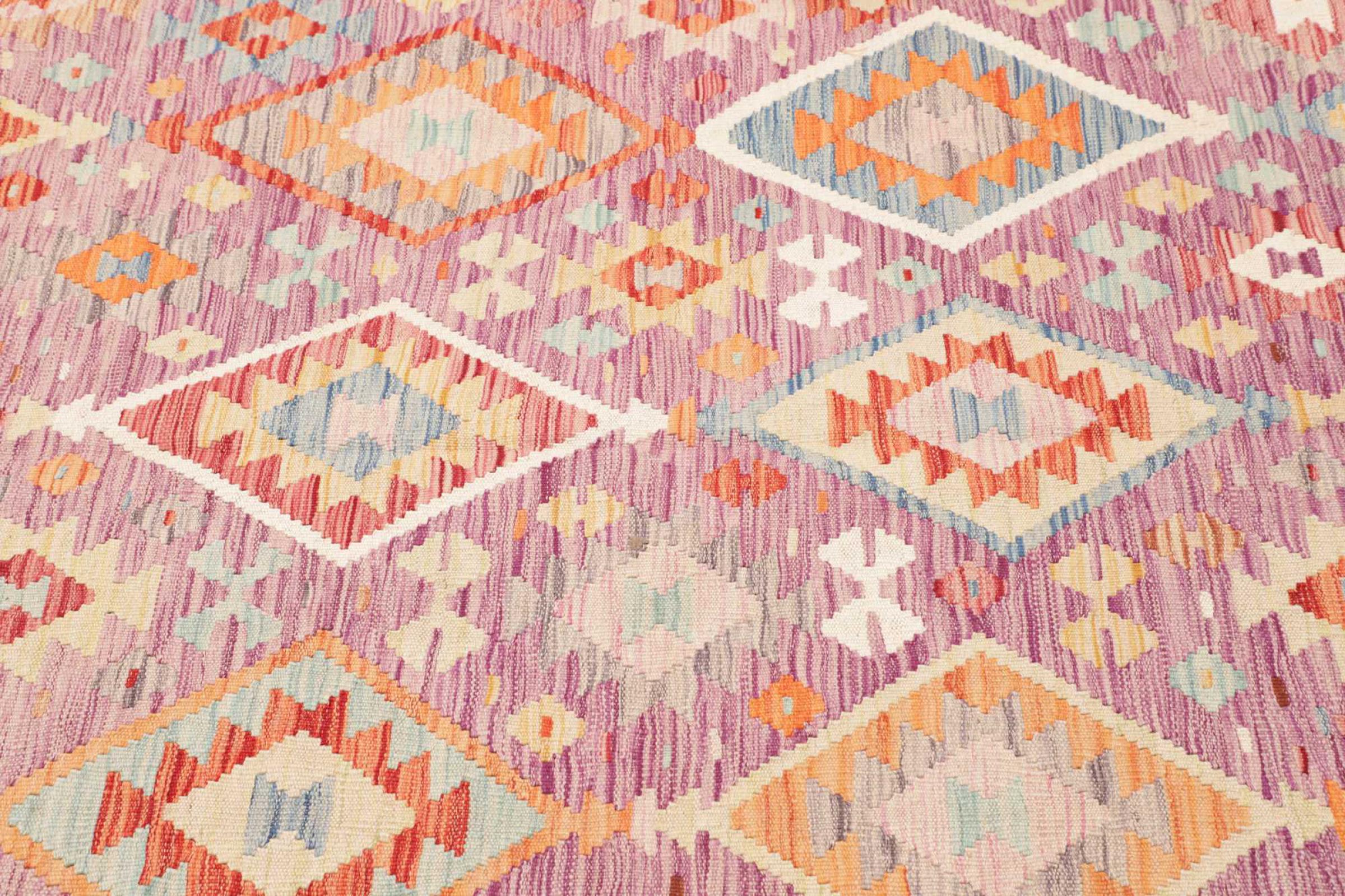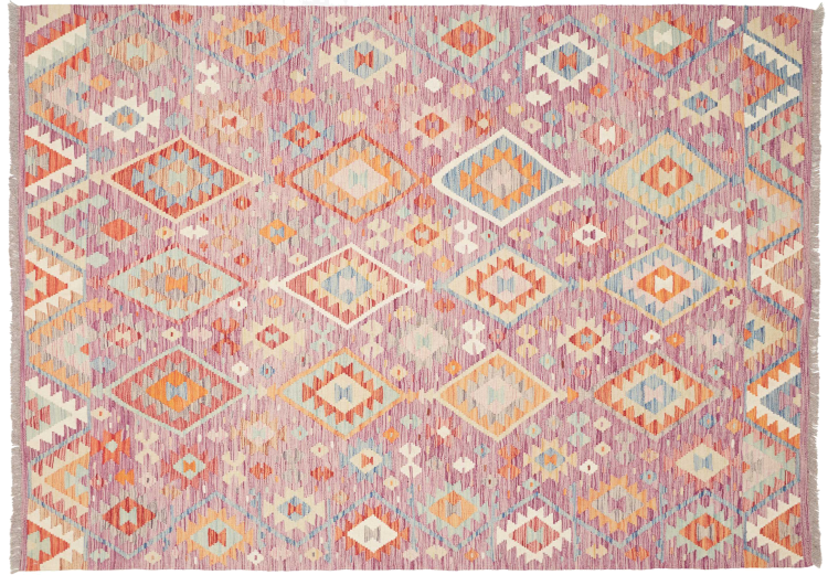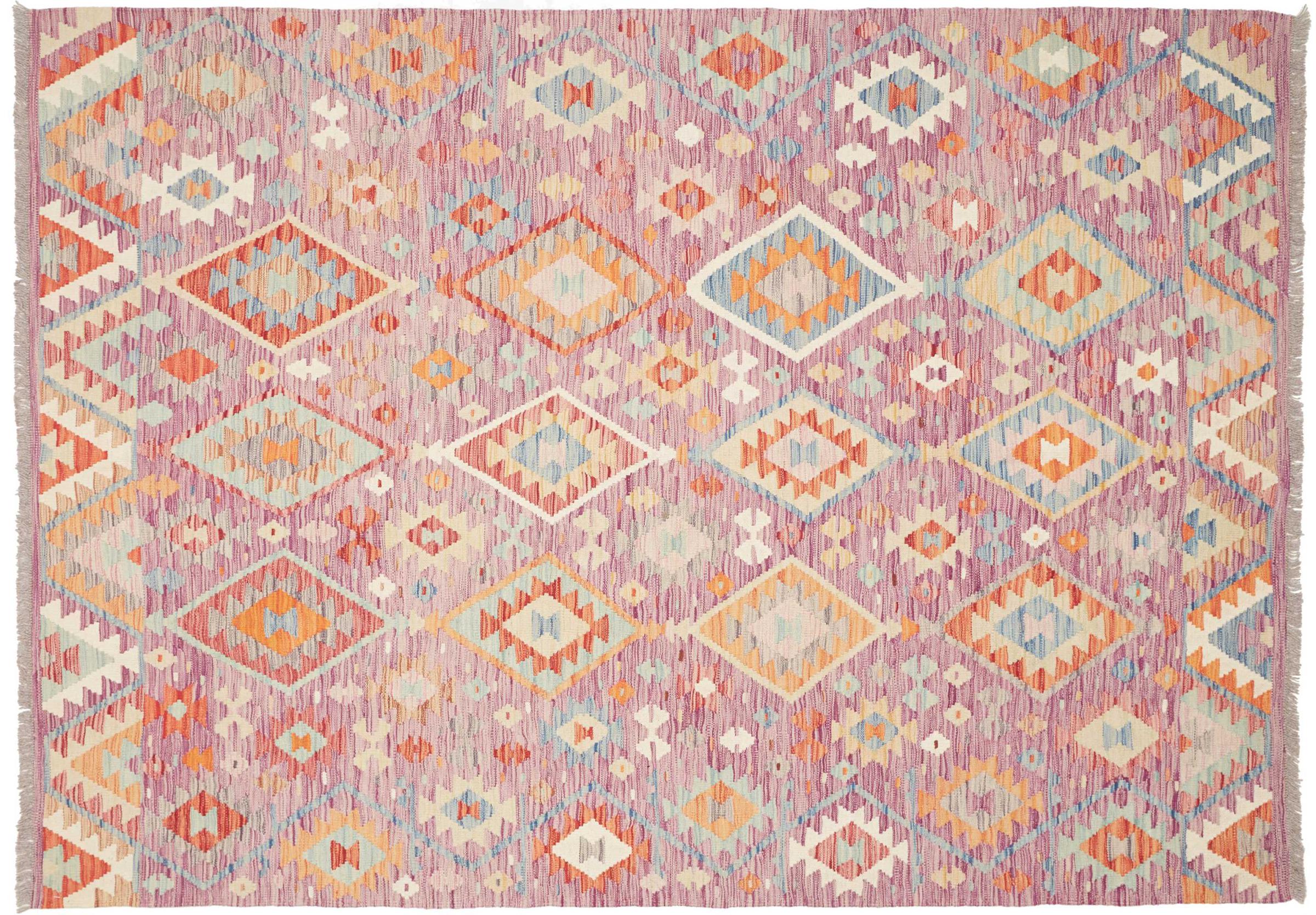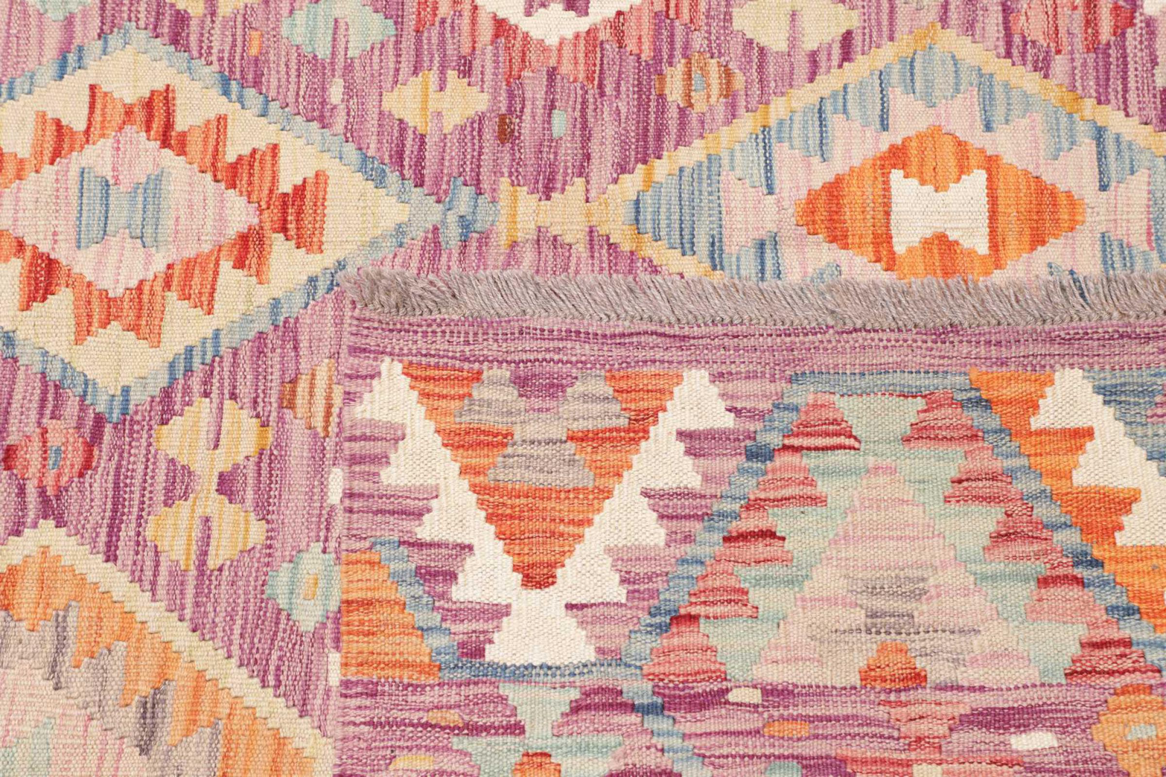 This rug was made as a flat weave by hand on a loom. Flatweave is the term used to describe rugs that have no pile. As the name promises, these rugs are woven and not knotted. This results in a flat rug with a structured surface. Flatweaves are not as soft and usually thinner than knotted rugs. At the same time they are much less complex to manufacture and can usually be laid out from both sides (front and back). Their patterns are usually geometric, which is determined by the fabric.