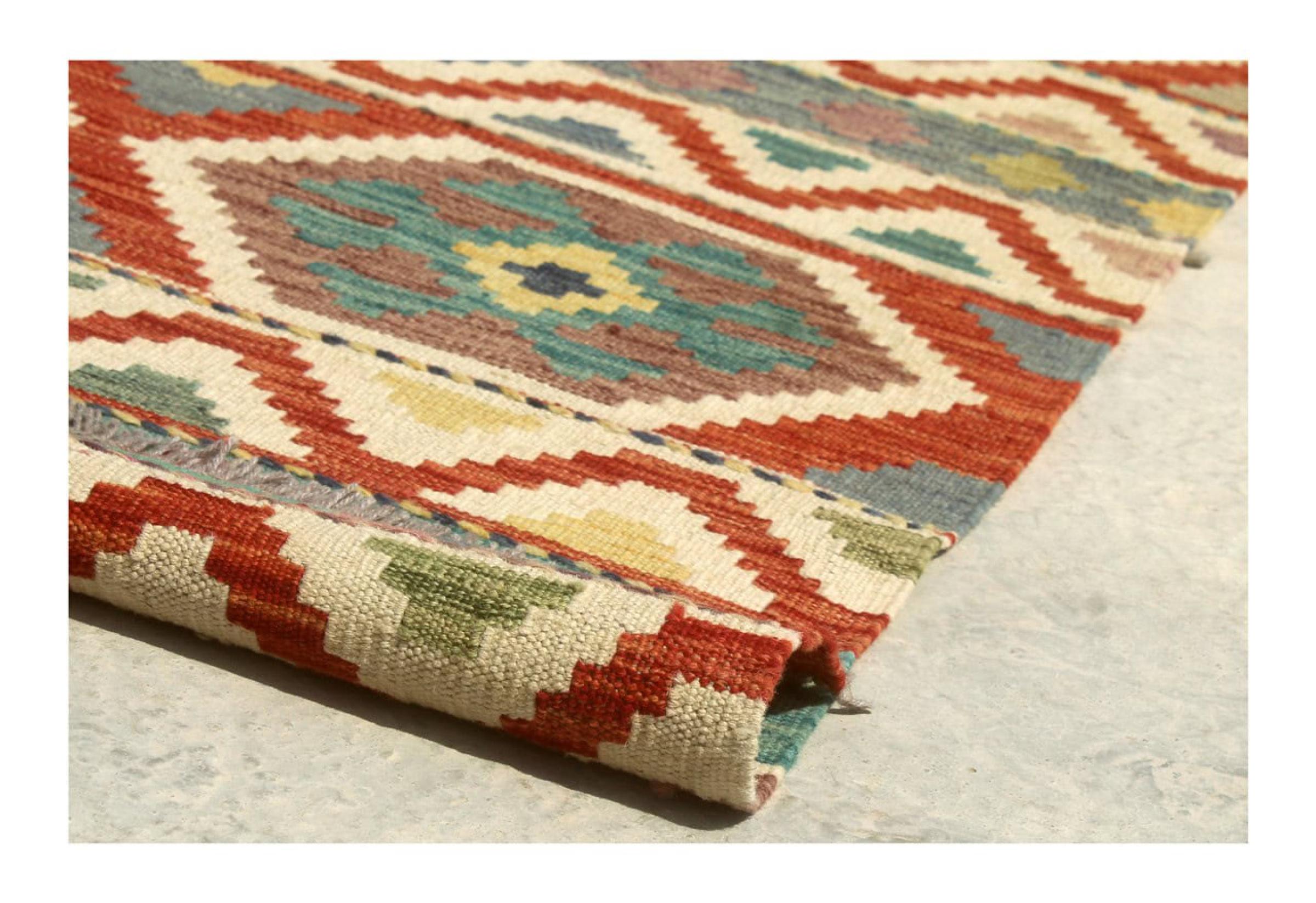 This rug was made as a flat weave by hand on a loom. Flatweave is the term used to describe rugs that have no pile. As the name promises, these rugs are woven and not knotted. This results in a flat rug with a structured surface. Flatweaves are not as soft and usually thinner than knotted rugs. At the same time they are much less complex to manufacture and can usually be laid out from both sides (front and back). Their patterns are usually geometric, which is determined by the fabric.