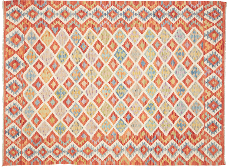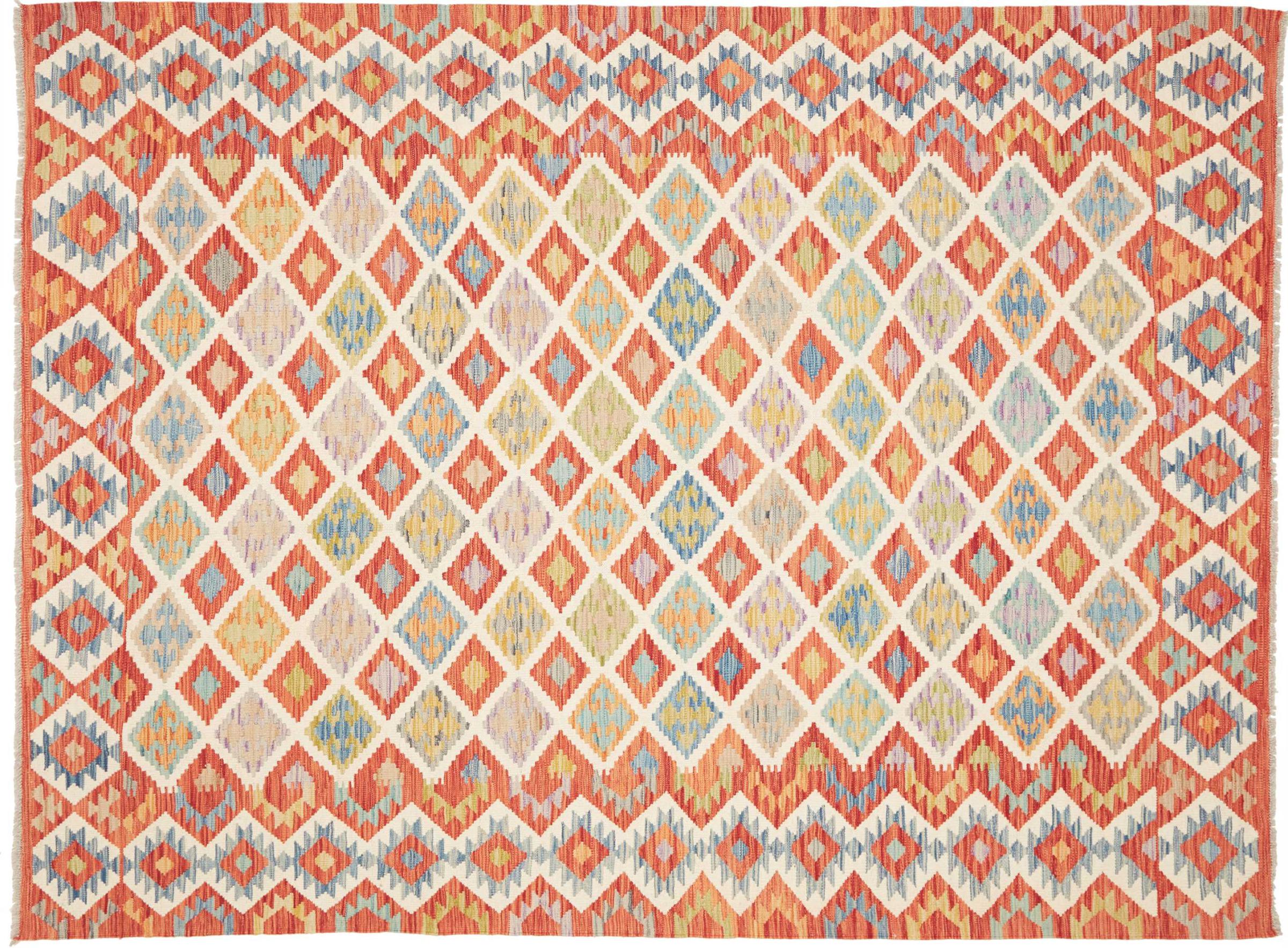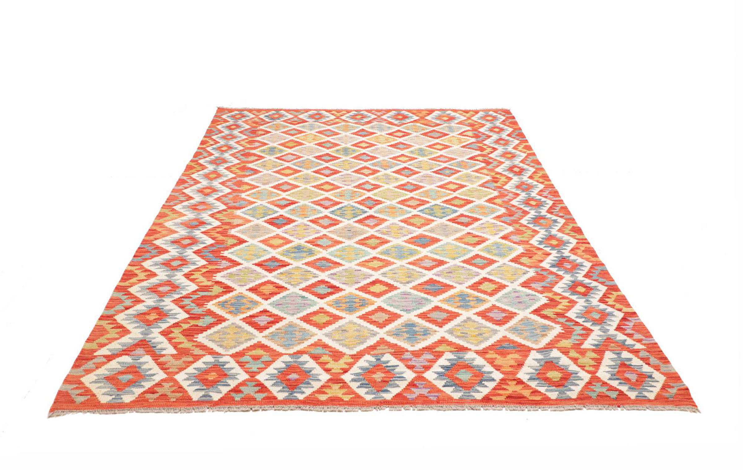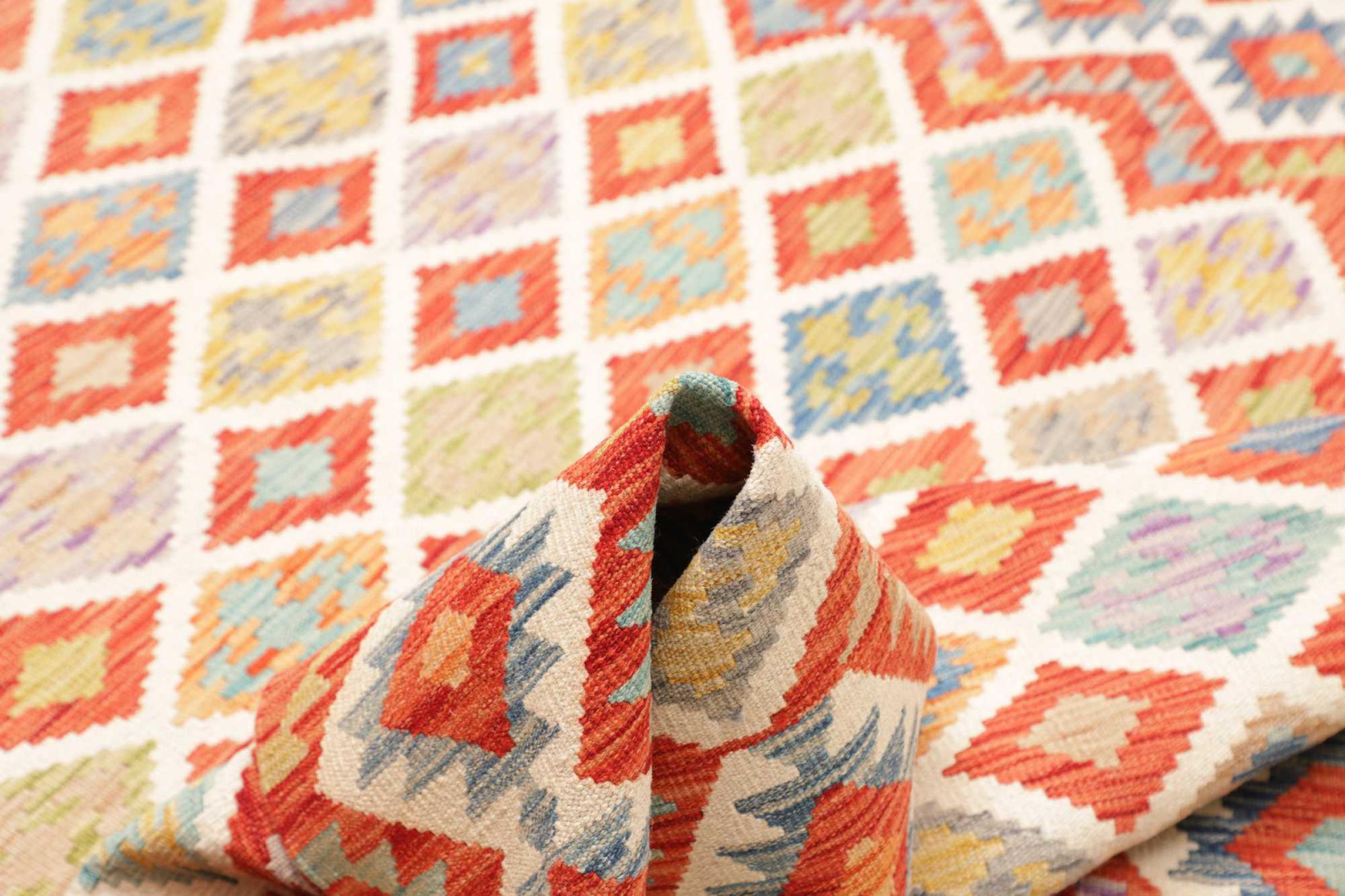 This rug was made as a flat weave by hand on a loom. Flatweave is the term used to describe rugs that have no pile. As the name promises, these rugs are woven and not knotted. This results in a flat rug with a structured surface. Flatweaves are not as soft and usually thinner than knotted rugs. At the same time they are much less complex to manufacture and can usually be laid out from both sides (front and back). Their patterns are usually geometric, which is determined by the fabric.