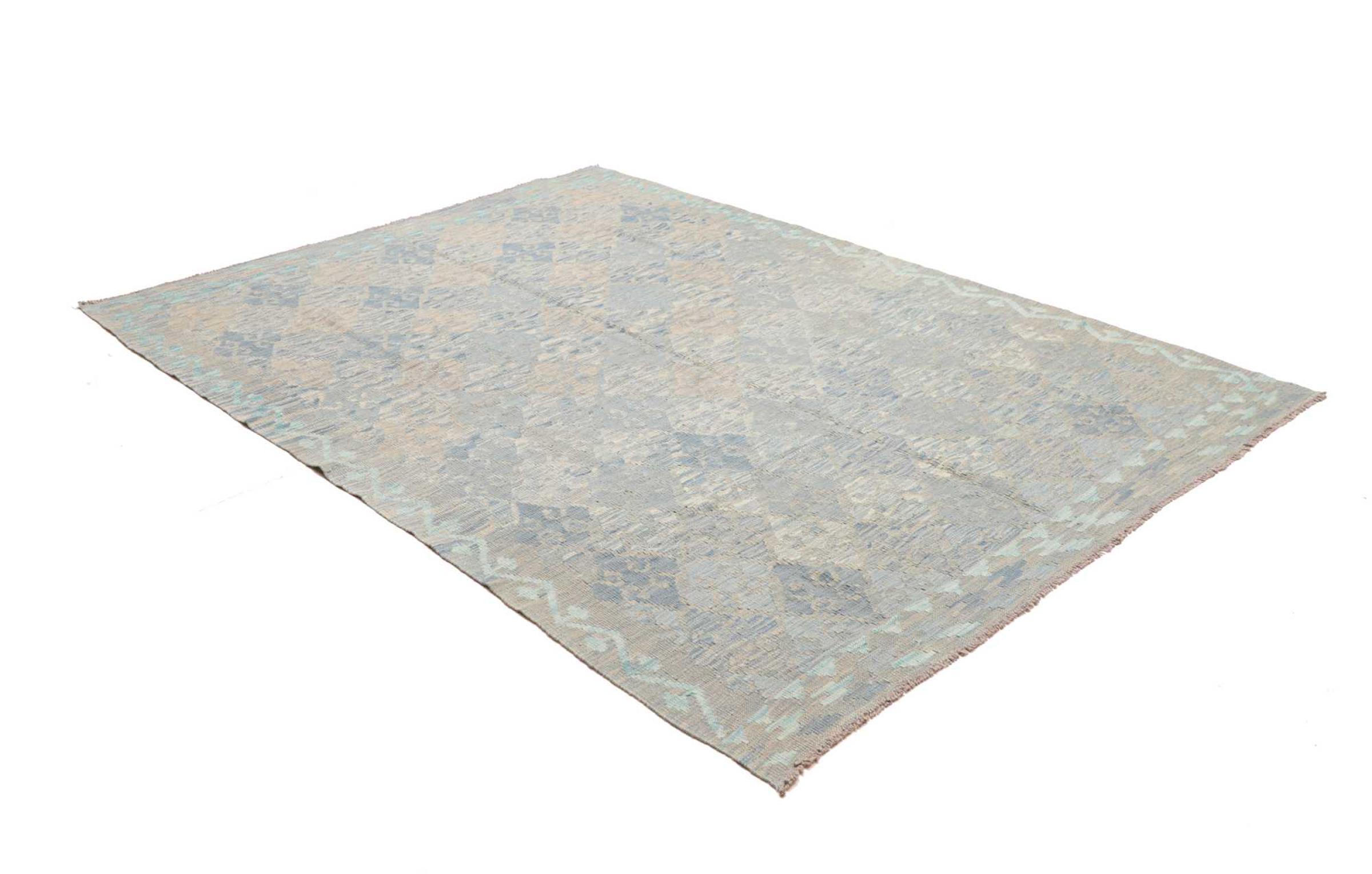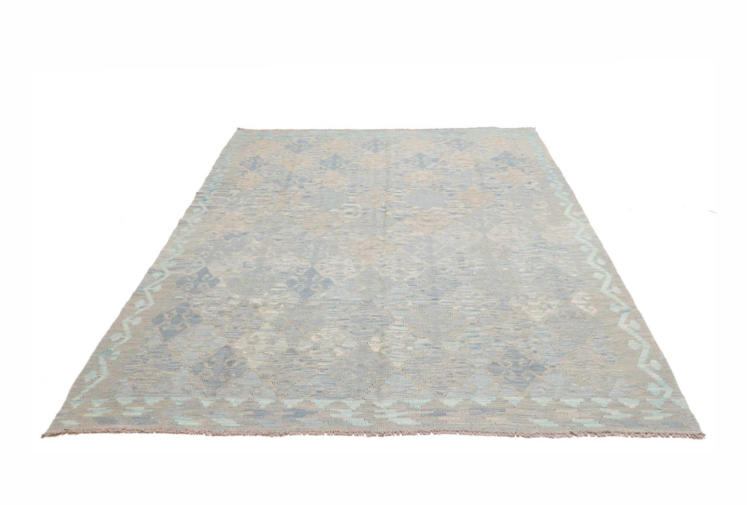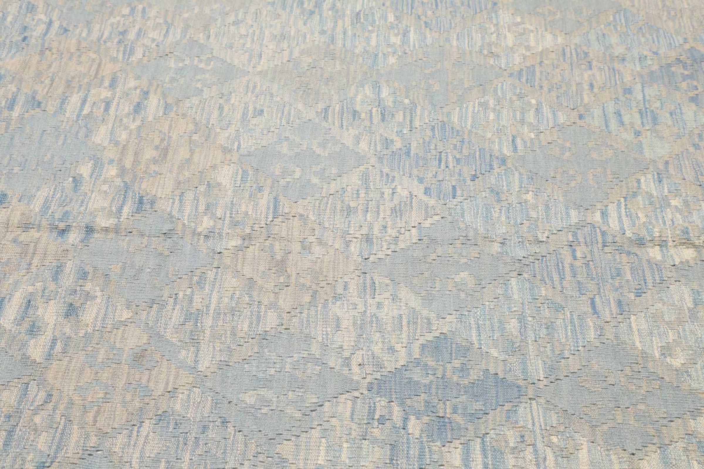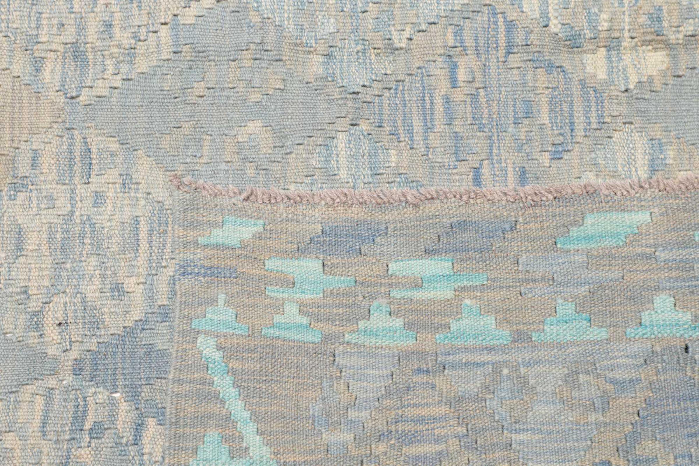 This rug was made as a flat weave by hand on a loom. Flatweave is the term used to describe rugs that have no pile. As the name promises, these rugs are woven and not knotted. This results in a flat rug with a structured surface. Flatweaves are not as soft and usually thinner than knotted rugs. At the same time they are much less complex to manufacture and can usually be laid out from both sides (front and back). Their patterns are usually geometric, which is determined by the fabric.