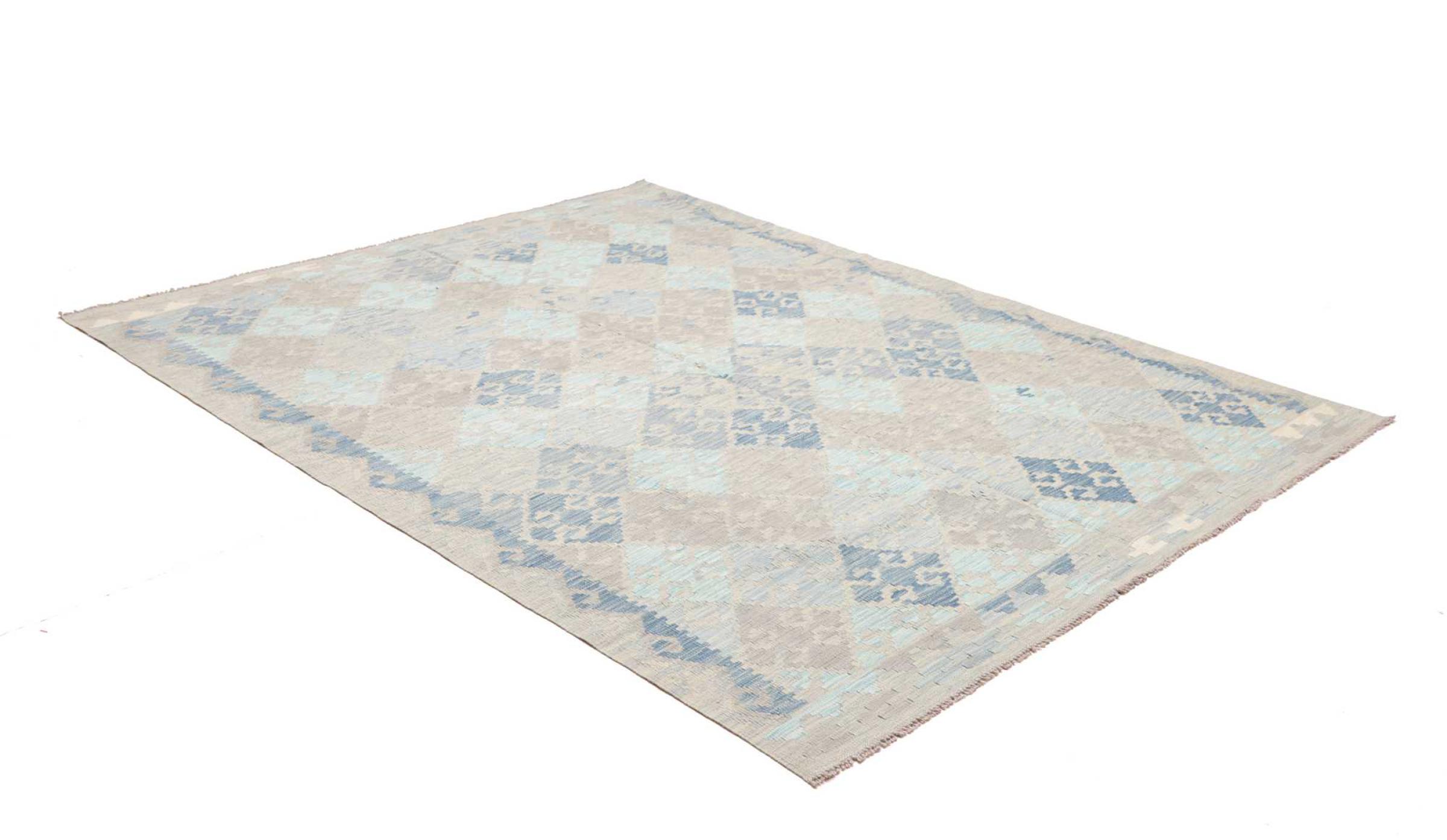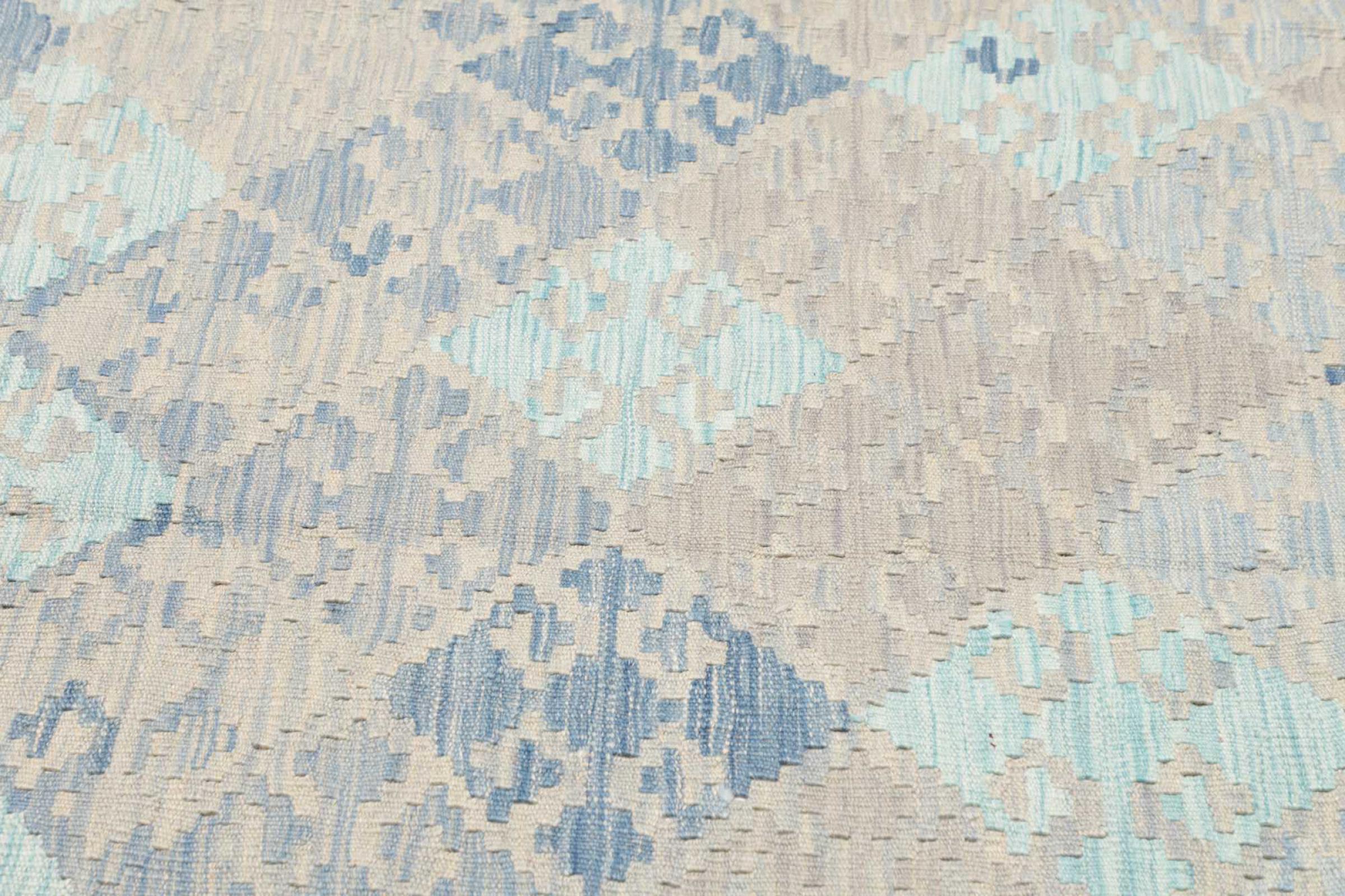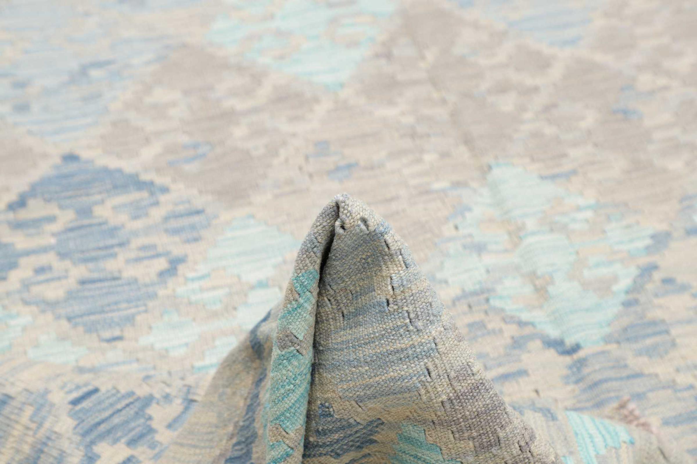 This rug was made as a flat weave by hand on a loom. Flatweave is the term used to describe rugs that have no pile. As the name promises, these rugs are woven and not knotted. This results in a flat rug with a structured surface. Flatweaves are not as soft and usually thinner than knotted rugs. At the same time they are much less complex to manufacture and can usually be laid out from both sides (front and back). Their patterns are usually geometric, which is determined by the fabric.