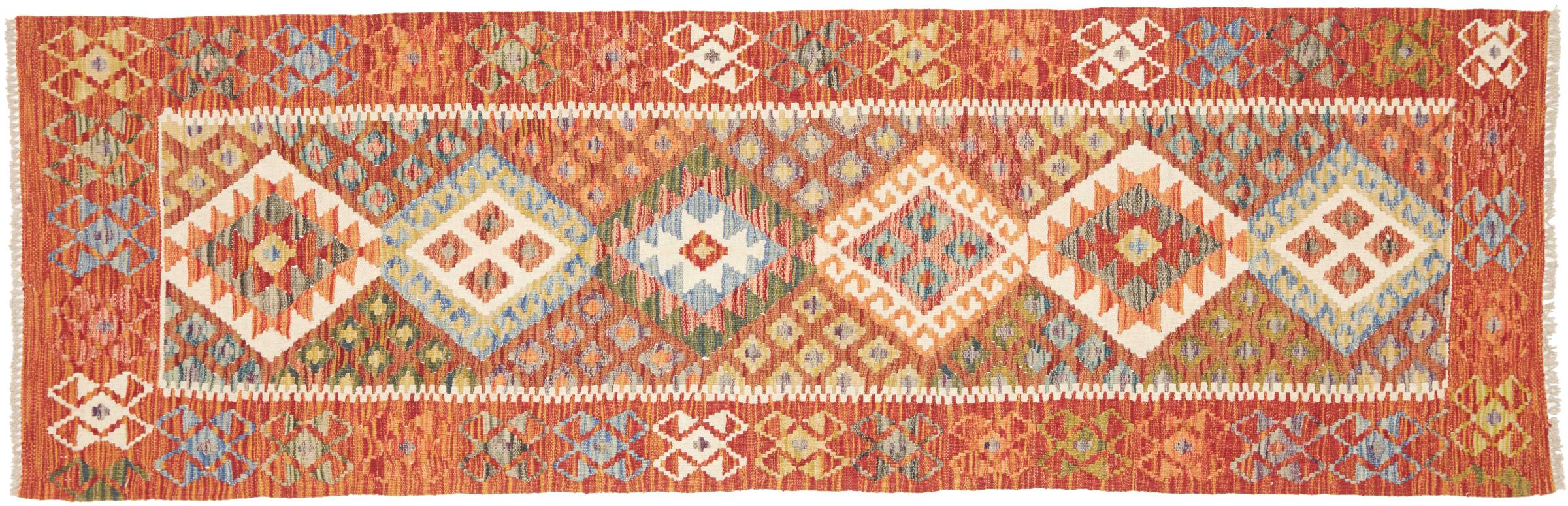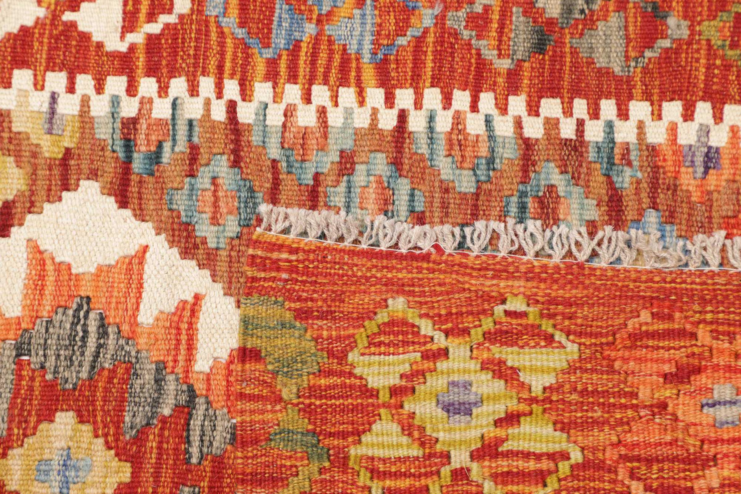 This rug was made as a flat weave by hand on a loom. Flatweave is the term used to describe rugs that have no pile. As the name promises, these rugs are woven and not knotted. This results in a flat rug with a structured surface. Flatweaves are not as soft and usually thinner than knotted rugs. At the same time they are much less complex to manufacture and can usually be laid out from both sides (front and back). Their patterns are usually geometric, which is determined by the fabric.