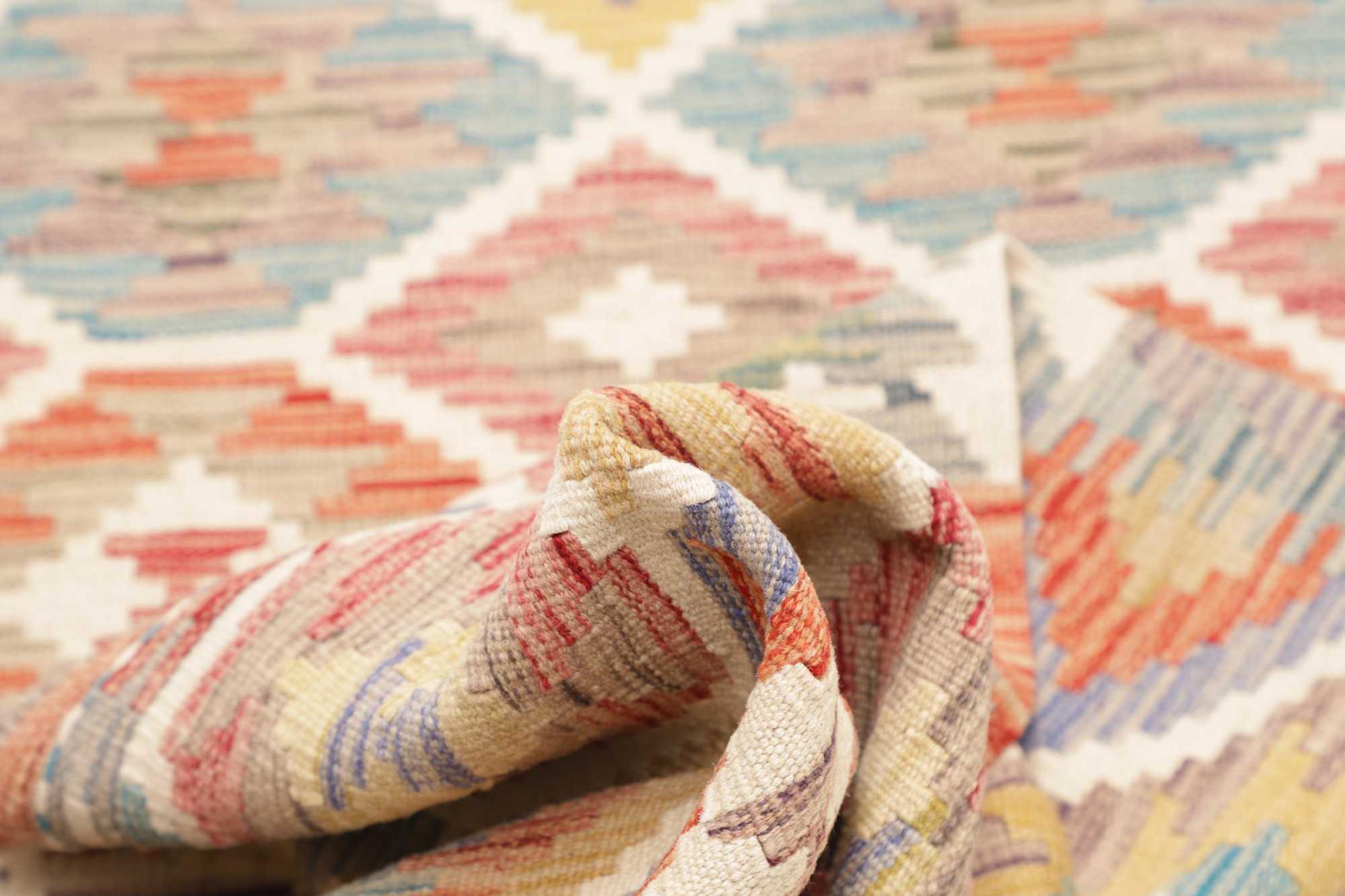 This rug was made as a flat weave by hand on a loom. Flatweave is the term used to describe rugs that have no pile. As the name promises, these rugs are woven and not knotted. This results in a flat rug with a structured surface. Flatweaves are not as soft and usually thinner than knotted rugs. At the same time they are much less complex to manufacture and can usually be laid out from both sides (front and back). Their patterns are usually geometric, which is determined by the fabric.