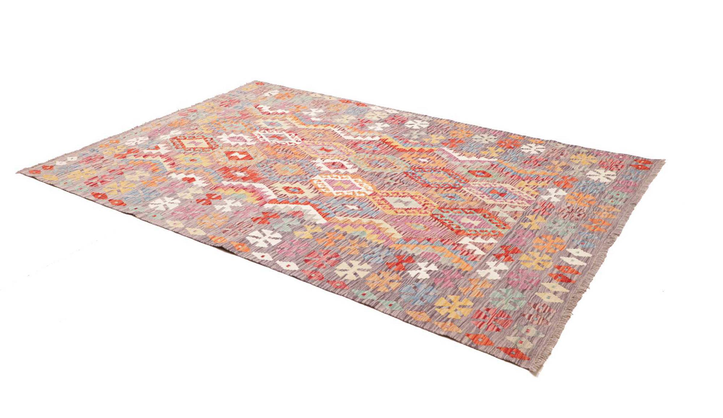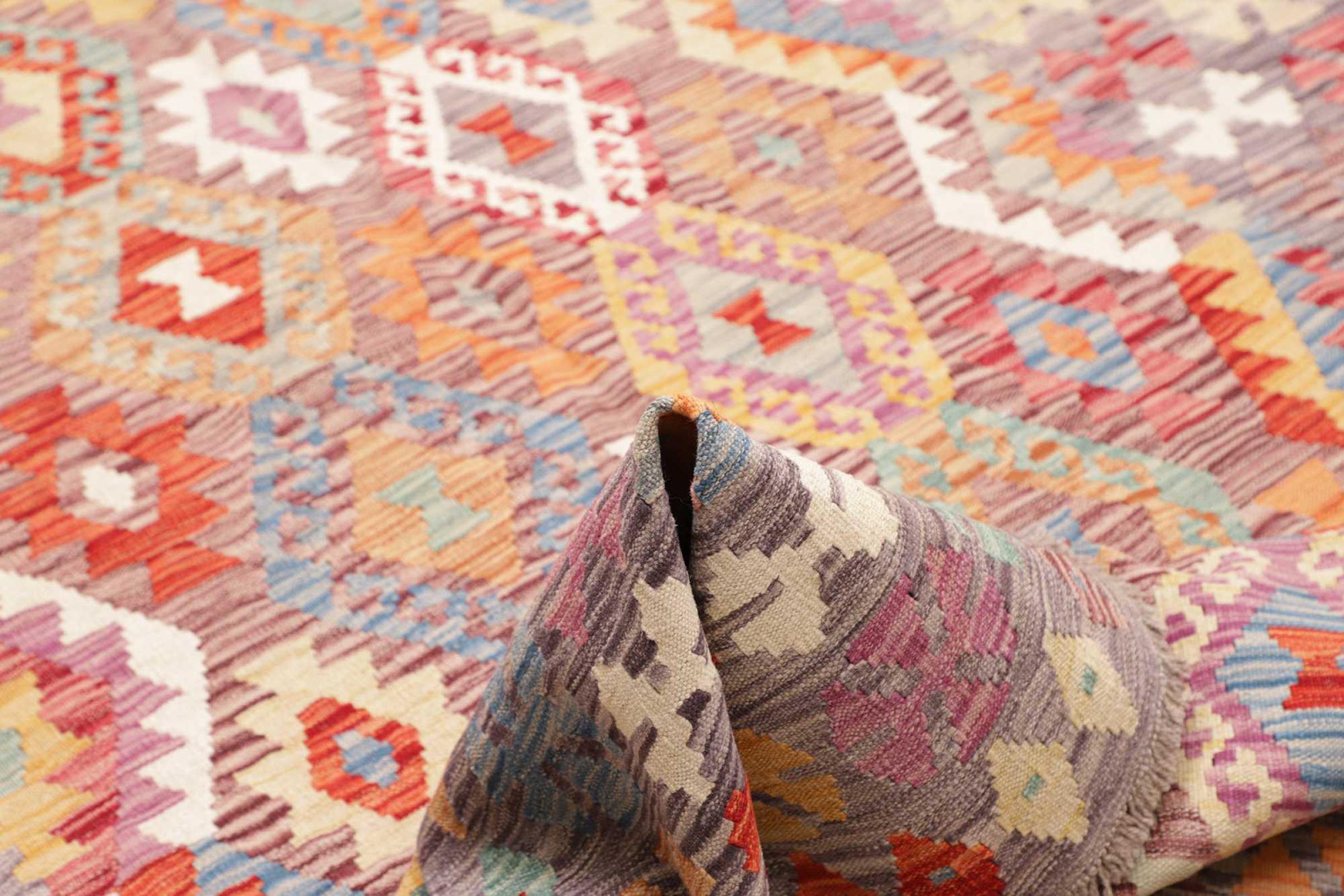 This rug was made as a flat weave by hand on a loom. Flatweave is the term used to describe rugs that have no pile. As the name promises, these rugs are woven and not knotted. This results in a flat rug with a structured surface. Flatweaves are not as soft and usually thinner than knotted rugs. At the same time they are much less complex to manufacture and can usually be laid out from both sides (front and back). Their patterns are usually geometric, which is determined by the fabric.