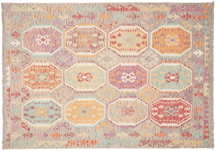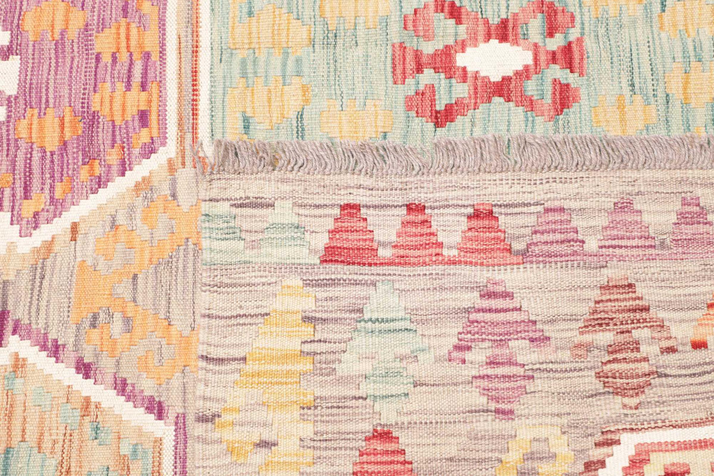 This rug was made as a flat weave by hand on a loom. Flatweave is the term used to describe rugs that have no pile. As the name promises, these rugs are woven and not knotted. This results in a flat rug with a structured surface. Flatweaves are not as soft and usually thinner than knotted rugs. At the same time they are much less complex to manufacture and can usually be laid out from both sides (front and back). Their patterns are usually geometric, which is determined by the fabric.