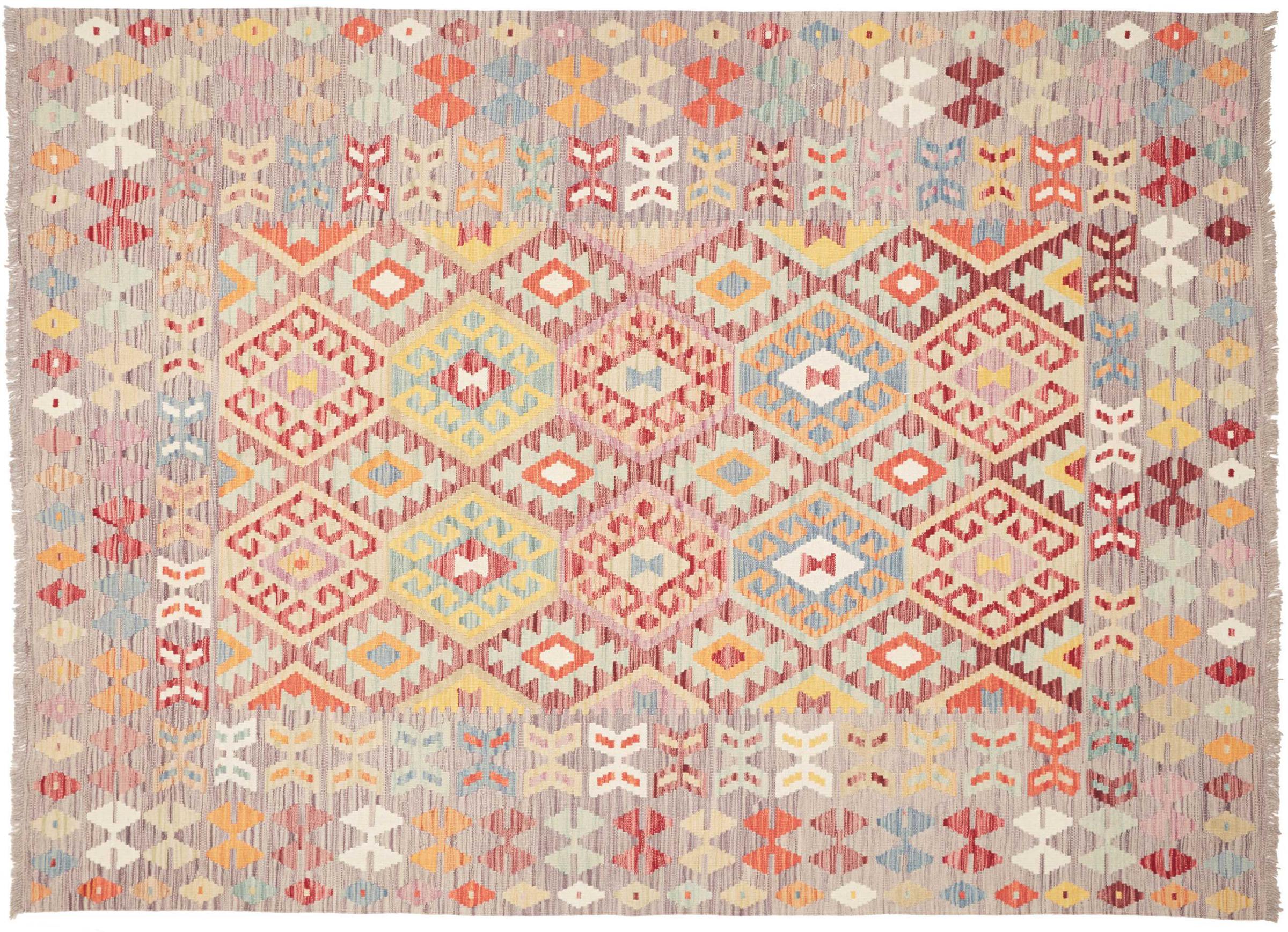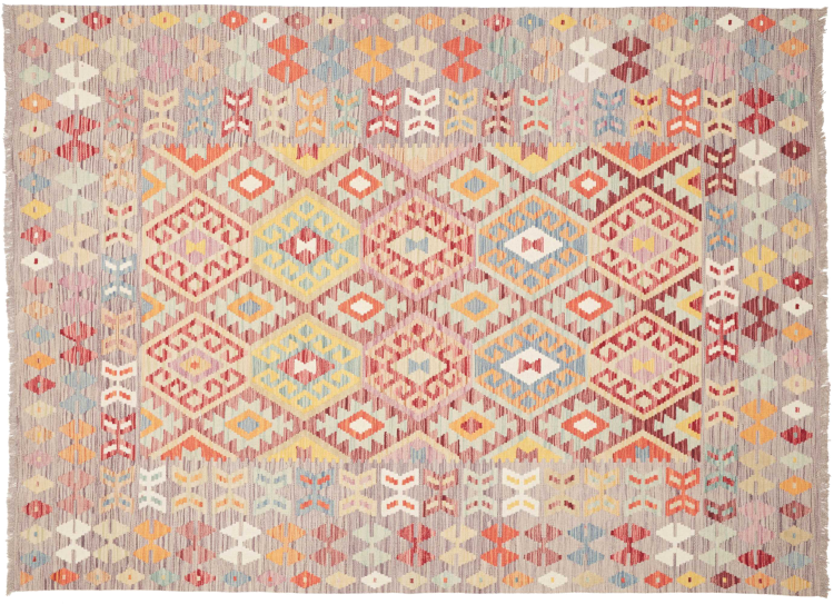 This rug was made as a flat weave by hand on a loom. Flatweave is the term used to describe rugs that have no pile. As the name promises, these rugs are woven and not knotted. This results in a flat rug with a structured surface. Flatweaves are not as soft and usually thinner than knotted rugs. At the same time they are much less complex to manufacture and can usually be laid out from both sides (front and back). Their patterns are usually geometric, which is determined by the fabric.
