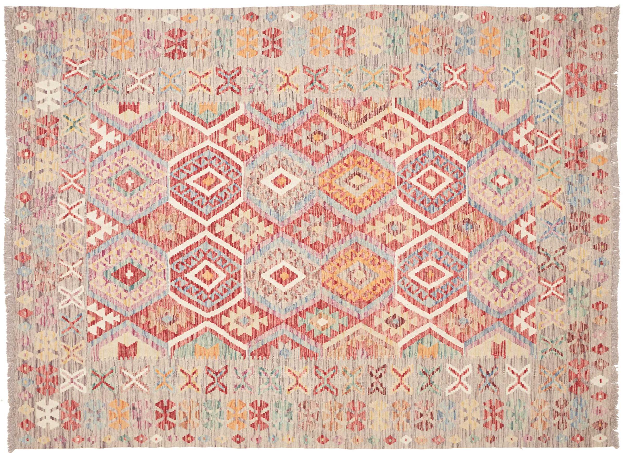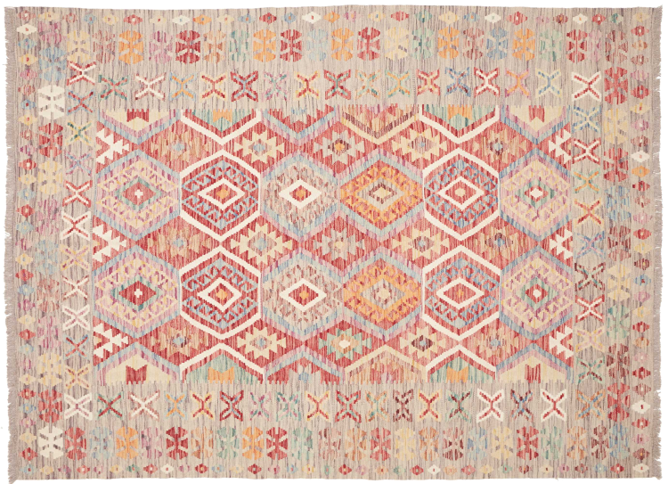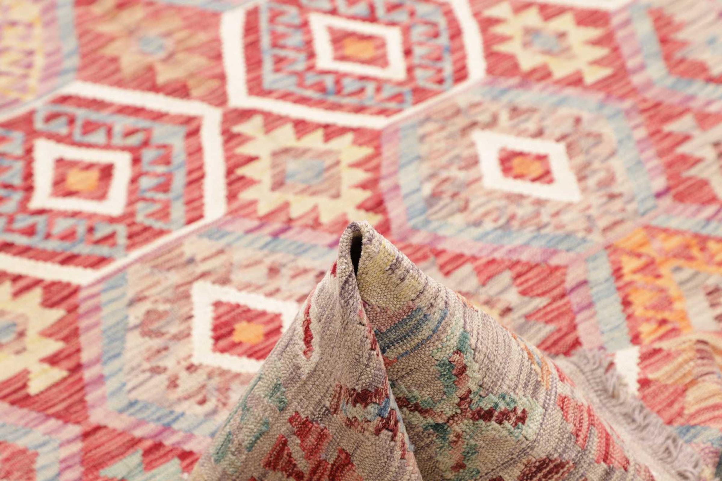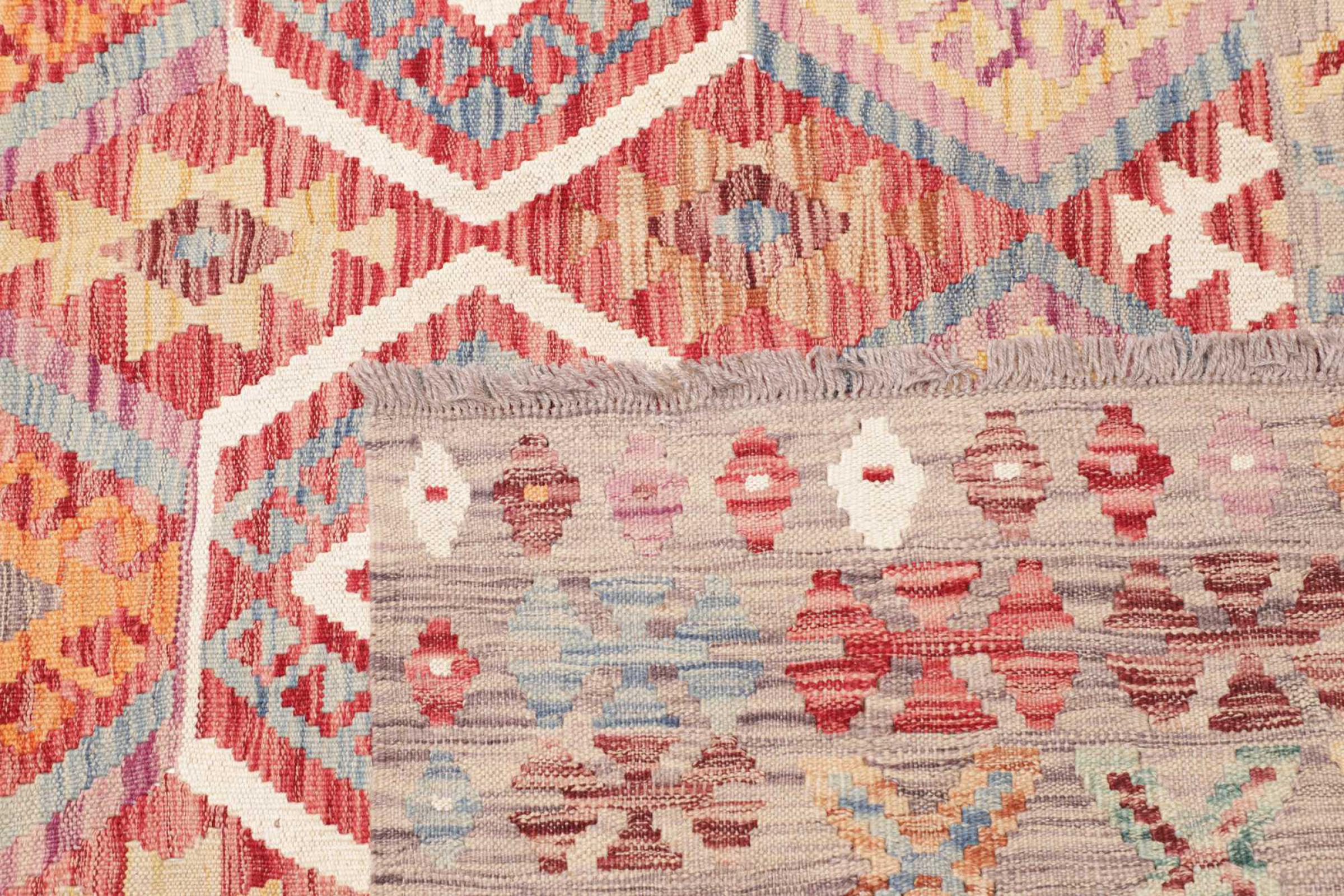 This rug was made as a flat weave by hand on a loom. Flatweave is the term used to describe rugs that have no pile. As the name promises, these rugs are woven and not knotted. This results in a flat rug with a structured surface. Flatweaves are not as soft and usually thinner than knotted rugs. At the same time they are much less complex to manufacture and can usually be laid out from both sides (front and back). Their patterns are usually geometric, which is determined by the fabric.