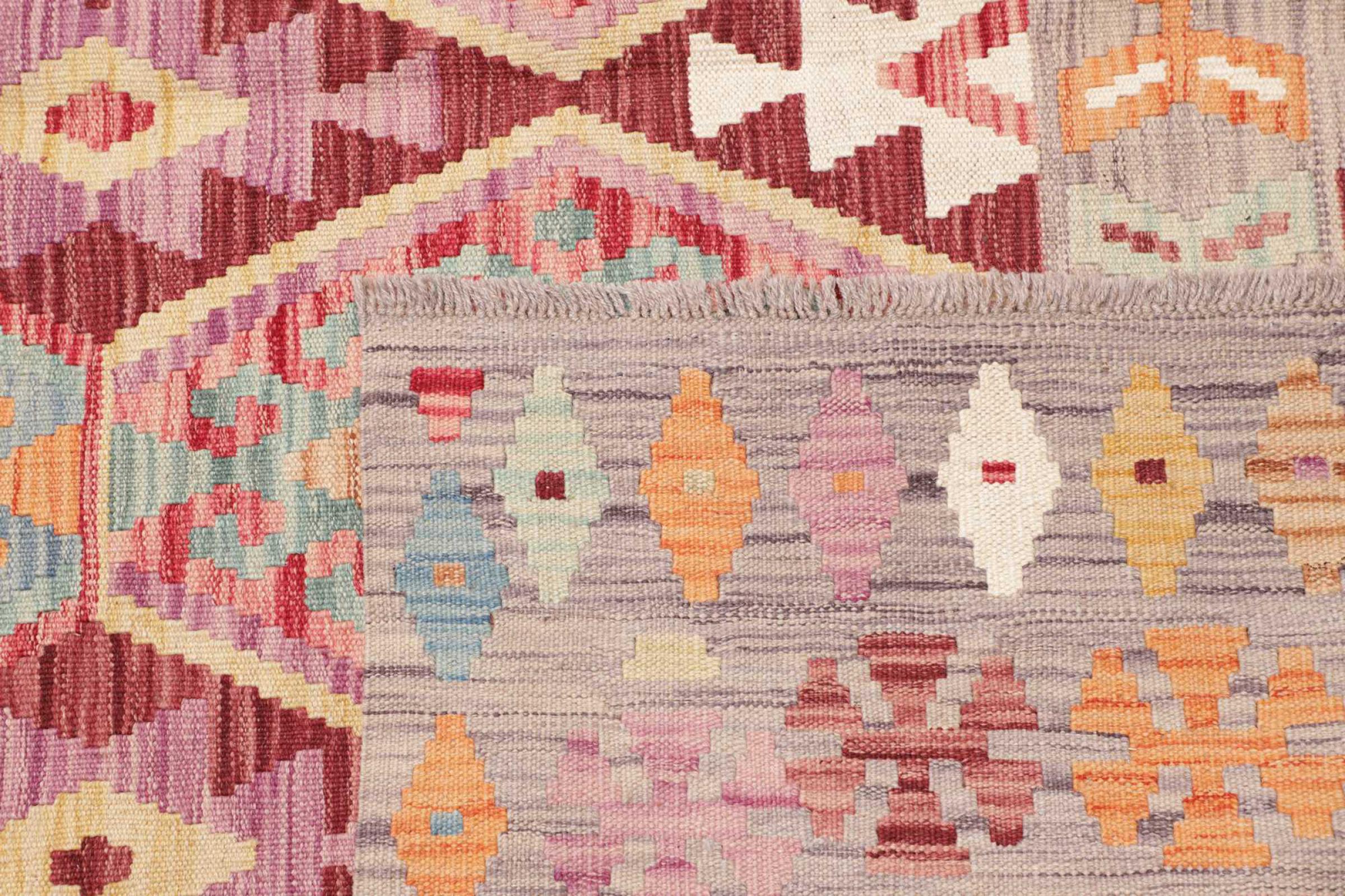 This rug was made as a flat weave by hand on a loom. Flatweave is the term used to describe rugs that have no pile. As the name promises, these rugs are woven and not knotted. This results in a flat rug with a structured surface. Flatweaves are not as soft and usually thinner than knotted rugs. At the same time they are much less complex to manufacture and can usually be laid out from both sides (front and back). Their patterns are usually geometric, which is determined by the fabric.