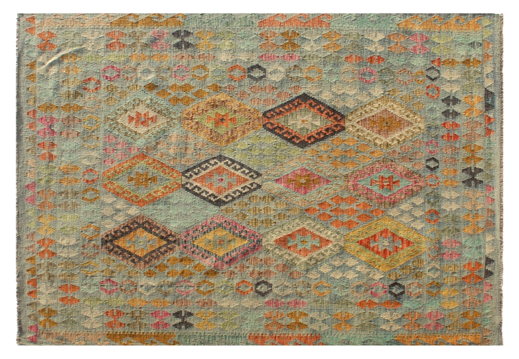This rug was made as a flat weave by hand on a loom. Flatweave is the term used to describe rugs that have no pile. As the name promises, these rugs are woven and not knotted. This results in a flat rug with a structured surface. Flatweaves are not as soft and usually thinner than knotted rugs. At the same time they are much less complex to manufacture and can usually be laid out from both sides (front and back). Their patterns are usually geometric, which is determined by the fabric.