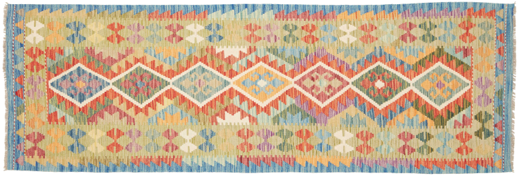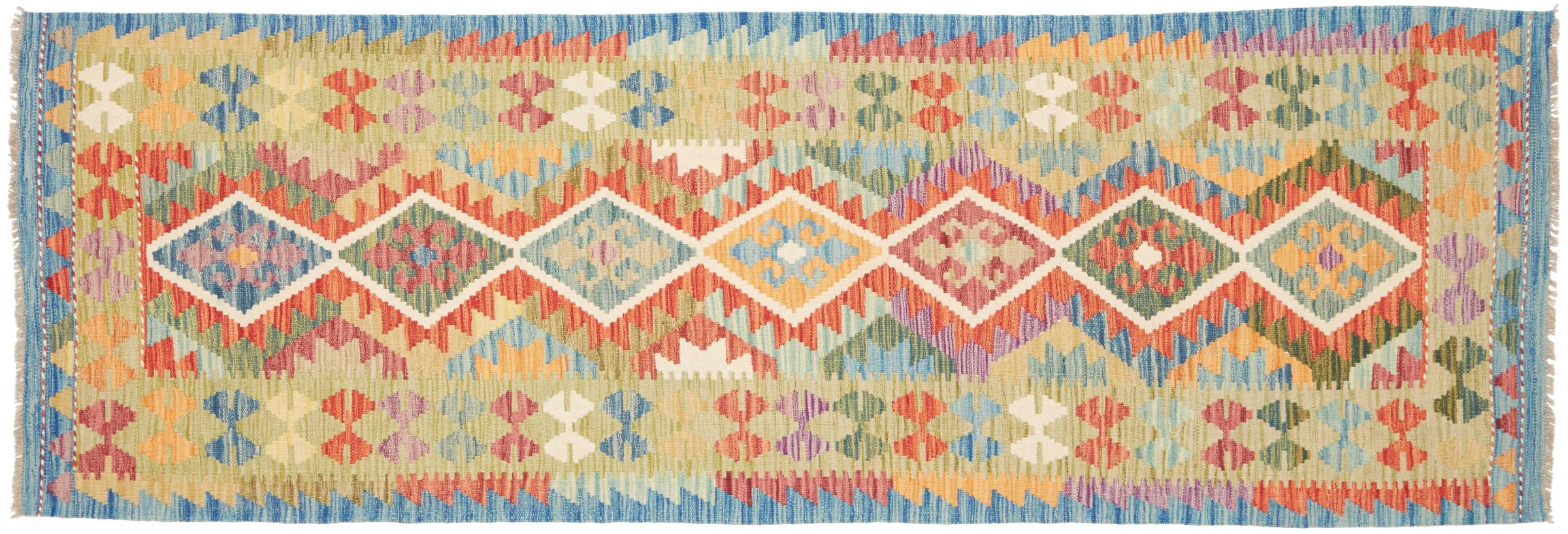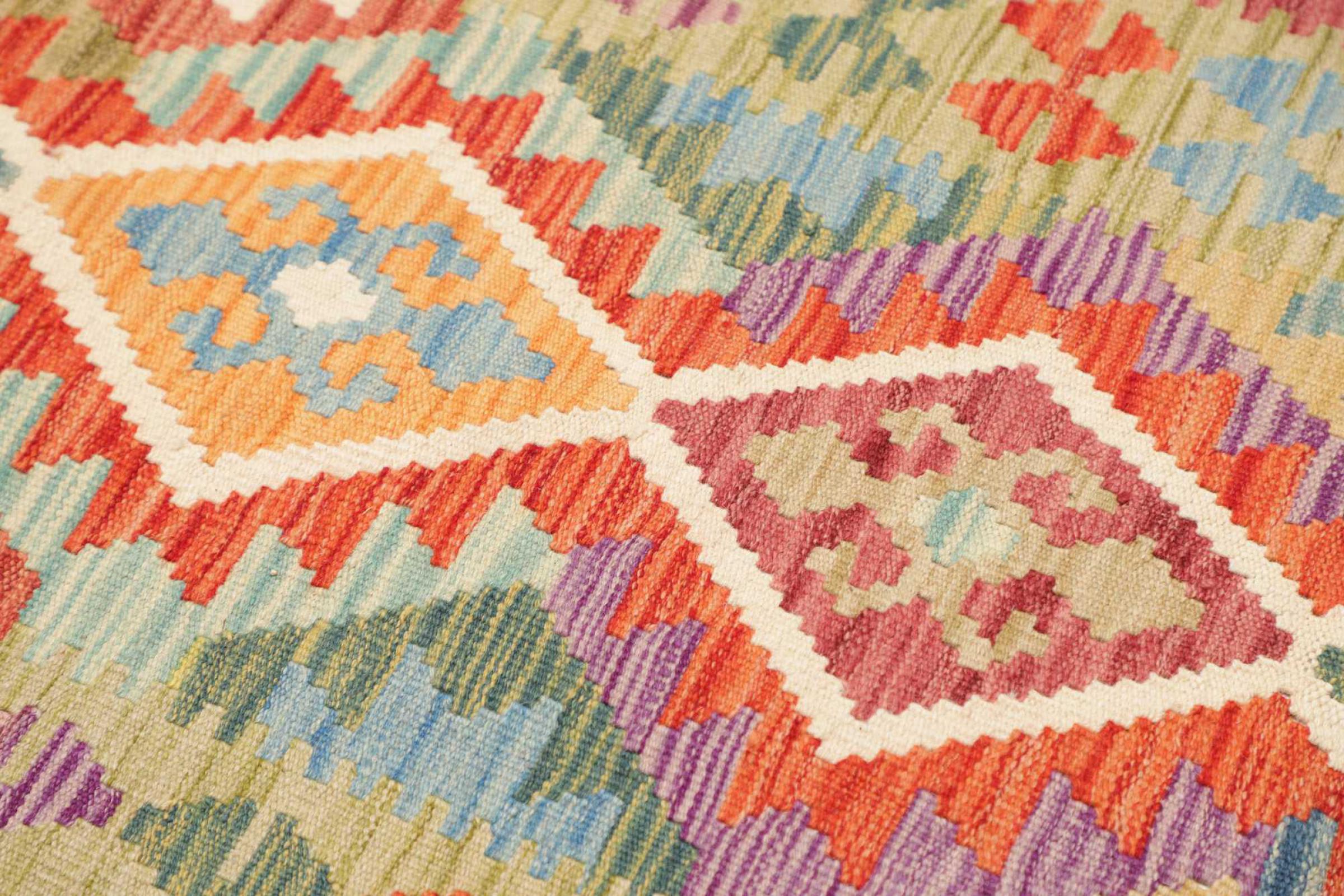 This handwoven Kilim Afghan is a wonderful and unique piece of art. Hard to believe that these modern colours and patterns have already been used centuries ago. This carpet has been woven by hand in old tradition in Afghanistan. It delivers a portion of contemporary history, which you won't find in this specific design a second time. It consists of high-grade natural wool and gives your home a personalised touch.