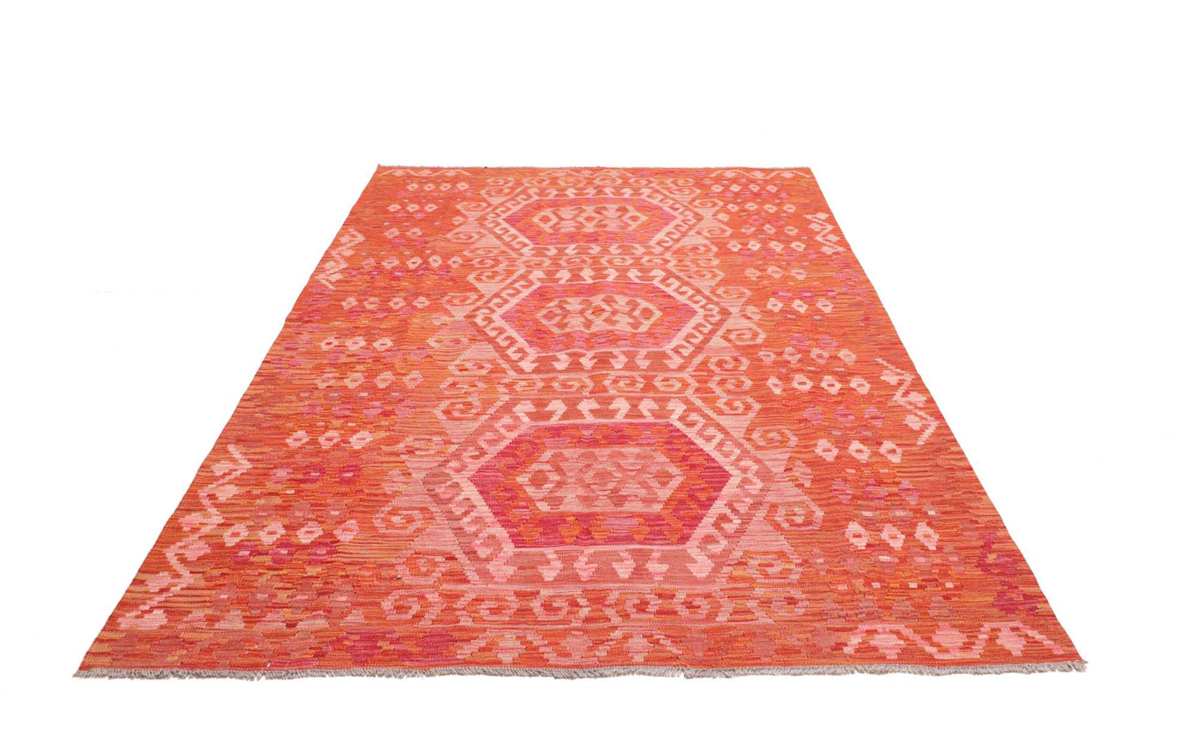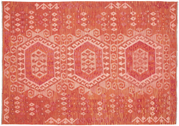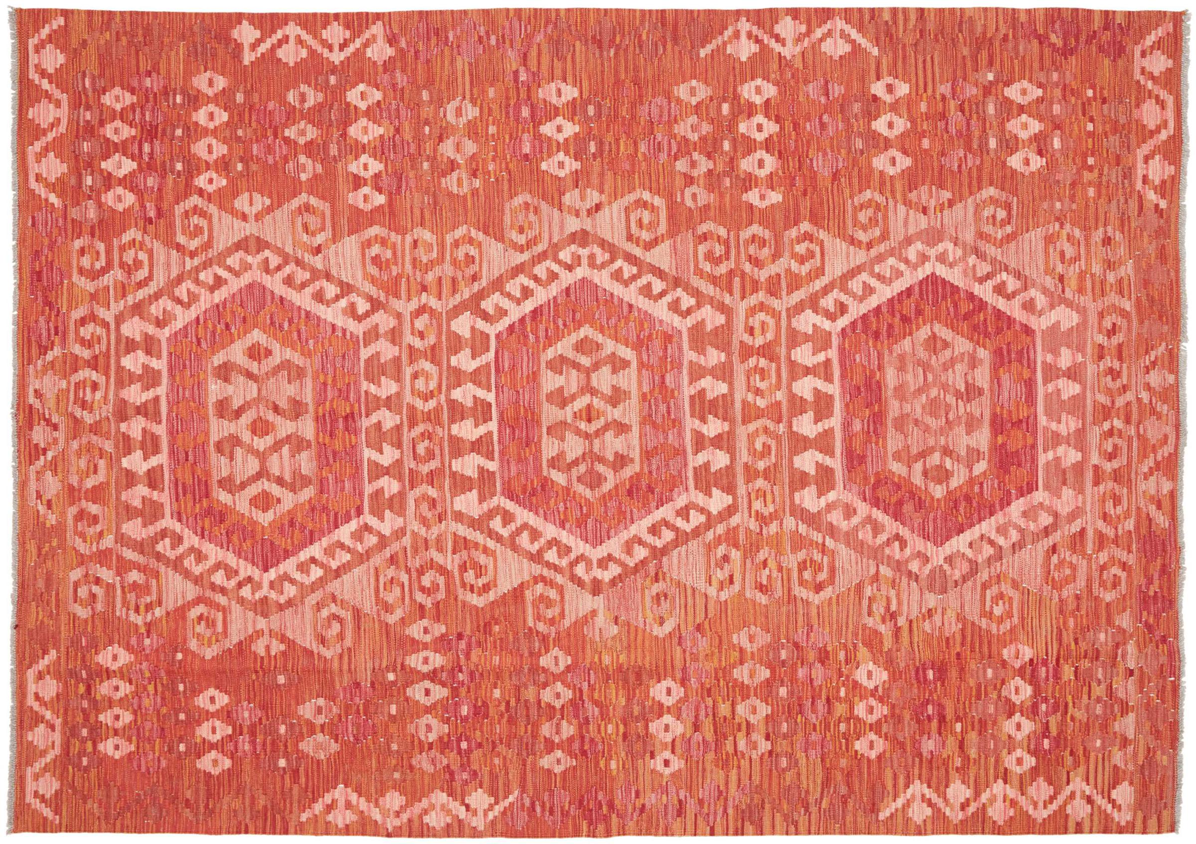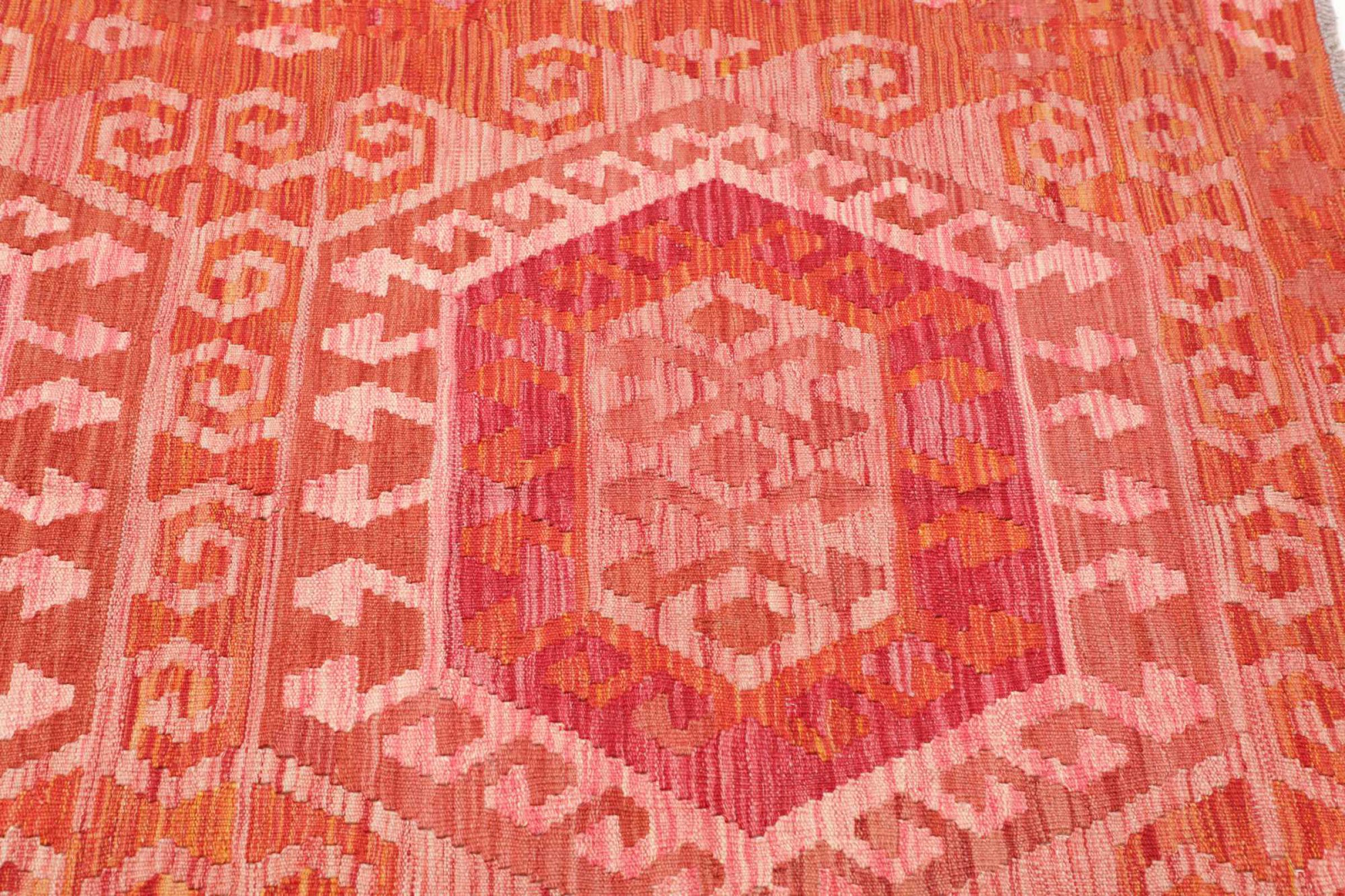 This rug was made as a flat weave by hand on a loom. Flatweave is the term used to describe rugs that have no pile. As the name promises, these rugs are woven and not knotted. This results in a flat rug with a structured surface. Flatweaves are not as soft and usually thinner than knotted rugs. At the same time they are much less complex to manufacture and can usually be laid out from both sides (front and back). Their patterns are usually geometric, which is determined by the fabric.
