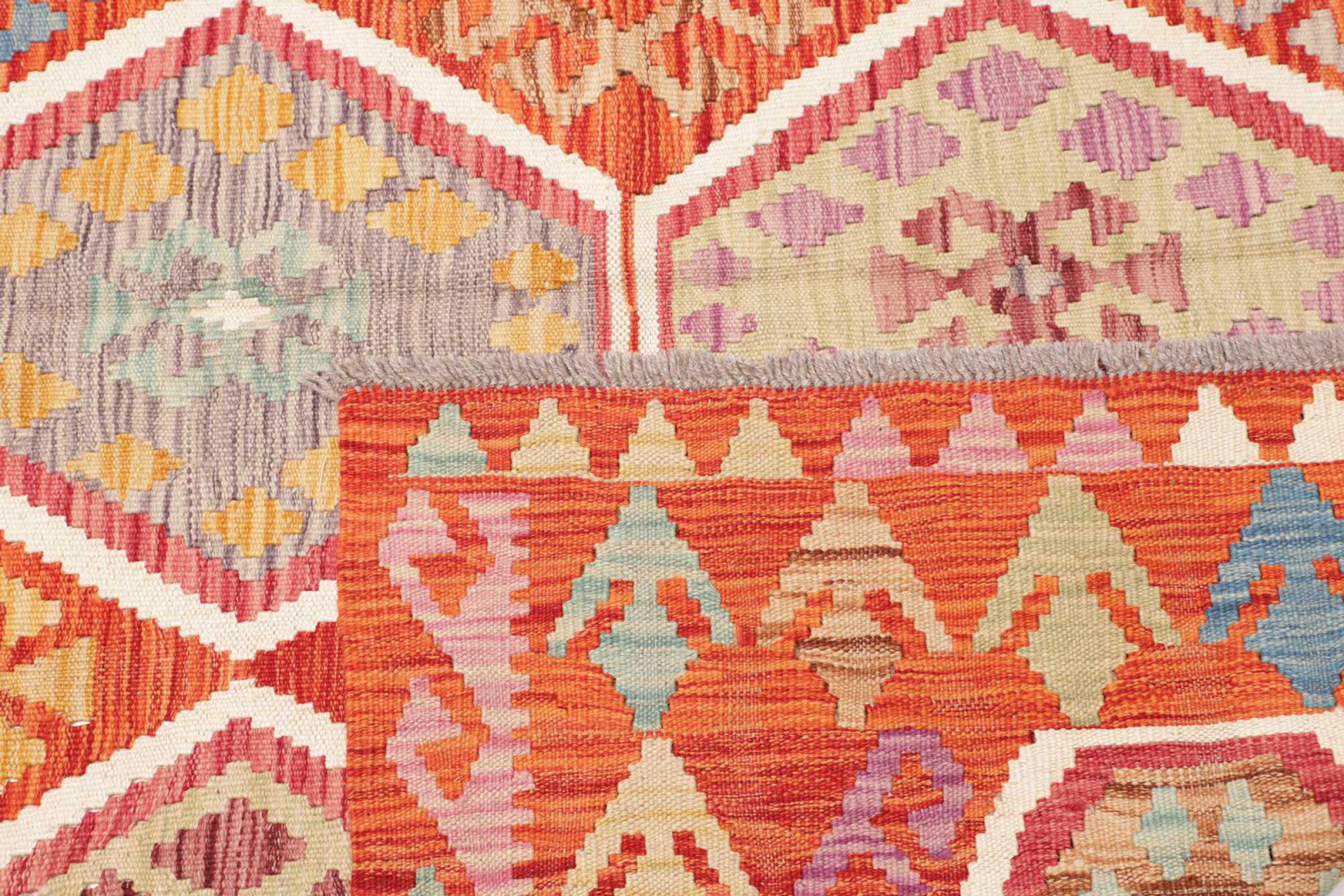 This rug was made as a flat weave by hand on a loom. Flatweave is the term used to describe rugs that have no pile. As the name promises, these rugs are woven and not knotted. This results in a flat rug with a structured surface. Flatweaves are not as soft and usually thinner than knotted rugs. At the same time they are much less complex to manufacture and can usually be laid out from both sides (front and back). Their patterns are usually geometric, which is determined by the fabric.