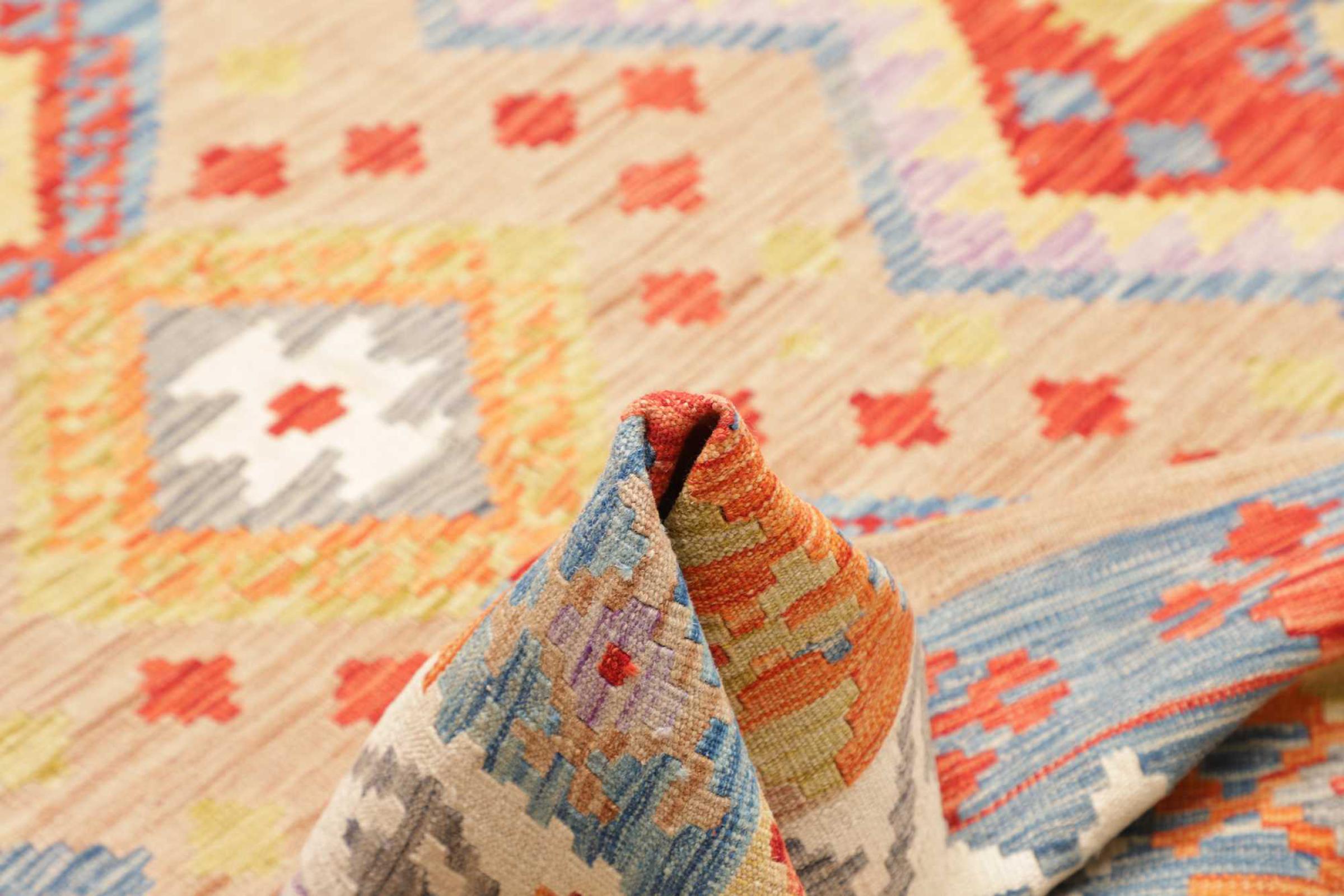 This rug was made as a flat weave by hand on a loom. Flatweave is the term used to describe rugs that have no pile. As the name promises, these rugs are woven and not knotted. This results in a flat rug with a structured surface. Flatweaves are not as soft and usually thinner than knotted rugs. At the same time they are much less complex to manufacture and can usually be laid out from both sides (front and back). Their patterns are usually geometric, which is determined by the fabric.