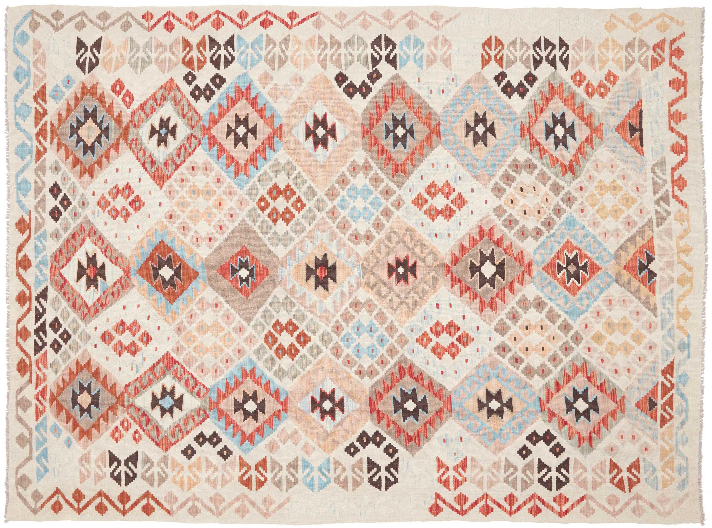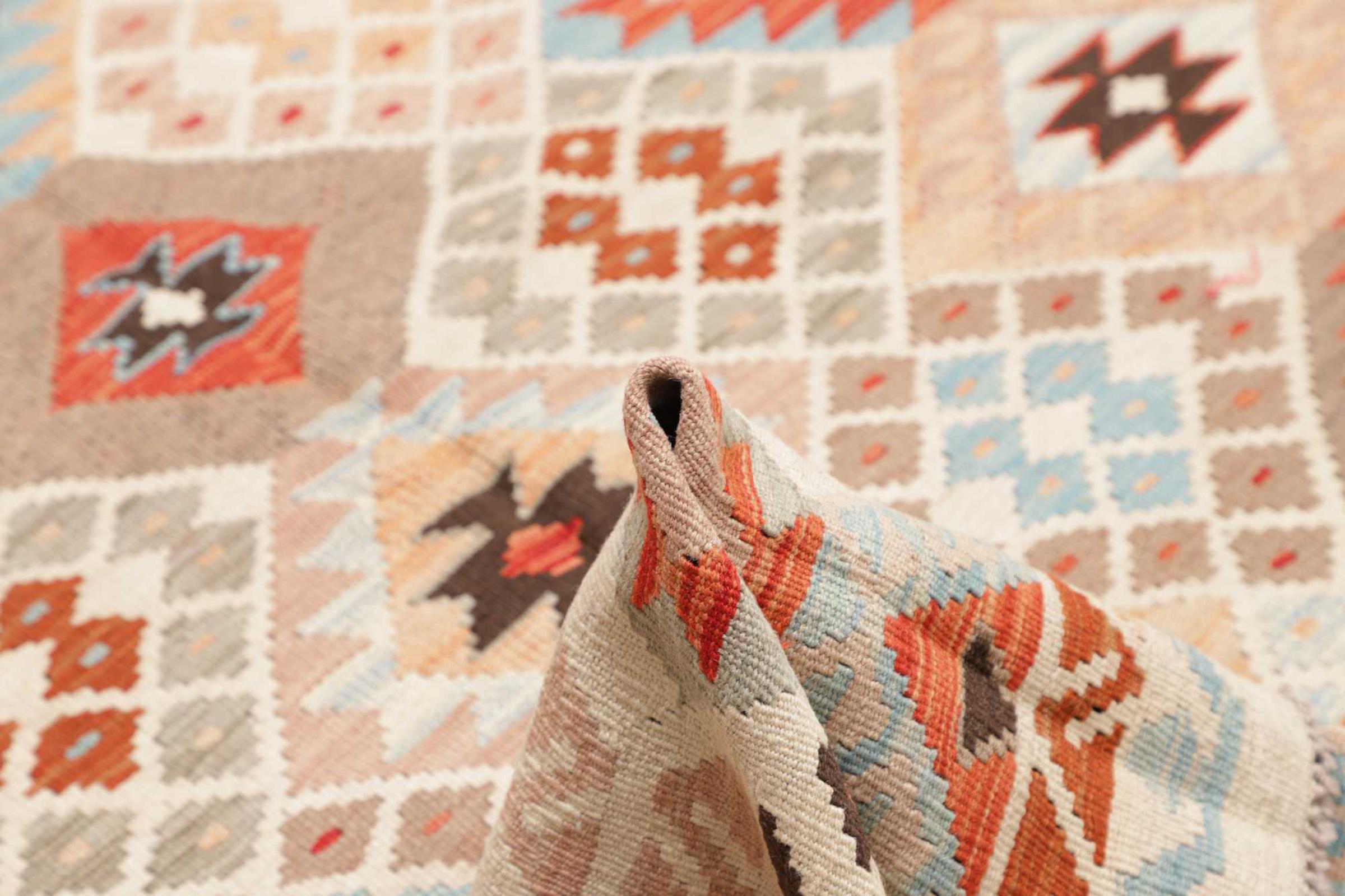 This rug was made as a flat weave by hand on a loom. Flatweave is the term used to describe rugs that have no pile. As the name promises, these rugs are woven and not knotted. This results in a flat rug with a structured surface. Flatweaves are not as soft and usually thinner than knotted rugs. At the same time they are much less complex to manufacture and can usually be laid out from both sides (front and back). Their patterns are usually geometric, which is determined by the fabric.