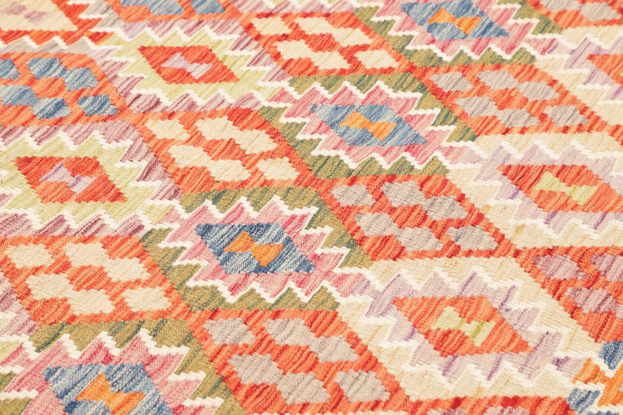This rug was made as a flat weave by hand on a loom. Flatweave is the term used to describe rugs that have no pile. As the name promises, these rugs are woven and not knotted. This results in a flat rug with a structured surface. Flatweaves are not as soft and usually thinner than knotted rugs. At the same time they are much less complex to manufacture and can usually be laid out from both sides (front and back). Their patterns are usually geometric, which is determined by the fabric.