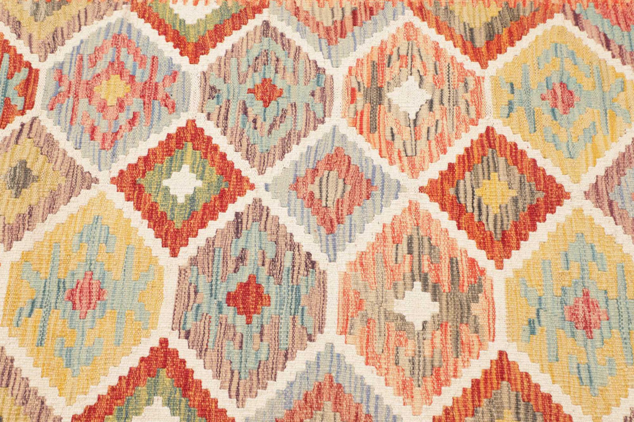 This rug was made as a flat weave by hand on a loom. Flatweave is the term used to describe rugs that have no pile. As the name promises, these rugs are woven and not knotted. This results in a flat rug with a structured surface. Flatweaves are not as soft and usually thinner than knotted rugs. At the same time they are much less complex to manufacture and can usually be laid out from both sides (front and back). Their patterns are usually geometric, which is determined by the fabric.