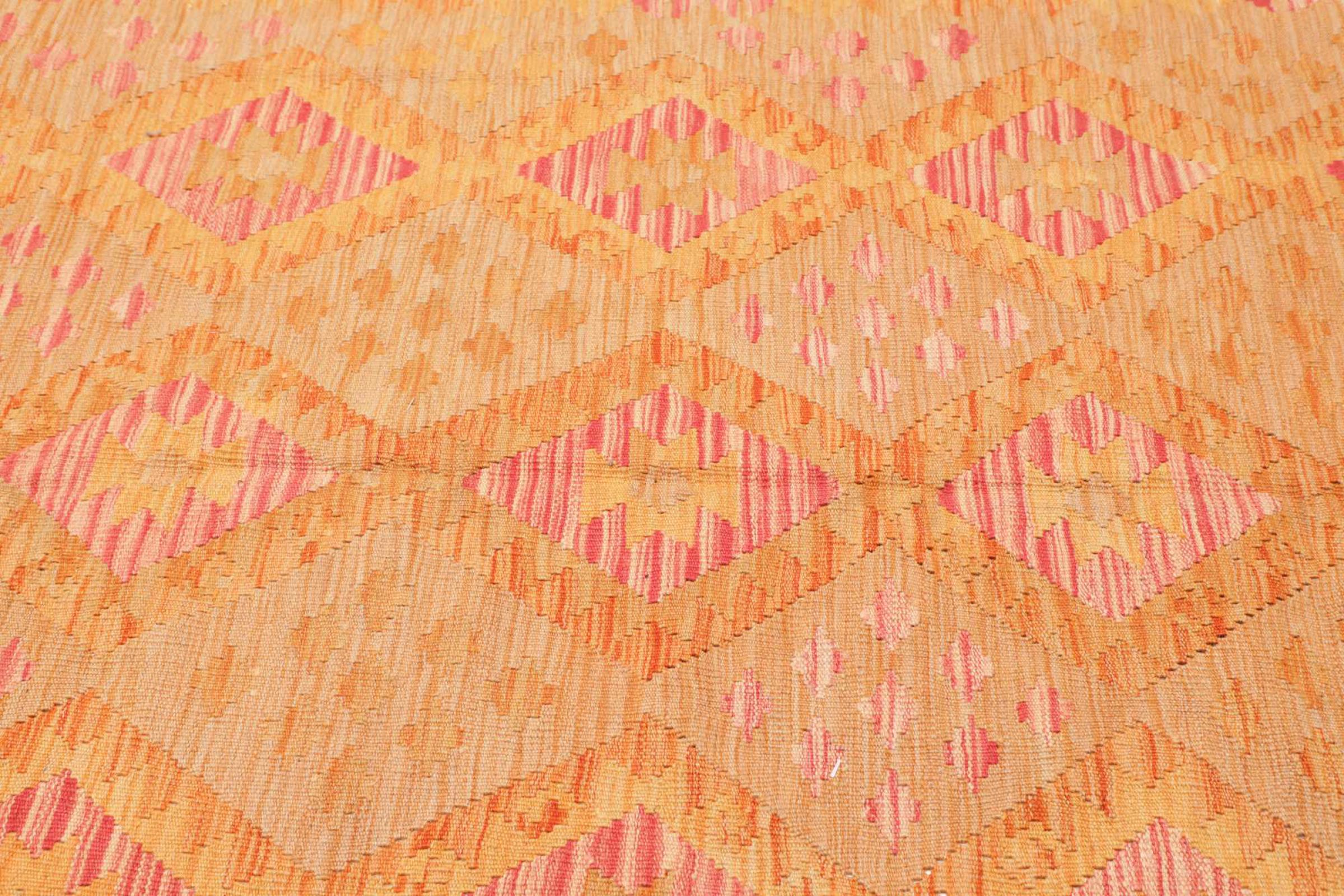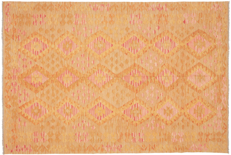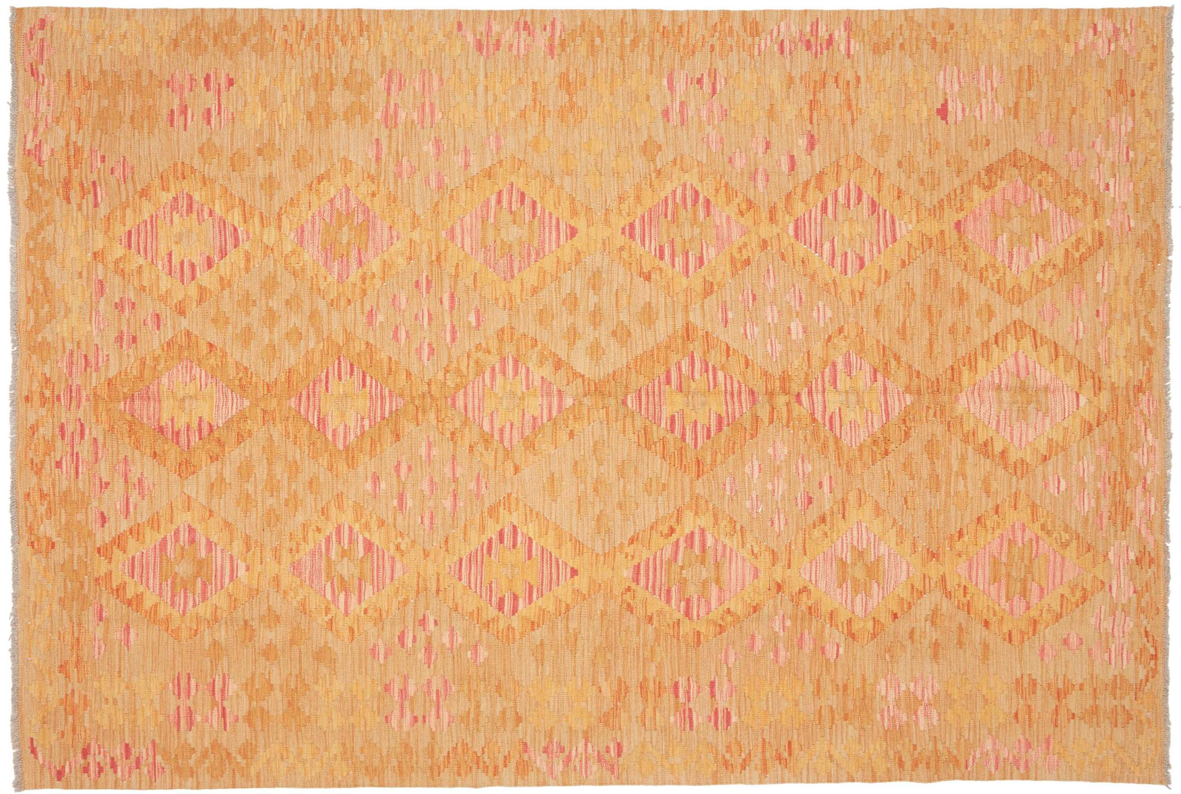 This rug was made as a flat weave by hand on a loom. Flatweave is the term used to describe rugs that have no pile. As the name promises, these rugs are woven and not knotted. This results in a flat rug with a structured surface. Flatweaves are not as soft and usually thinner than knotted rugs. At the same time they are much less complex to manufacture and can usually be laid out from both sides (front and back). Their patterns are usually geometric, which is determined by the fabric.