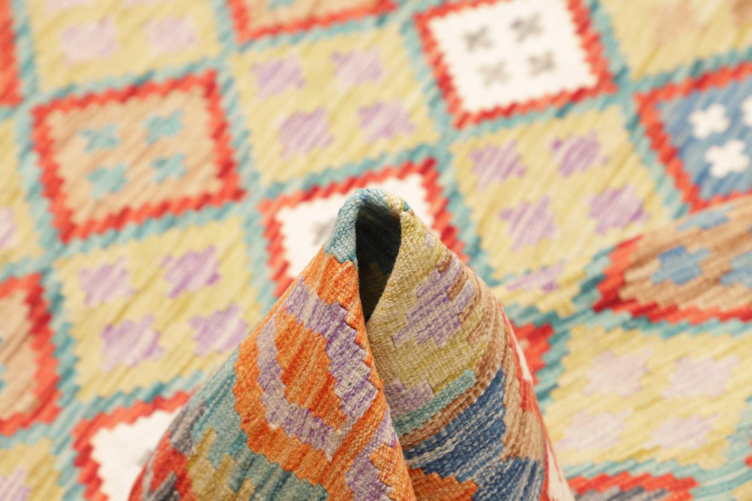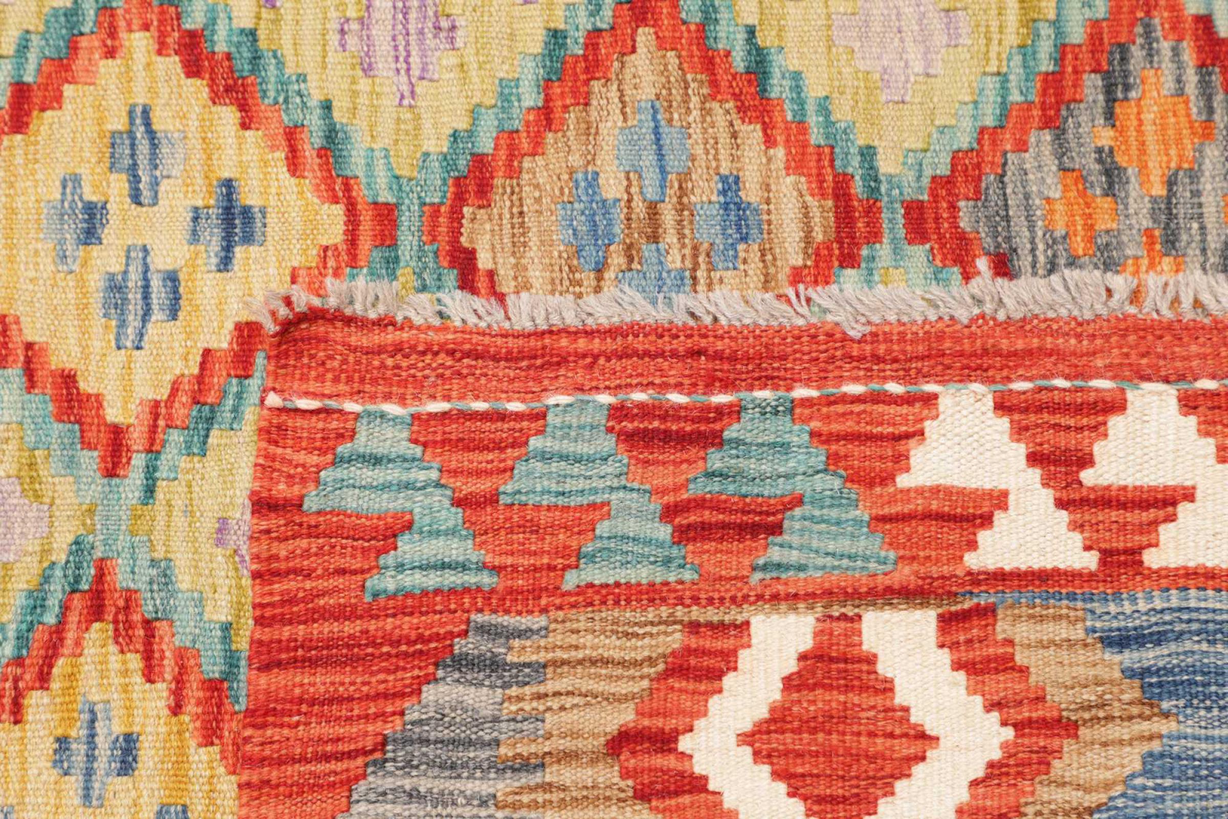 This rug was made as a flat weave by hand on a loom. Flatweave is the term used to describe rugs that have no pile. As the name promises, these rugs are woven and not knotted. This results in a flat rug with a structured surface. Flatweaves are not as soft and usually thinner than knotted rugs. At the same time they are much less complex to manufacture and can usually be laid out from both sides (front and back). Their patterns are usually geometric, which is determined by the fabric.