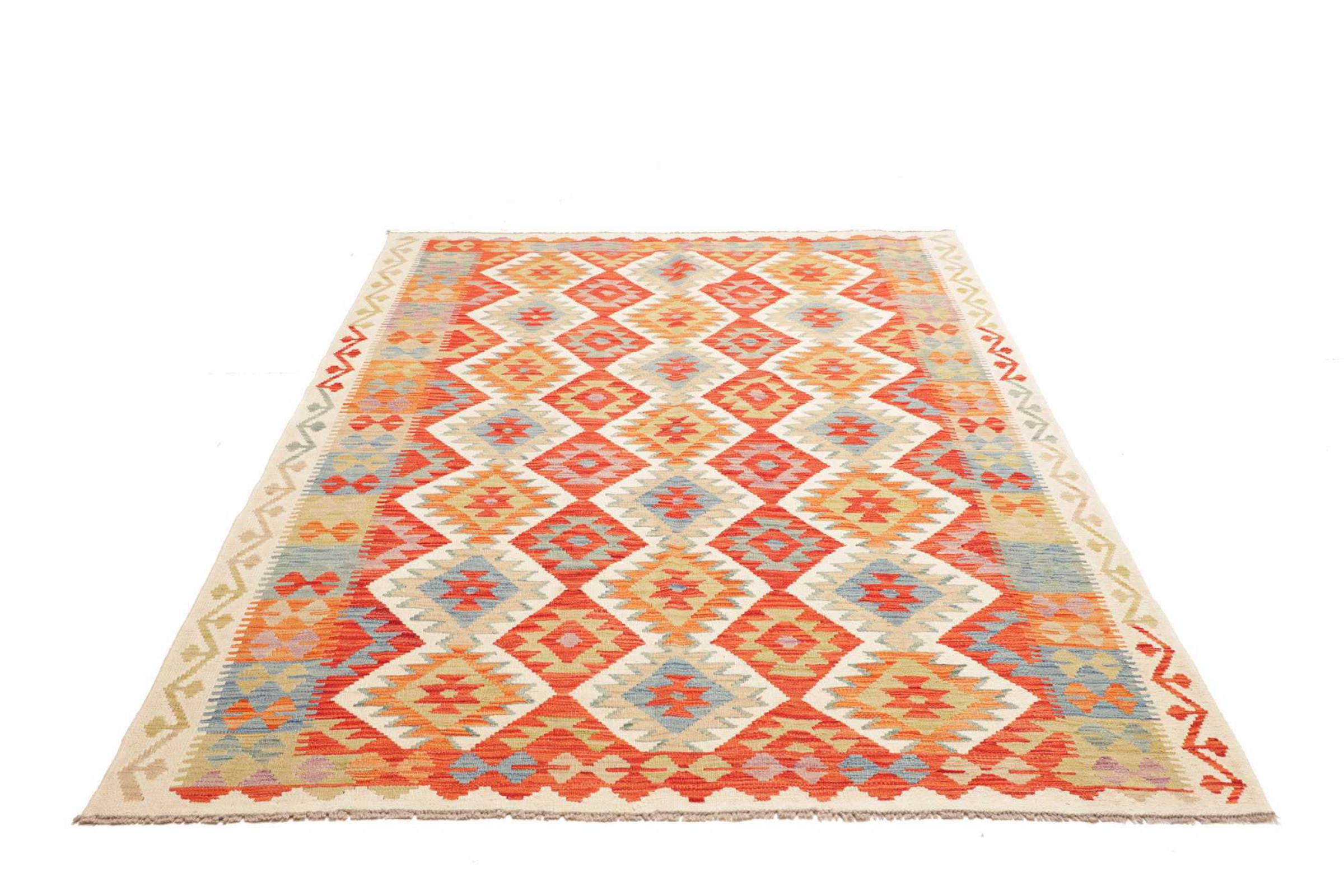This rug was made as a flat weave by hand on a loom. Flatweave is the term used to describe rugs that have no pile. As the name promises, these rugs are woven and not knotted. This results in a flat rug with a structured surface. Flatweaves are not as soft and usually thinner than knotted rugs. At the same time they are much less complex to manufacture and can usually be laid out from both sides (front and back). Their patterns are usually geometric, which is determined by the fabric.